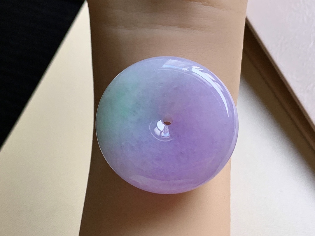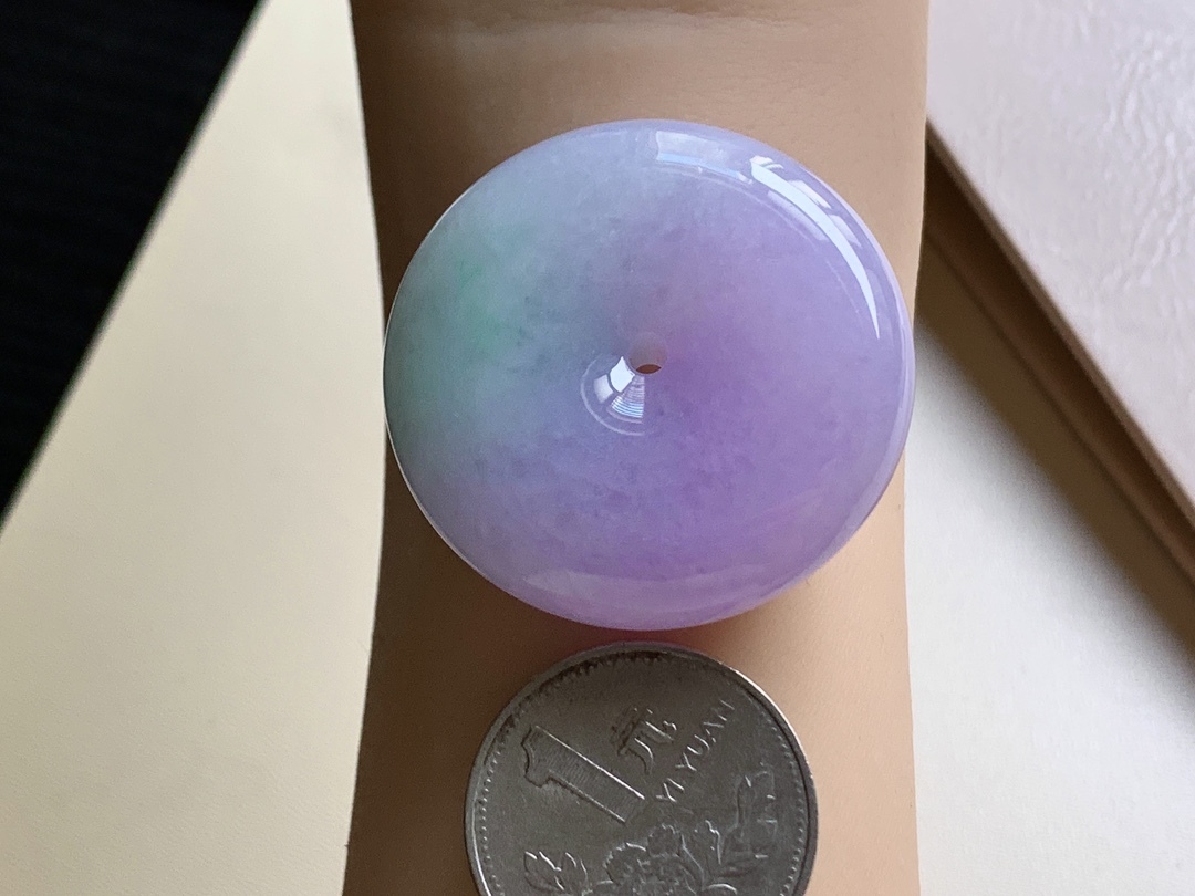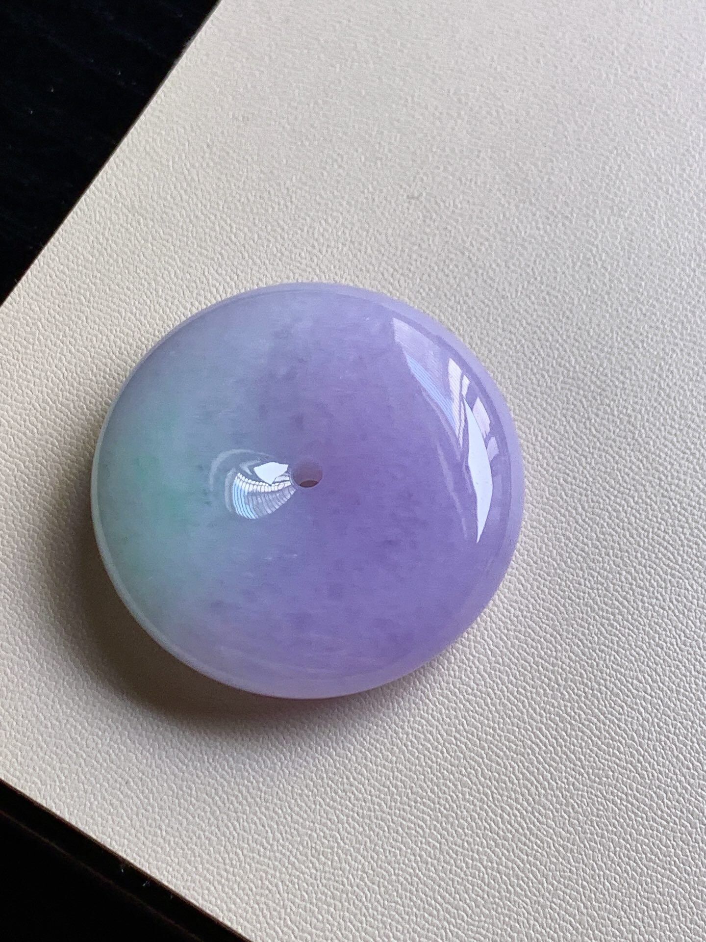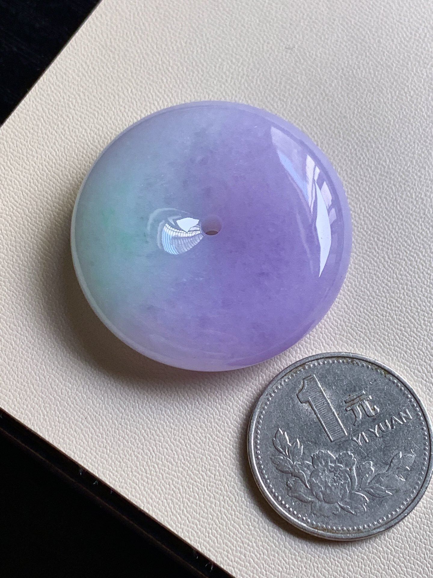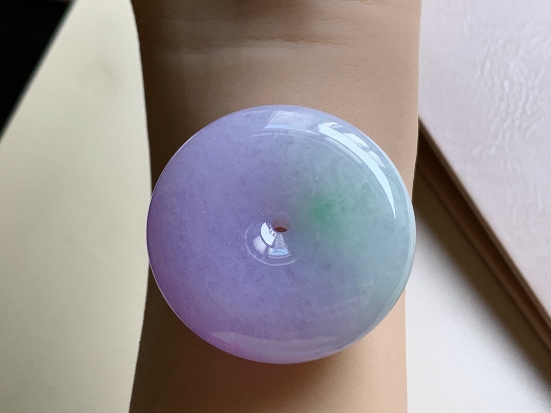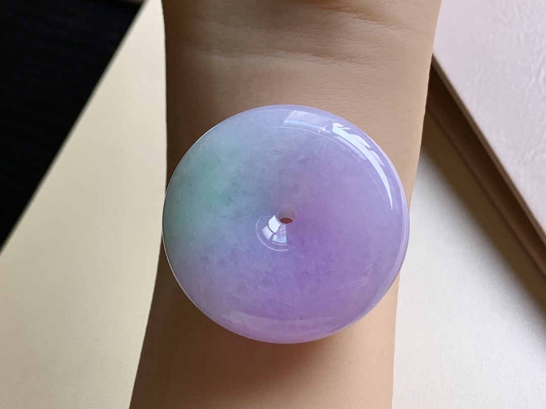 天然翡翠A玉,色澤十分漂亮,紫綠相間,討喜極了,厚實大氣,完美。