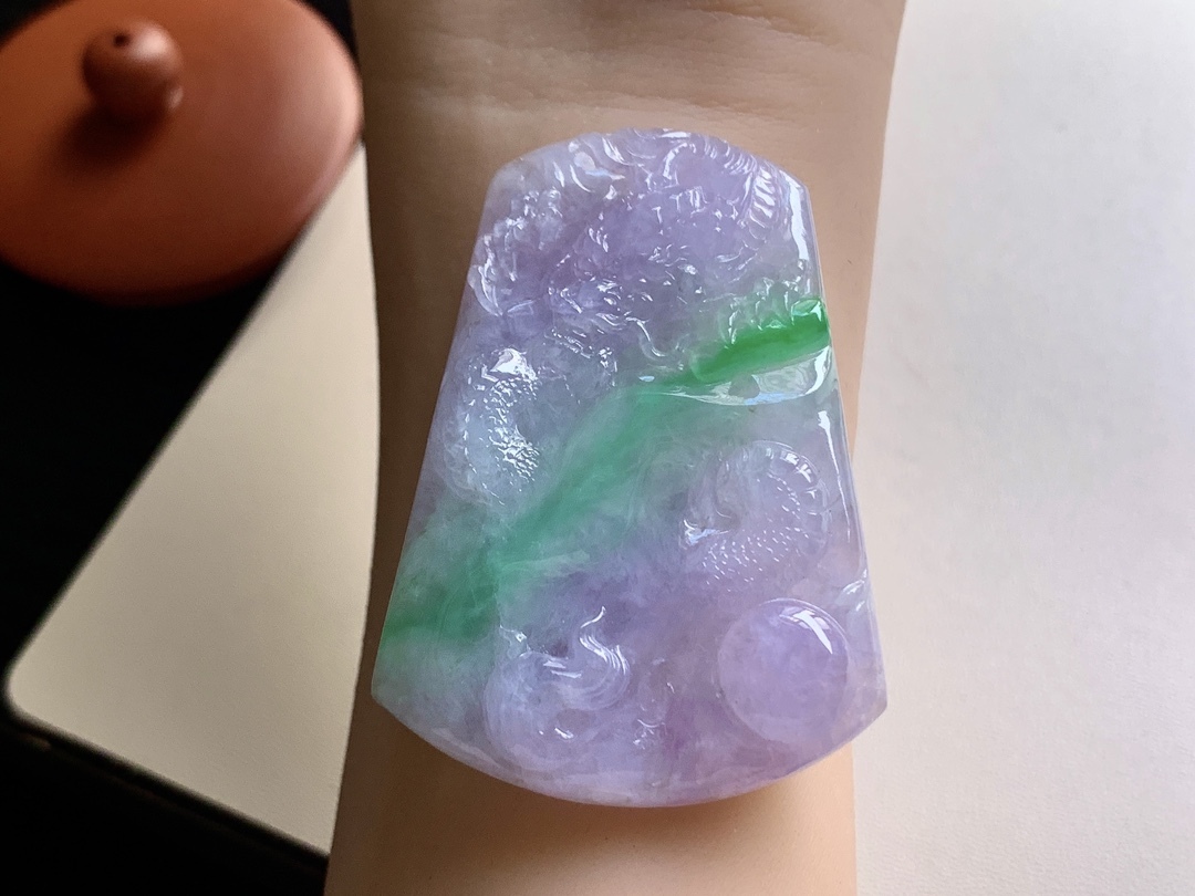 天然翡翠A玉,紫色濃郁迷人,一抹綠色青翠奪目,工藝精湛霸氣無比,完美。