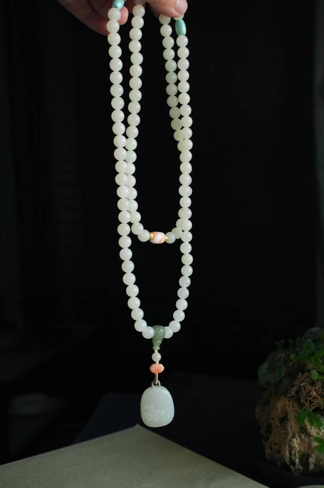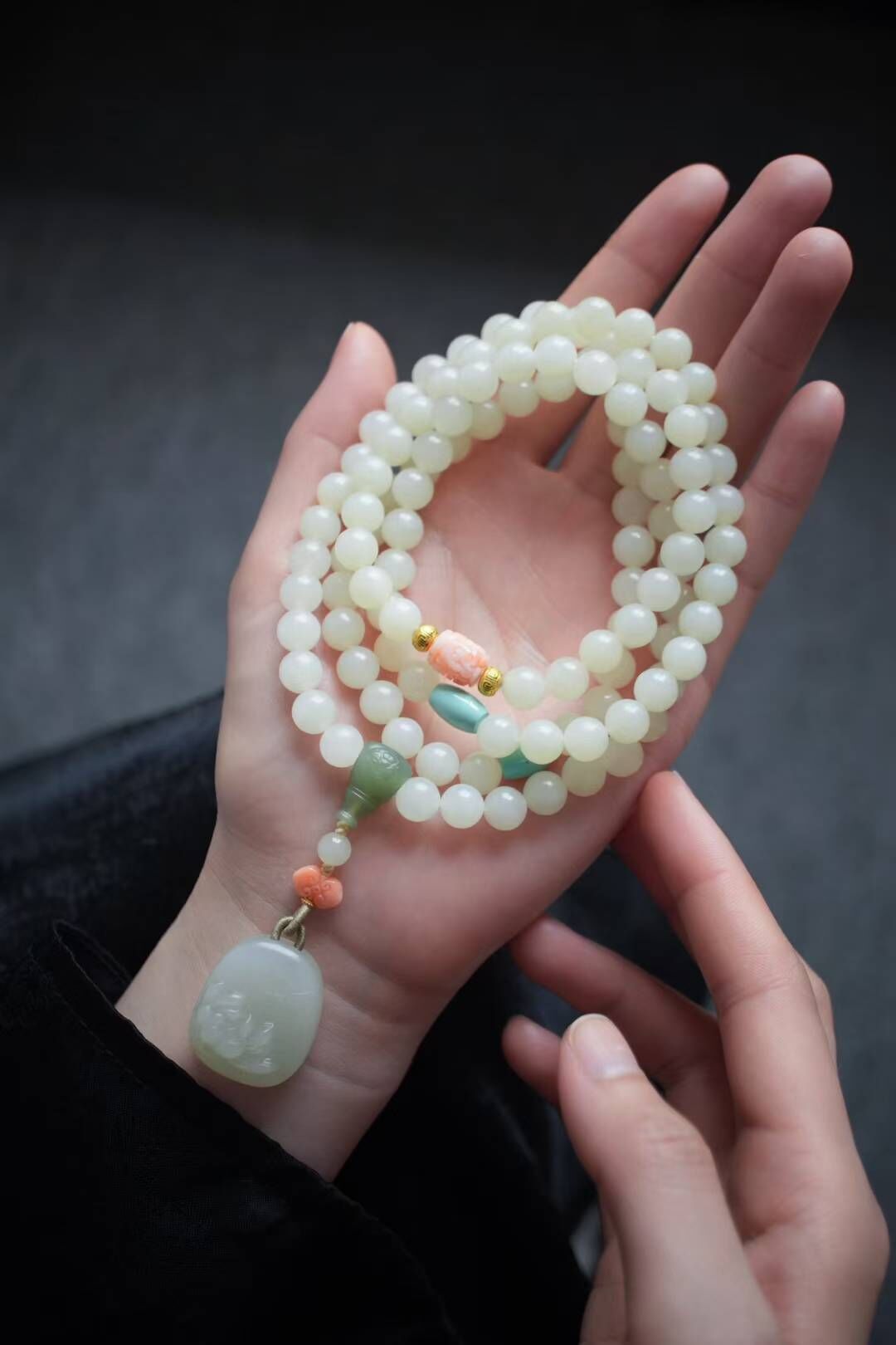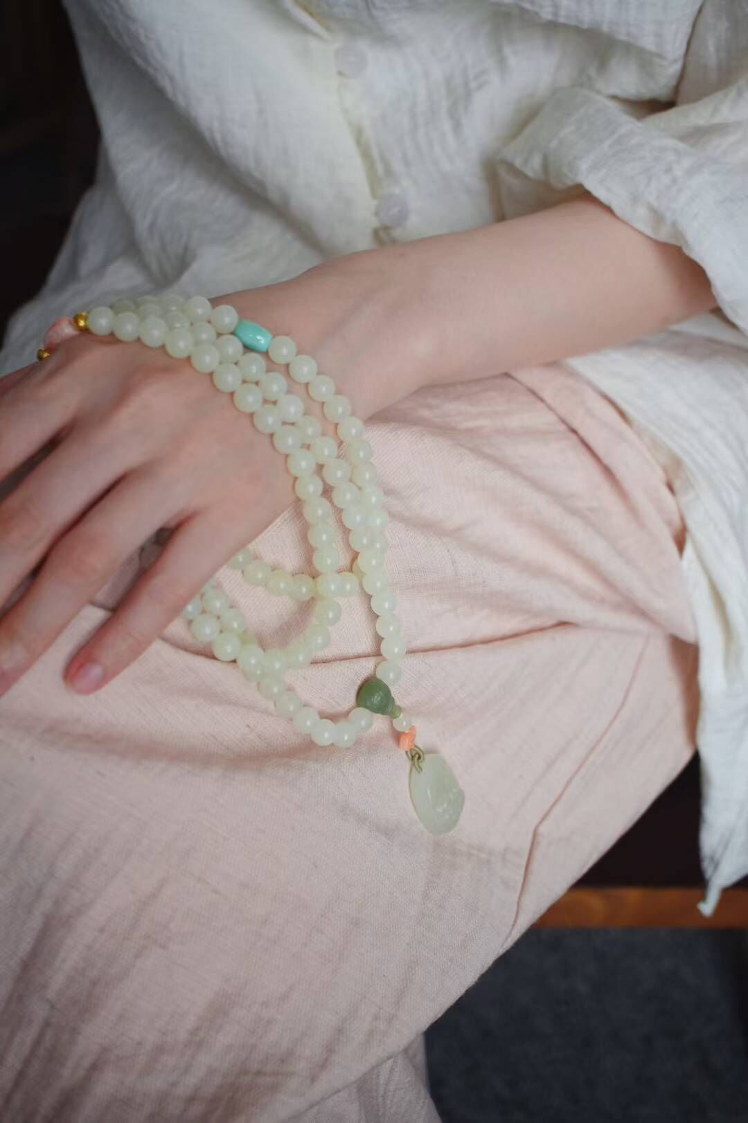 108顆在佛家領域寓意祛除108屆煩惱,同時也寄託著祥瑞圓滿的美好期待獨家原創設計,搭配momo珊瑚手工精雕桶珠(尺寸約 10×8mm)999足金回紋珠,原礦綠松石棗珠(約 10.5x8mm)做腰珠,和田玉三通