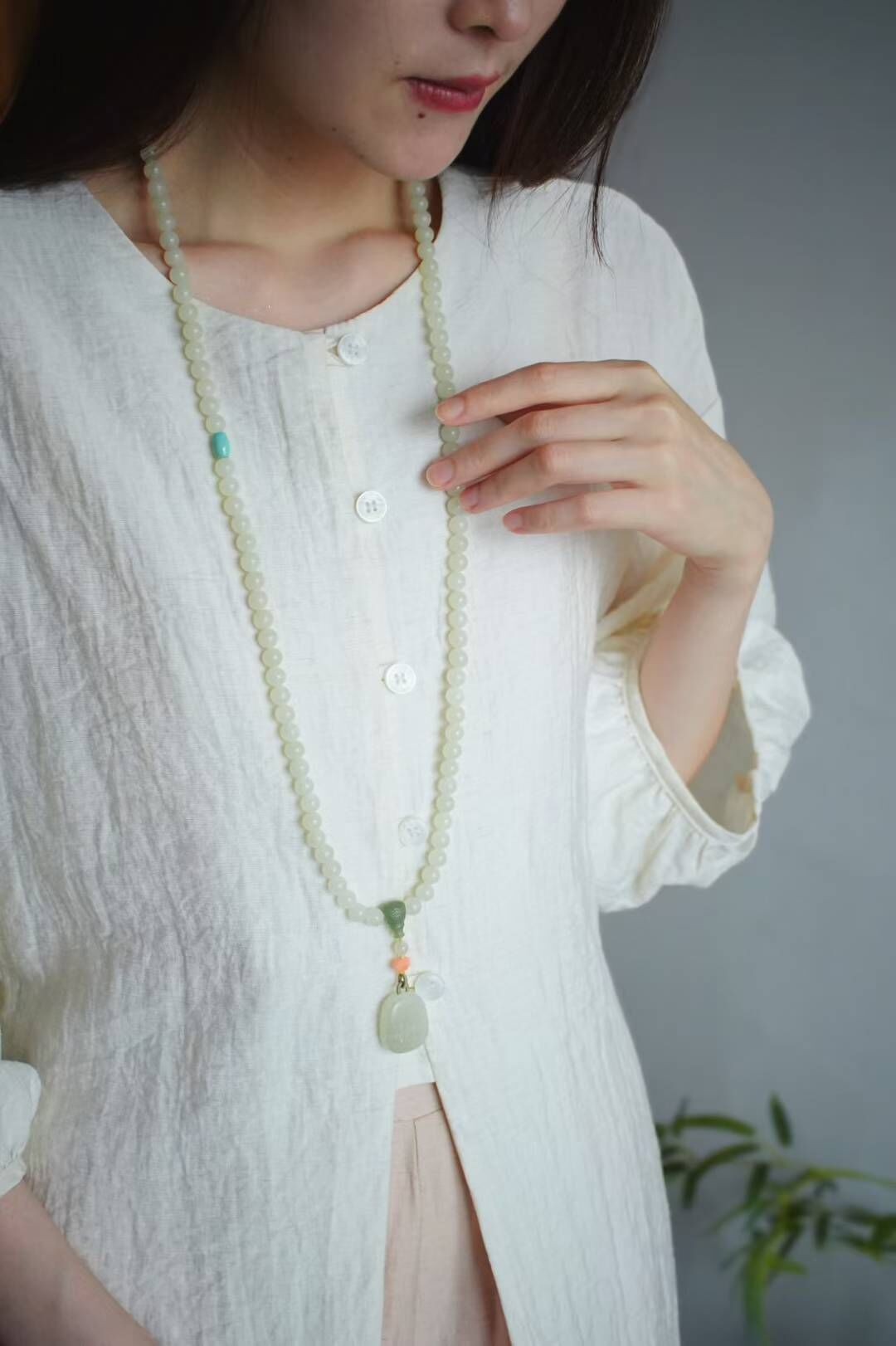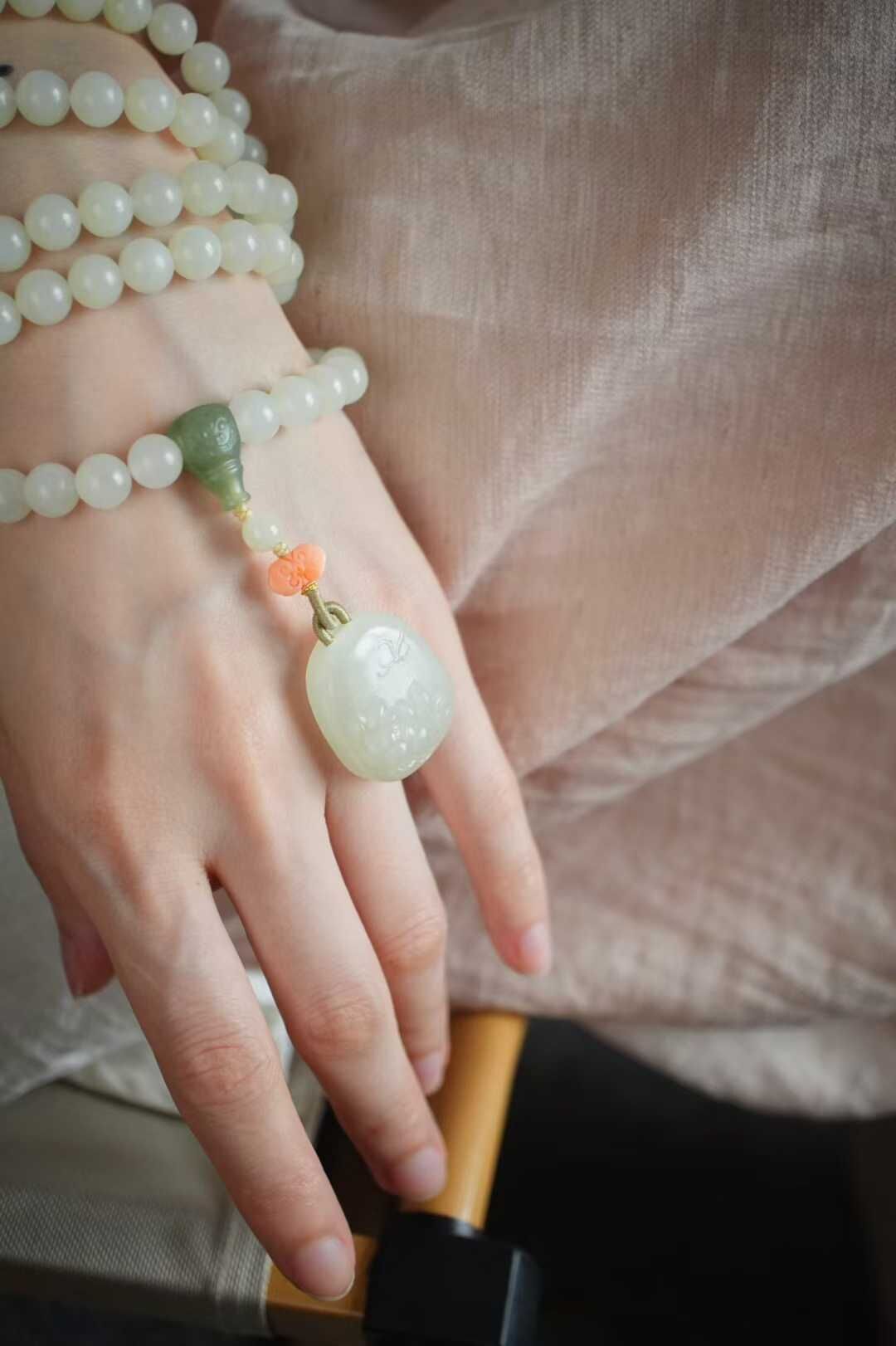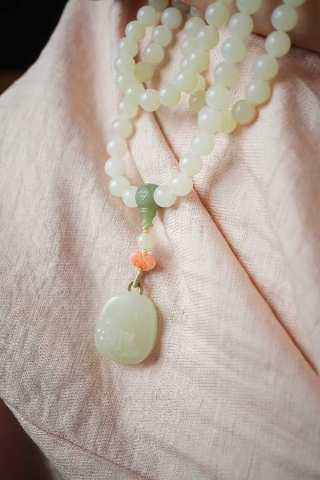 108顆在佛家領域寓意祛除108屆煩惱,同時也寄託著祥瑞圓滿的美好期待獨家原創設計,搭配momo珊瑚手工精雕桶珠(尺寸約 10×8mm)999足金回紋珠,原礦綠松石棗珠(約 10.5x8mm)做腰珠,和田玉三通