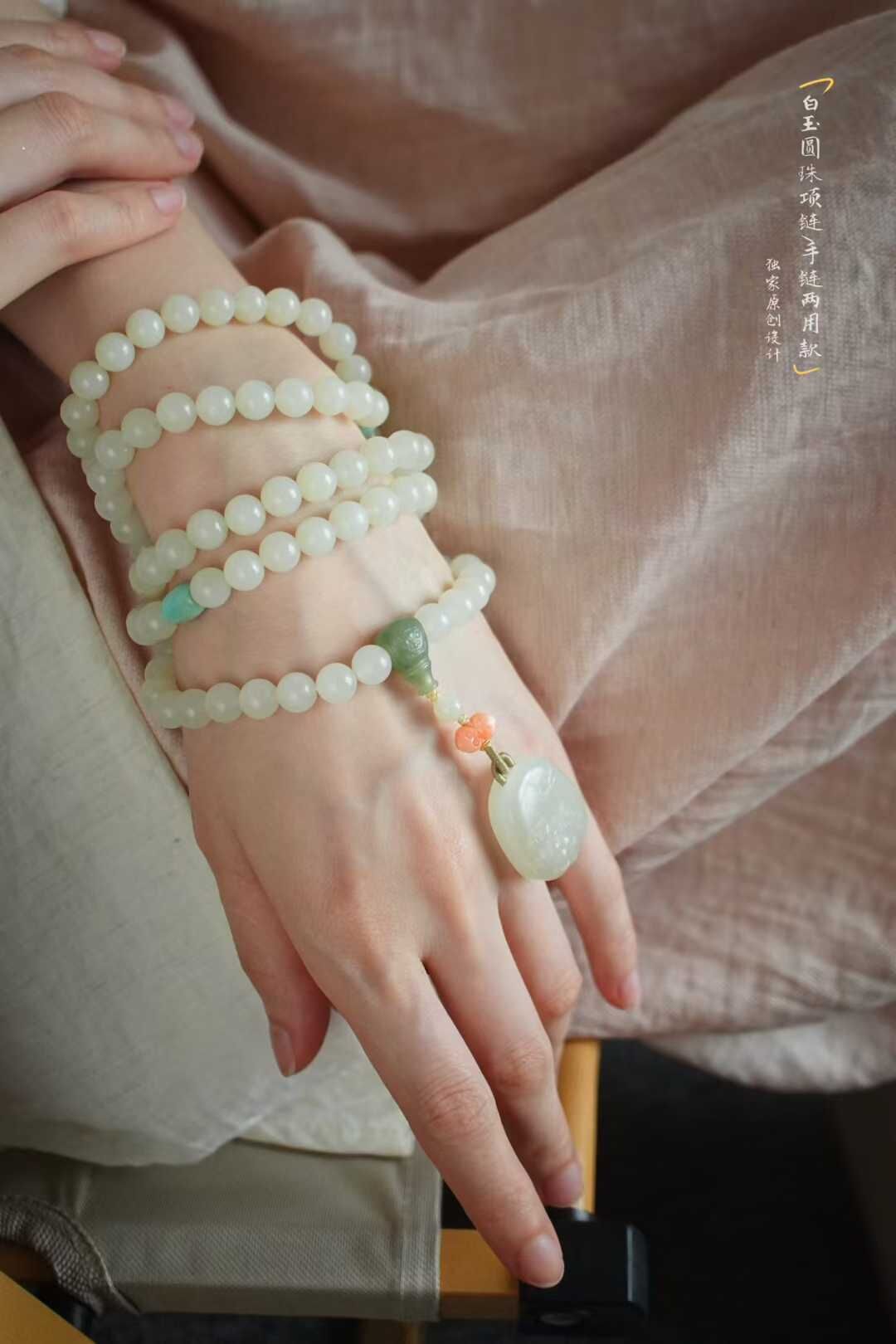 新疆米達料999足金108手鏈/項鏈兩用款,新疆米達料特有的暖白色,料子凝實,玉質極其細膩油潤,油性十足,顆顆宛若湯圓小丸子般討喜,肉眼近乎無棉無水線,無雜無裂完美品相,整體配色清新雅緻,暖色調的溫柔感撲面而來