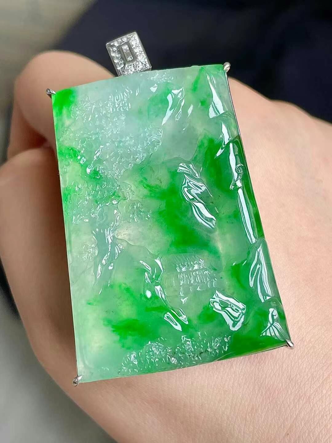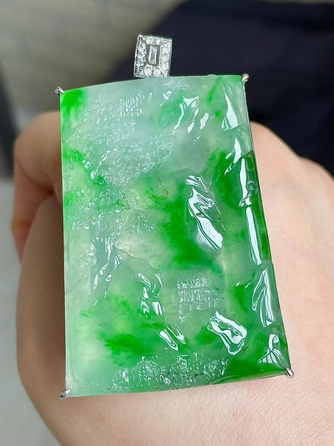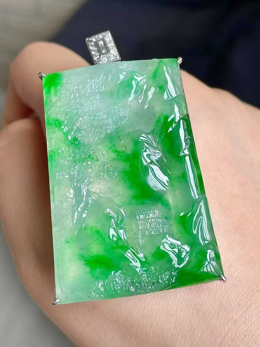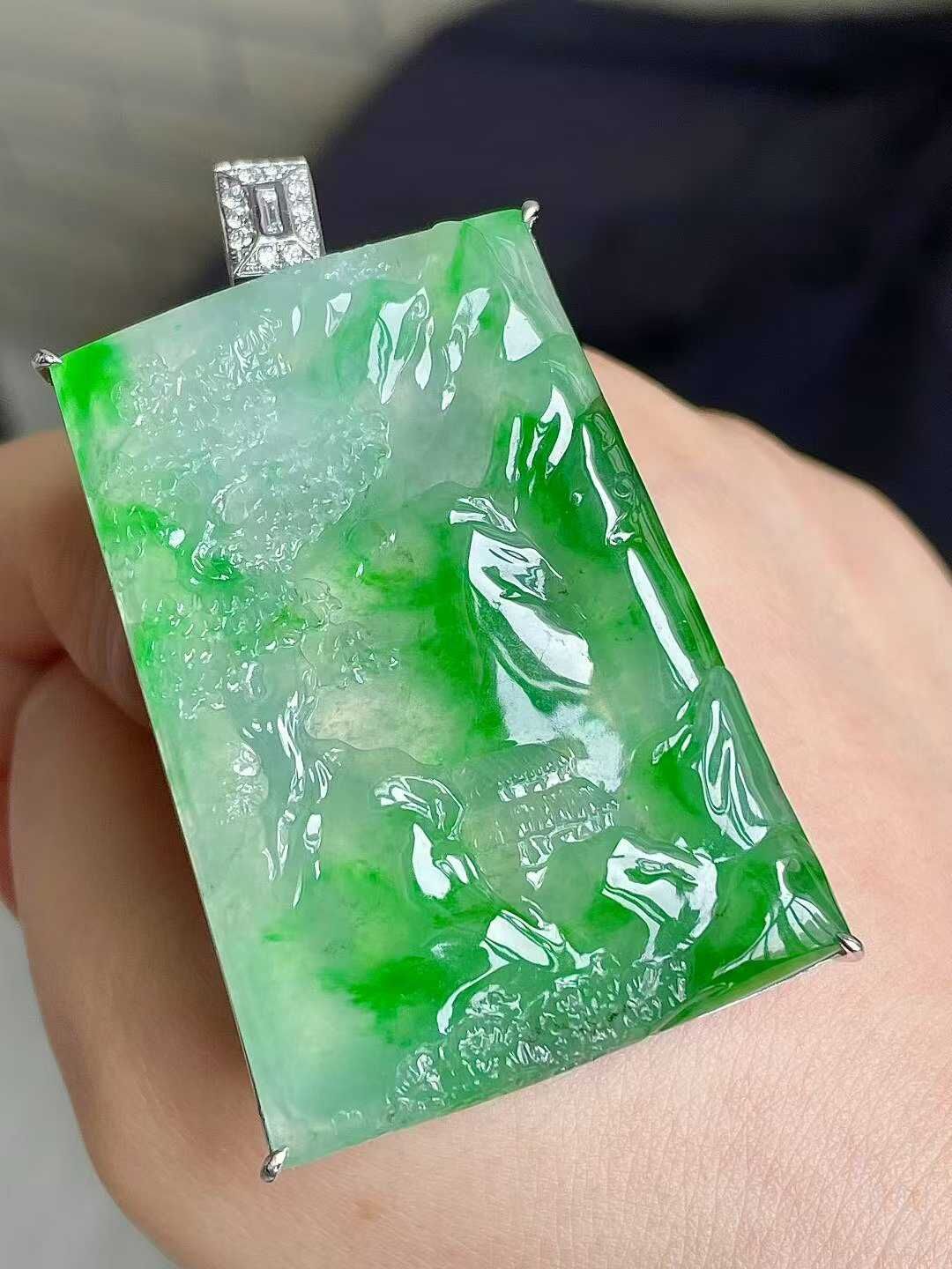 • 翡翠冰種陽綠山水牌吊墜,天然翡翠A玉, 緬甸玉, Jade, Jadeite