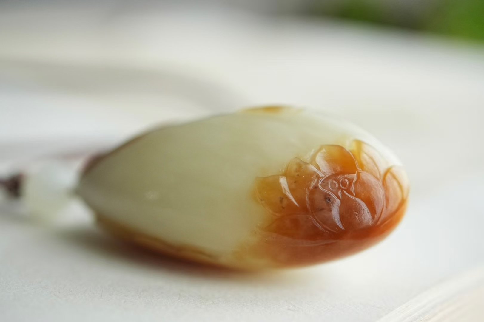 和田玉新疆且末糖白料,油性極好,帶天然暖糖色,糖色部分濃郁靚麗,俏色巧雕蓮花,料子細膩,整體乾淨,微微桂花糖點不影響,天然更可貴,無雜裂紋完美品相。