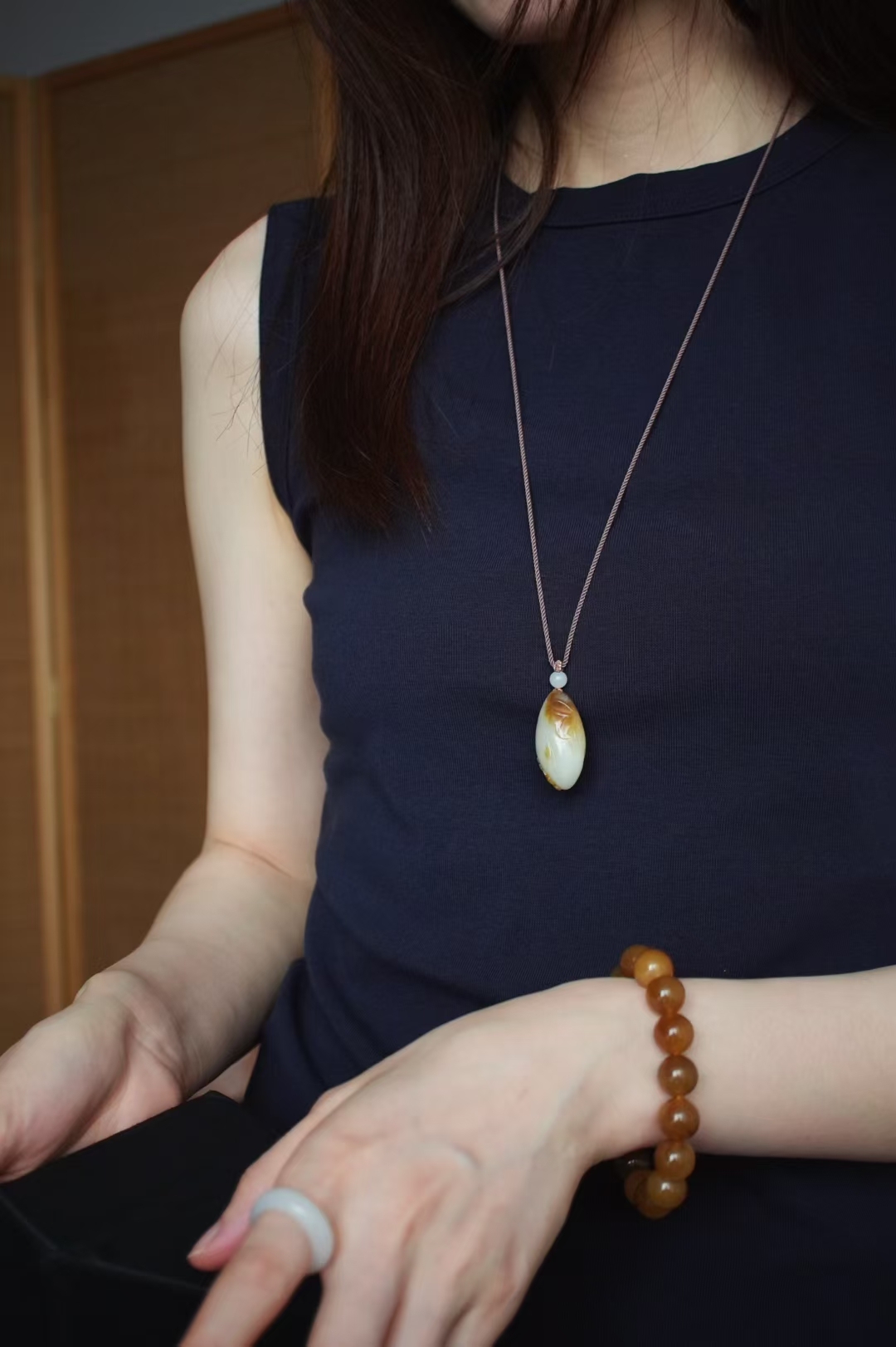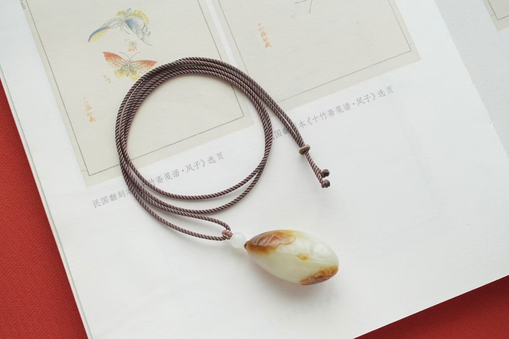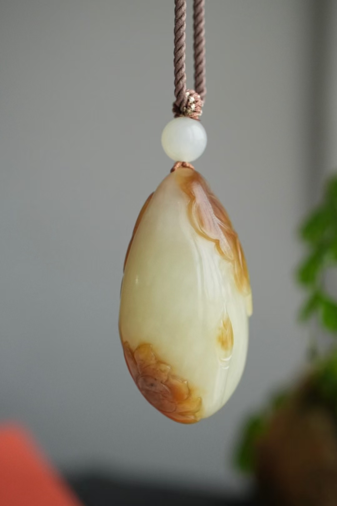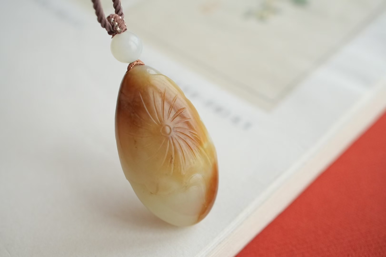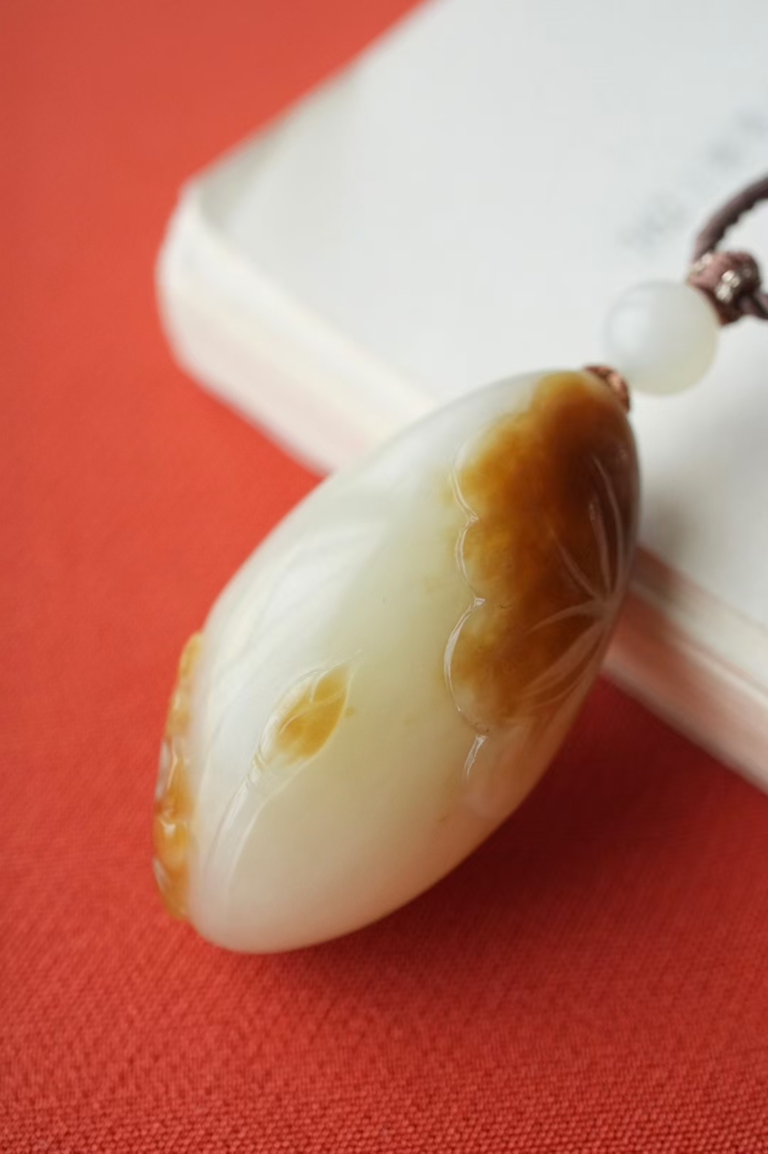 掛件小巧飽滿,蘇工雕刻荷花、荷葉細節纖微畢現,點綴白玉圓珠,整體寓意和和美美,吉祥如意。