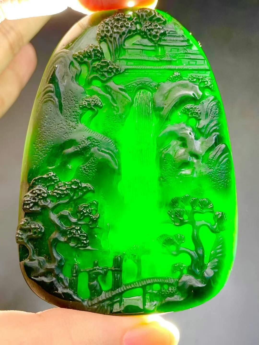 天然翡翠A玉,莫西沙老料子,料子種老,燈照透綠,雕工精美,完美無紋裂。