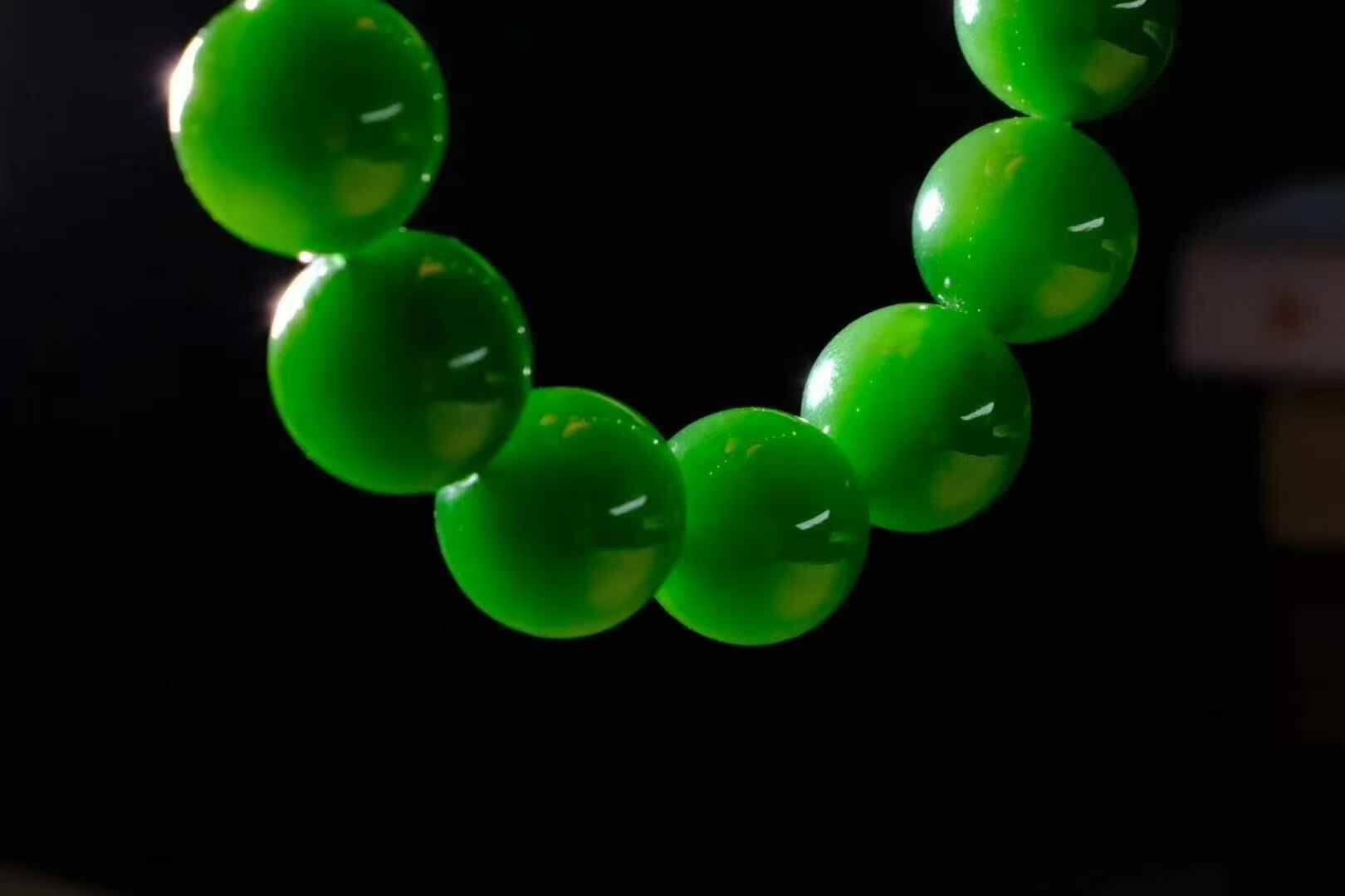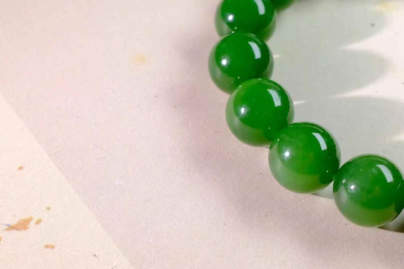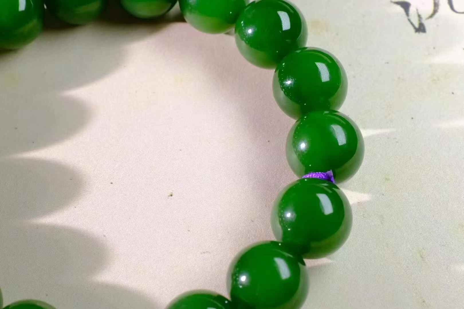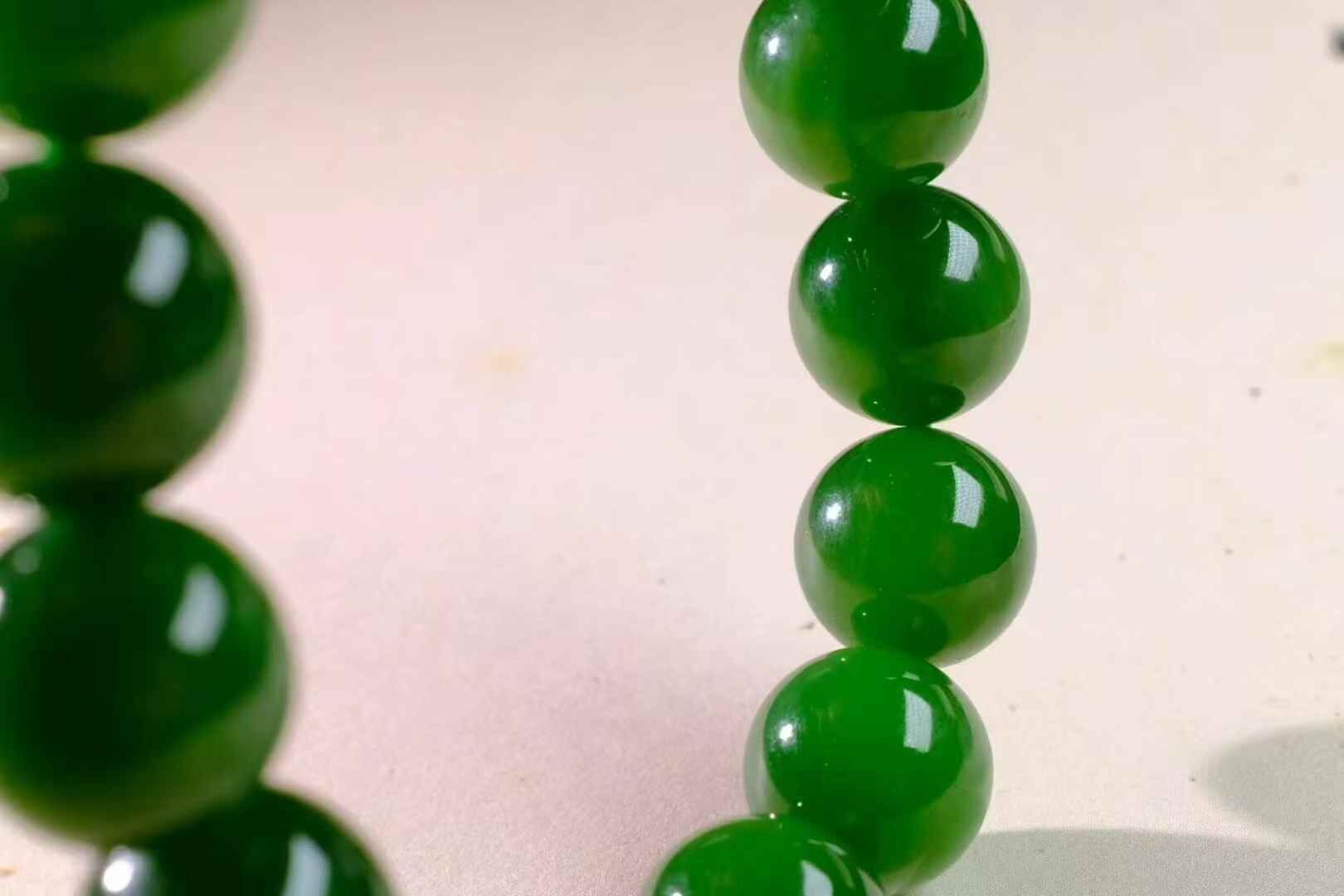 收藏級碧玉七號礦滿綠圓珠手串,無棉絮黑點,珠圓玉潤,天然玉質紋路。