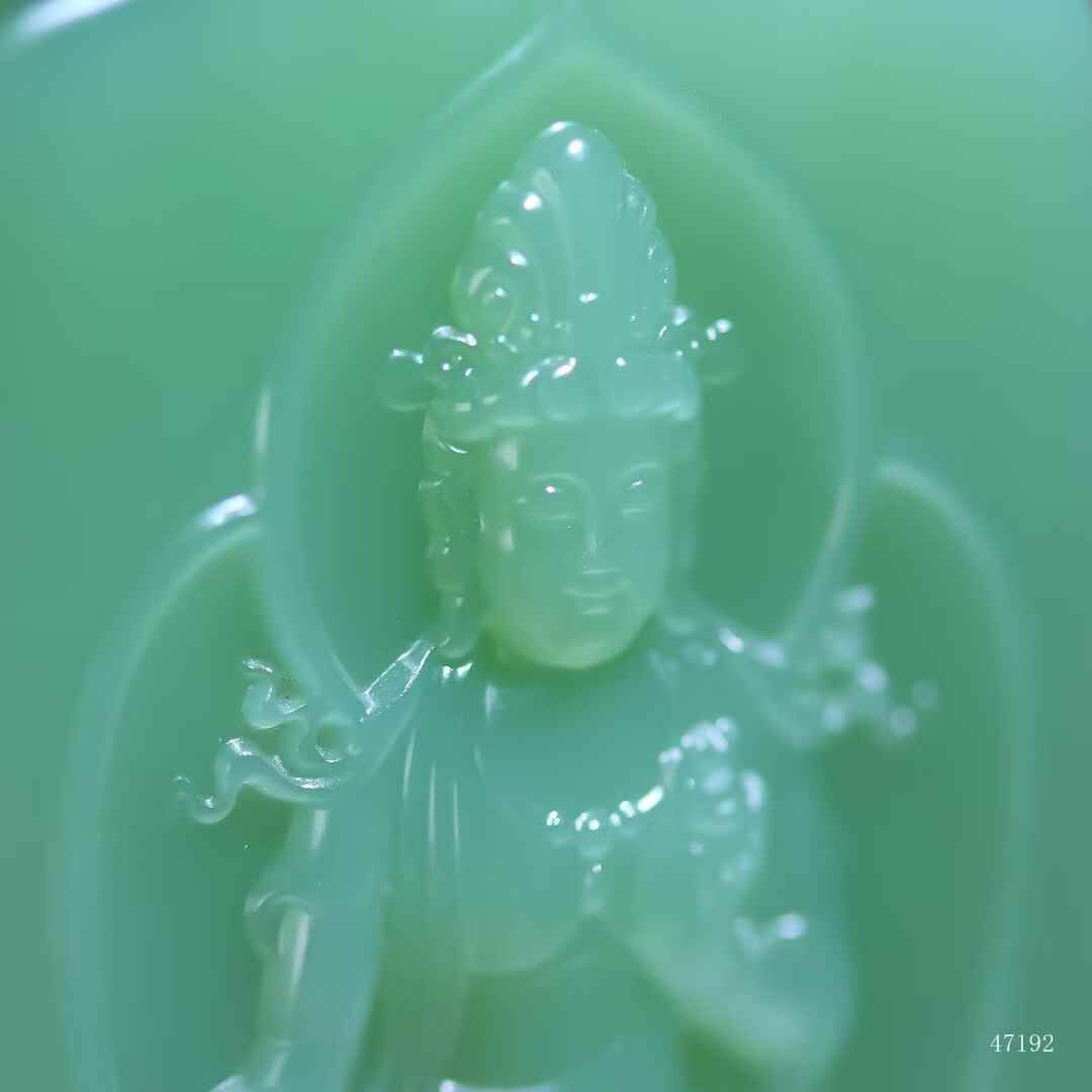 收藏級和田玉粉青標本料,玉色清雅似春山含黛,清透若初荷承露,潤質瑩光流動似青霧漫湖。觀音端坐蓮臺,衣紋流轉間刀工隱於玉魂,素牌無冗飾方顯玉色純粹。