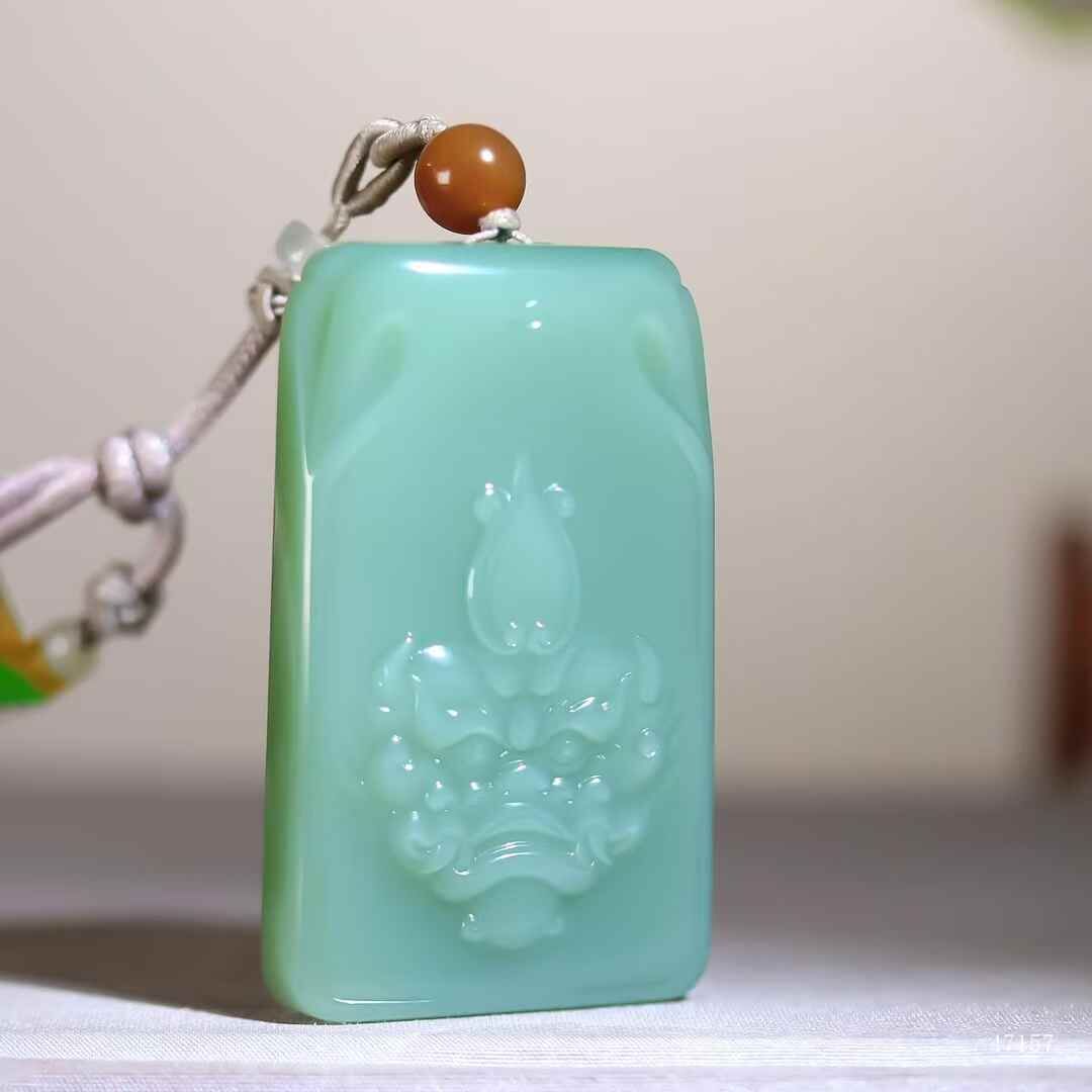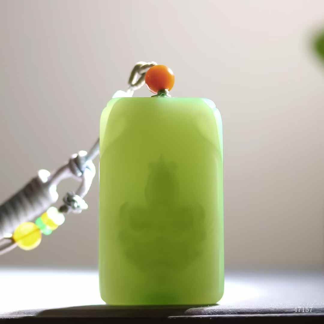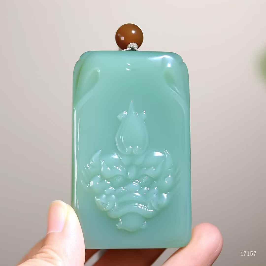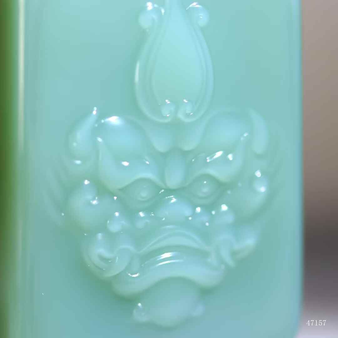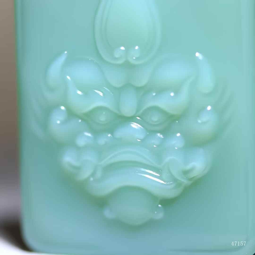 典藏重器,和田玉碧玉粉青料,牌型端正大氣,玉質冰潤透骨,澄澈無瑕,不見纖毫結構,牌體厚重溫雅。獸面威儀端方,目納雷霆威儀,熒華流轉間似有洪荒護佑之力破玉而出,此非凡物,乃鎮宅通天的寰宇靈璽。