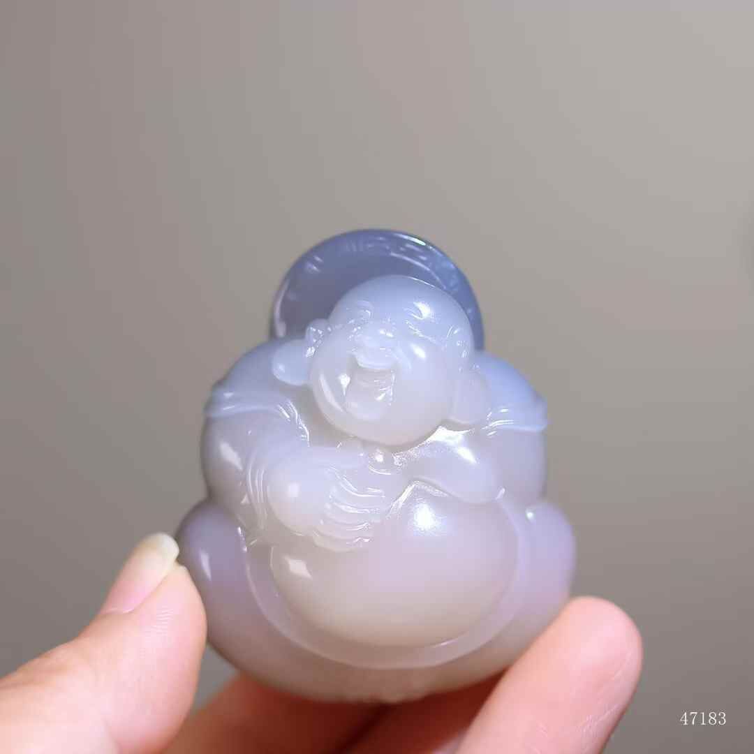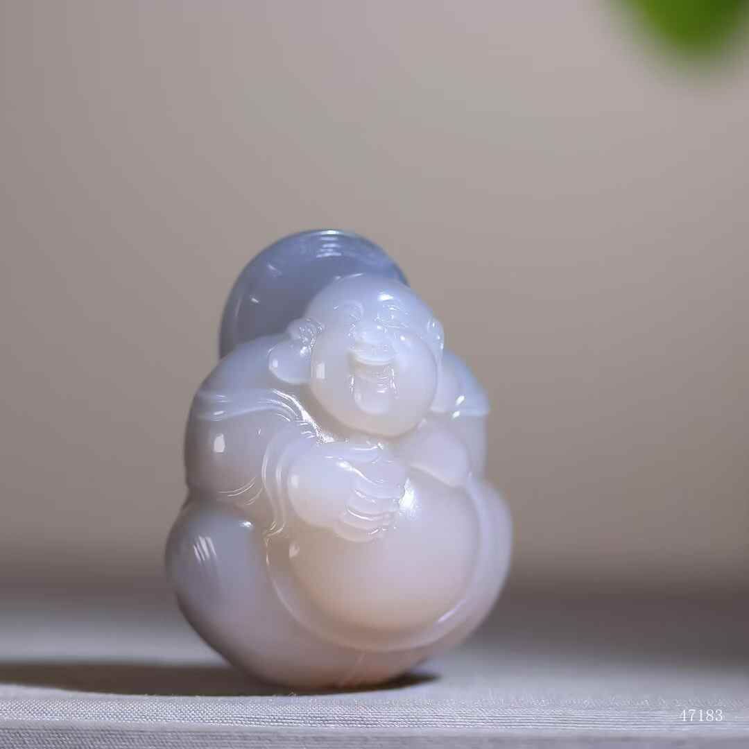 和田玉煙紫藕粉雙色料,紫若薄霧透霞光,粉似初荷凝玉露,乃造化奇珍。彌勒團坐如抱月圓融,大師手琢衣紋如水流暢。