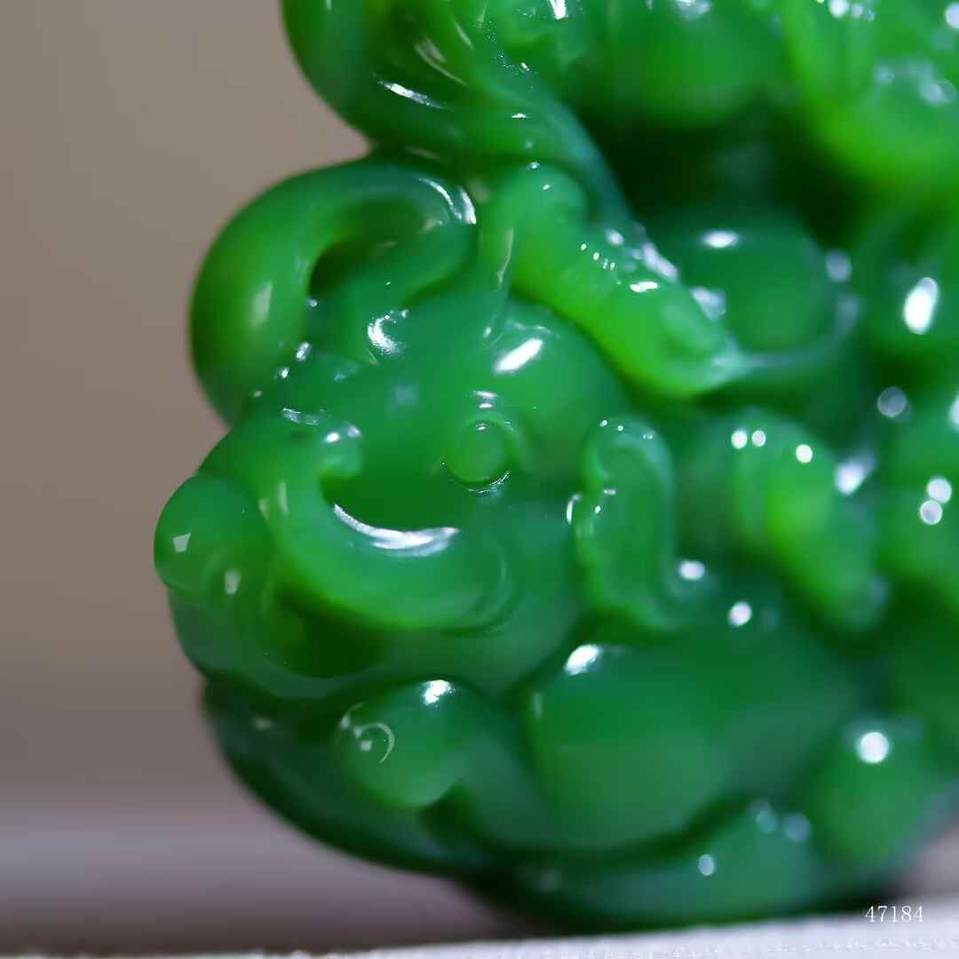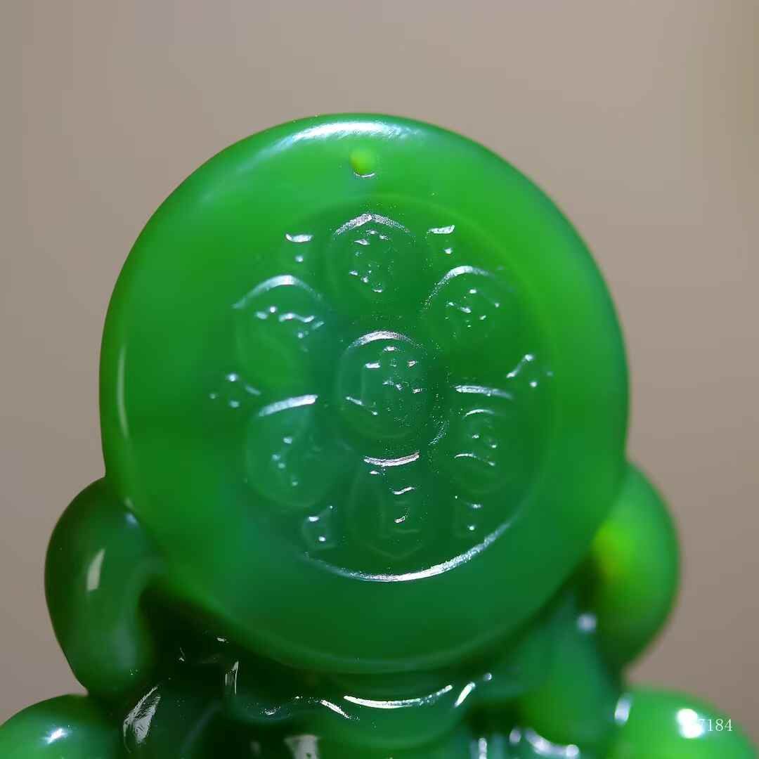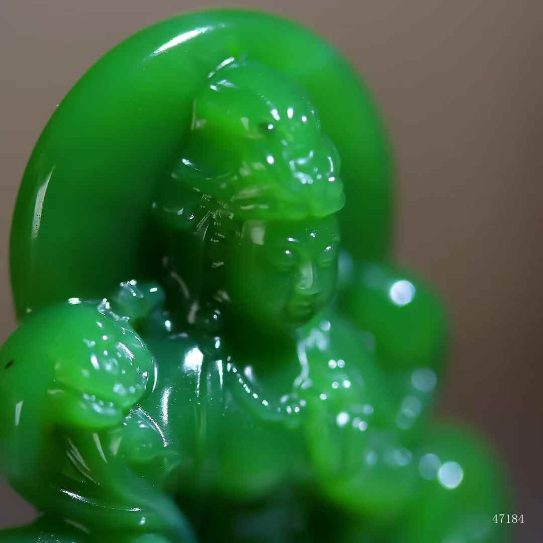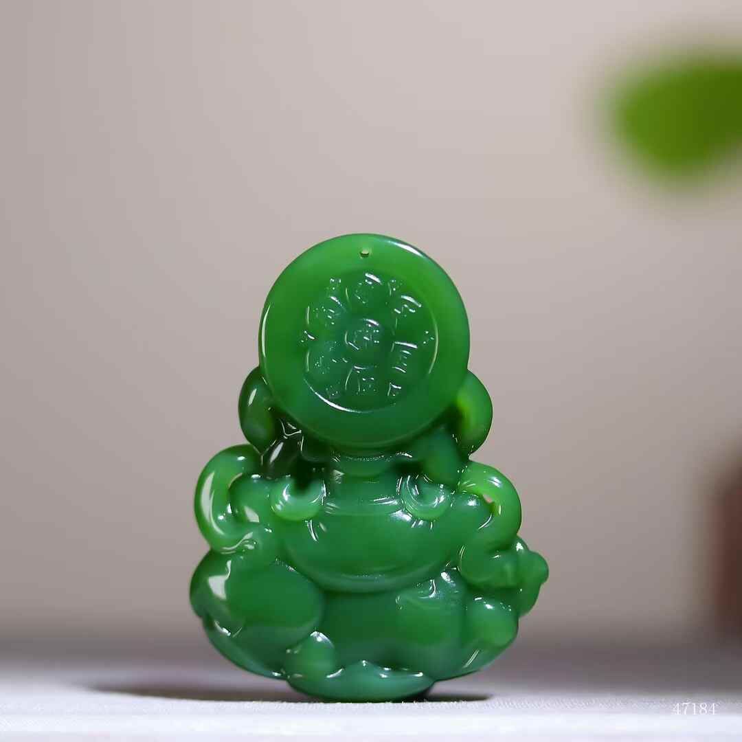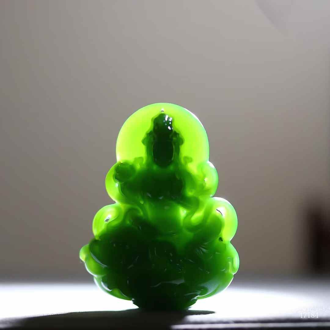 和田玉老坑菠菜綠碧玉,濃翠若深潭靜水,脂光流轉似墨玉含春。普賢執如意端坐象背,衣袂垂落如雲卷雲舒;白象肌骨渾成,昂首踏步間盡顯雍容。玉色之醇襯菩薩之慈,造像之豐盈見大師刀底乾坤。