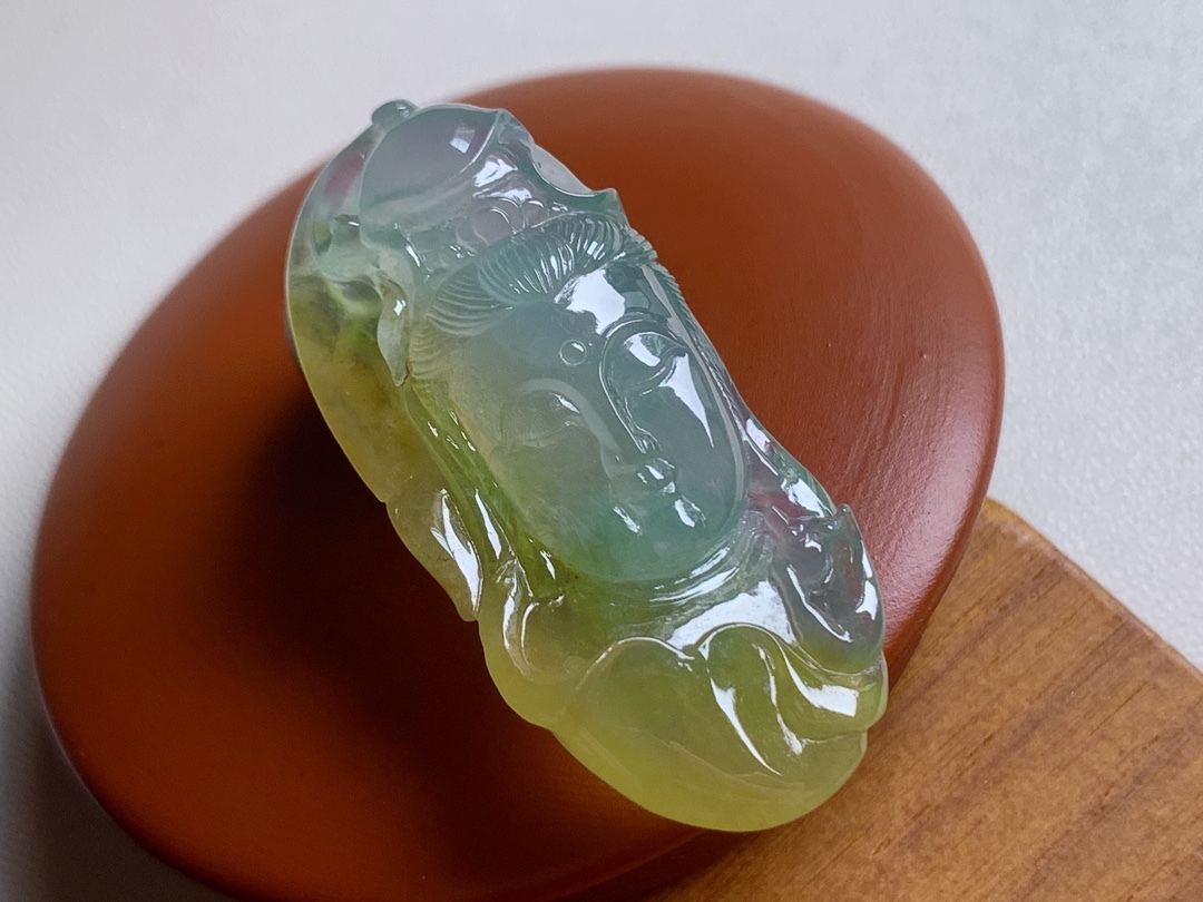 天然翡翠A玉,色澤金黃漂亮,觀音妙相慈悲為懷,完美。