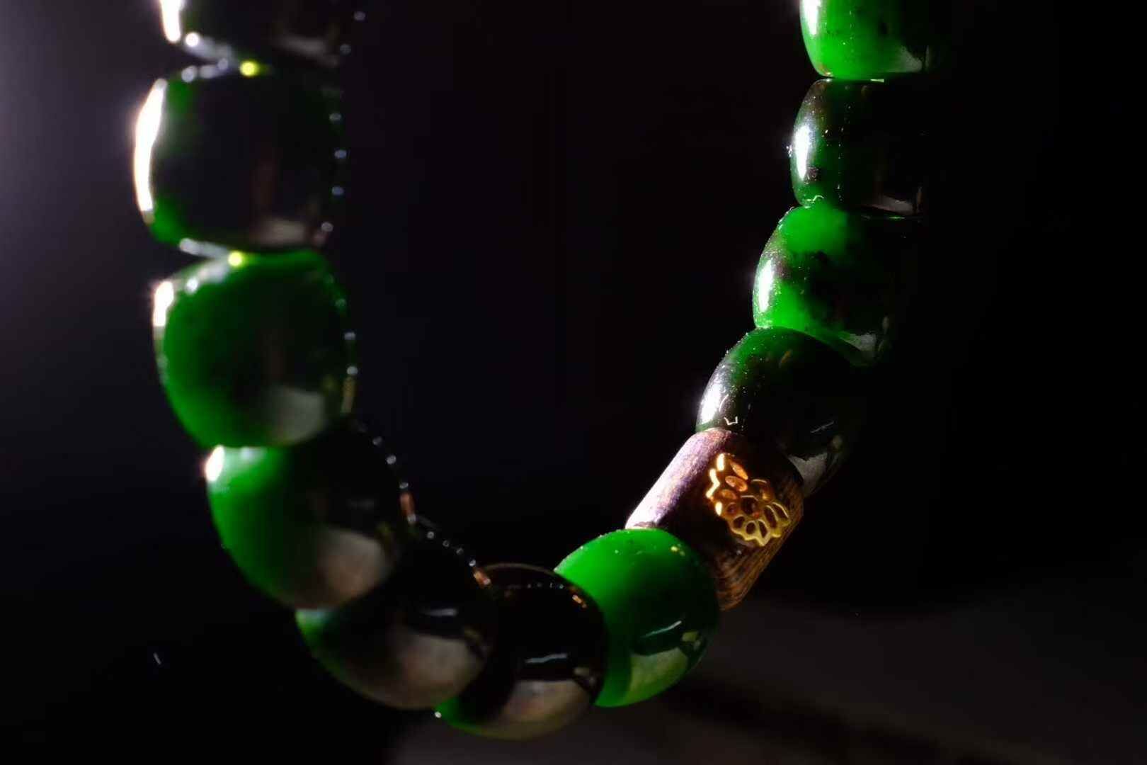 和田玉碧玉七號礦辣綠紅皮直切珠,稀缺高品質無棉絮,帝王綠品相。
