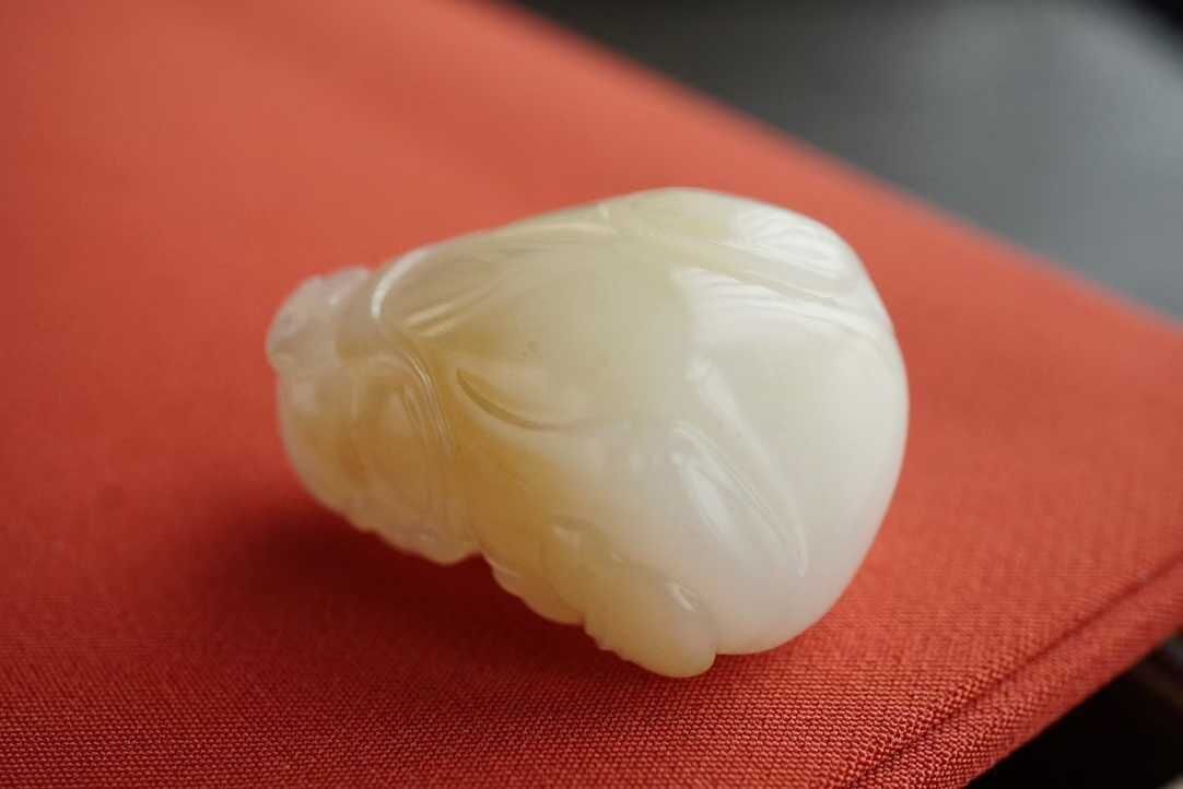 和田玉新疆且末糖白料,帶天然糖色,糖白兩色分明,白肉部分達到羊脂白,玉質細膩脂粉足,油性十足,無水線無裂紋。