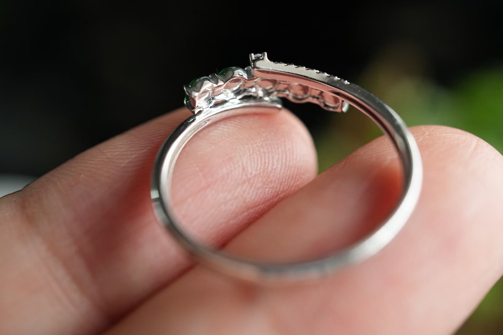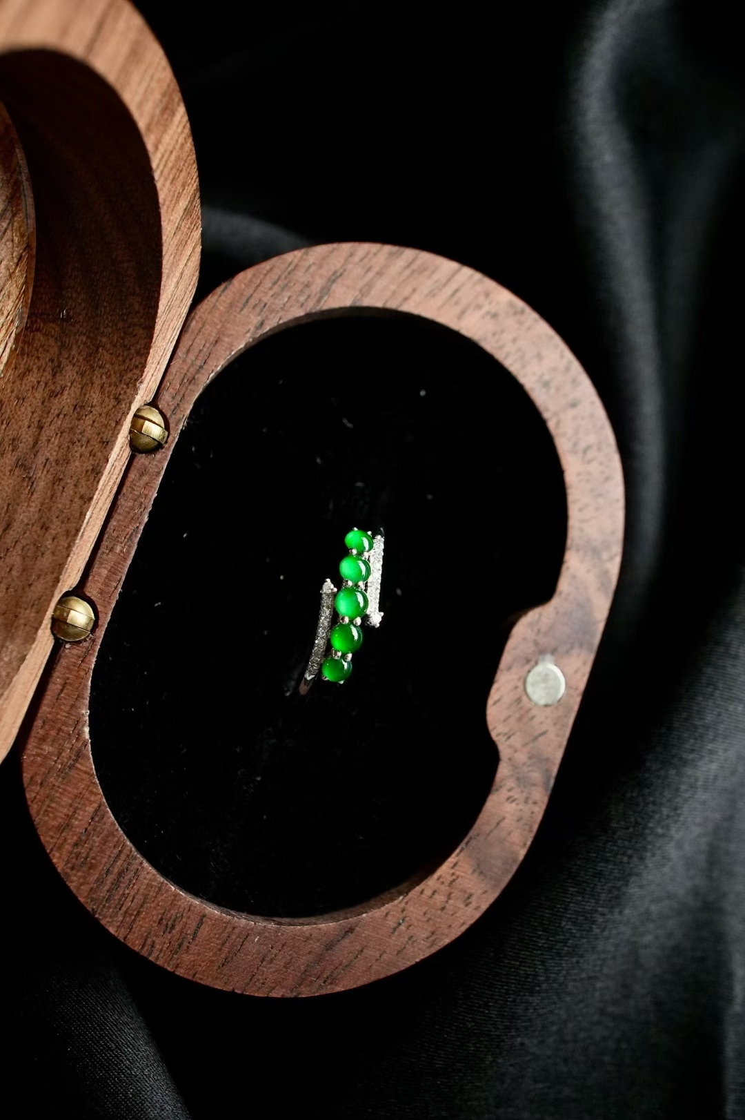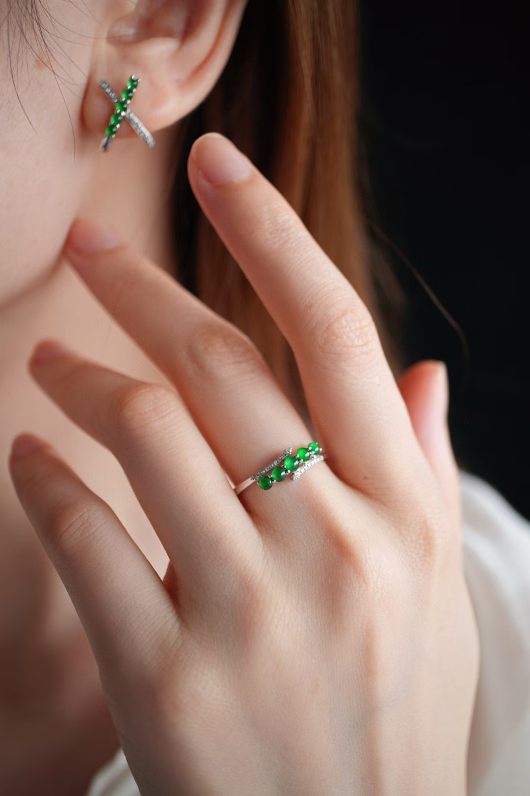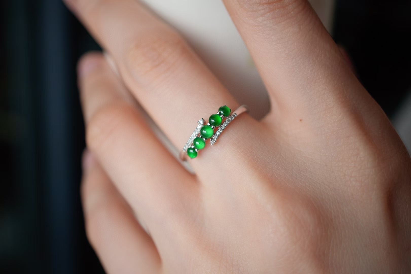 再來一款設計款排戒。天然翡翠A玉,緬料冰辣陽綠蛋面排戒,大顆粒鑽石點綴,上手精緻感十足,時髦。