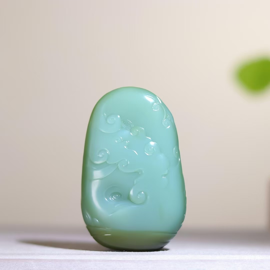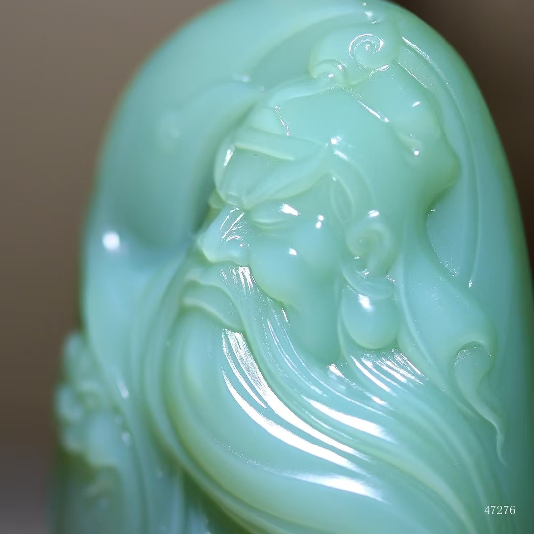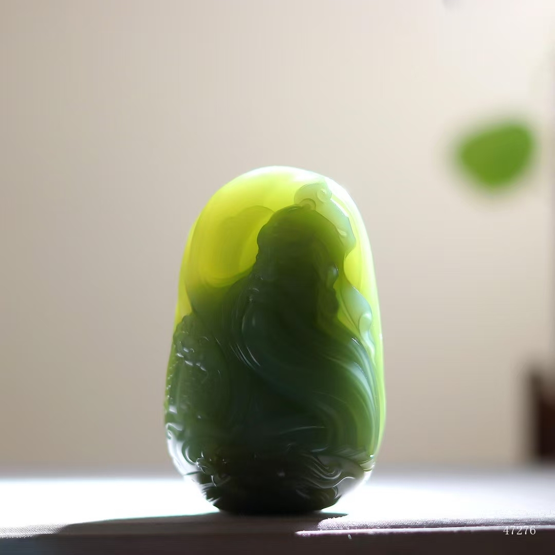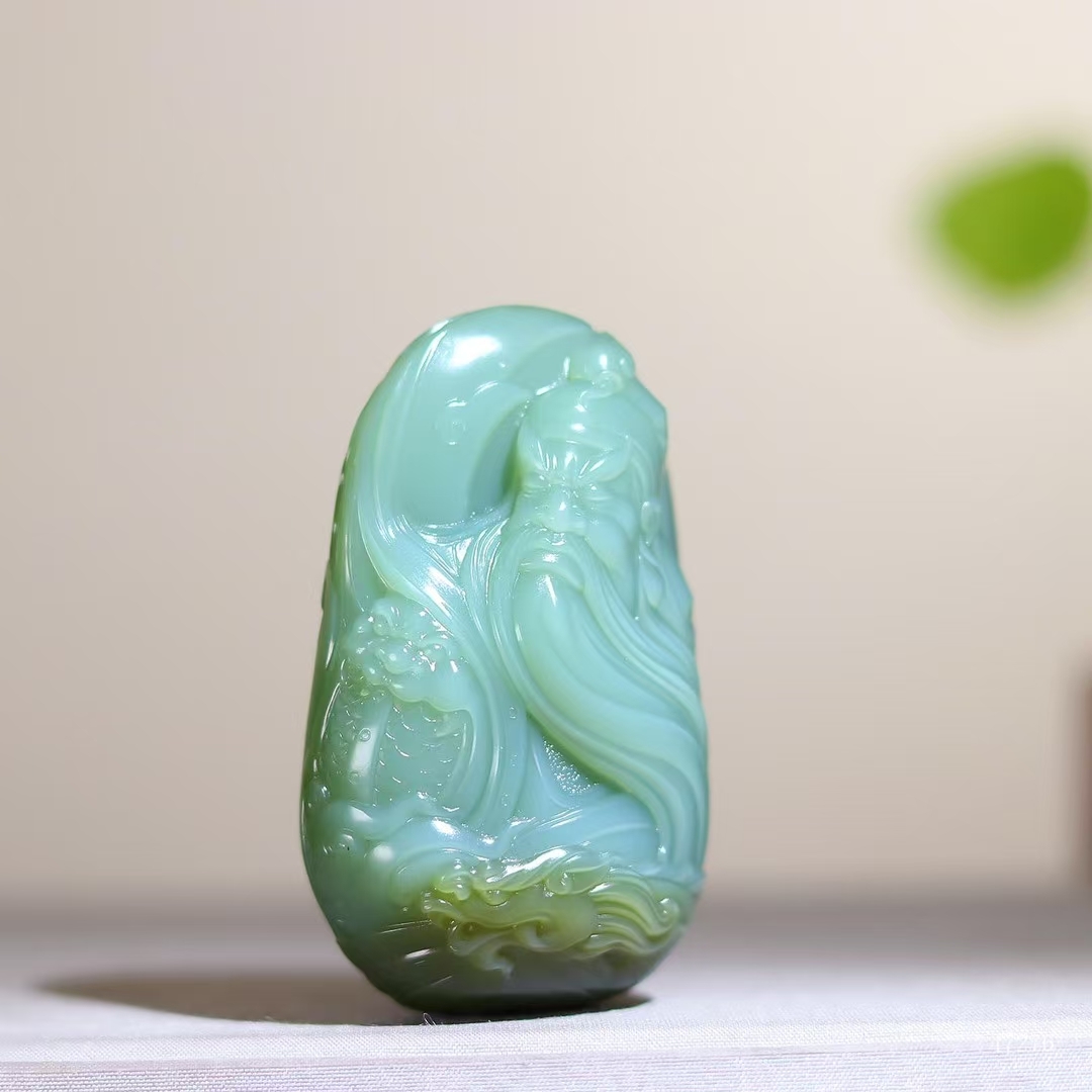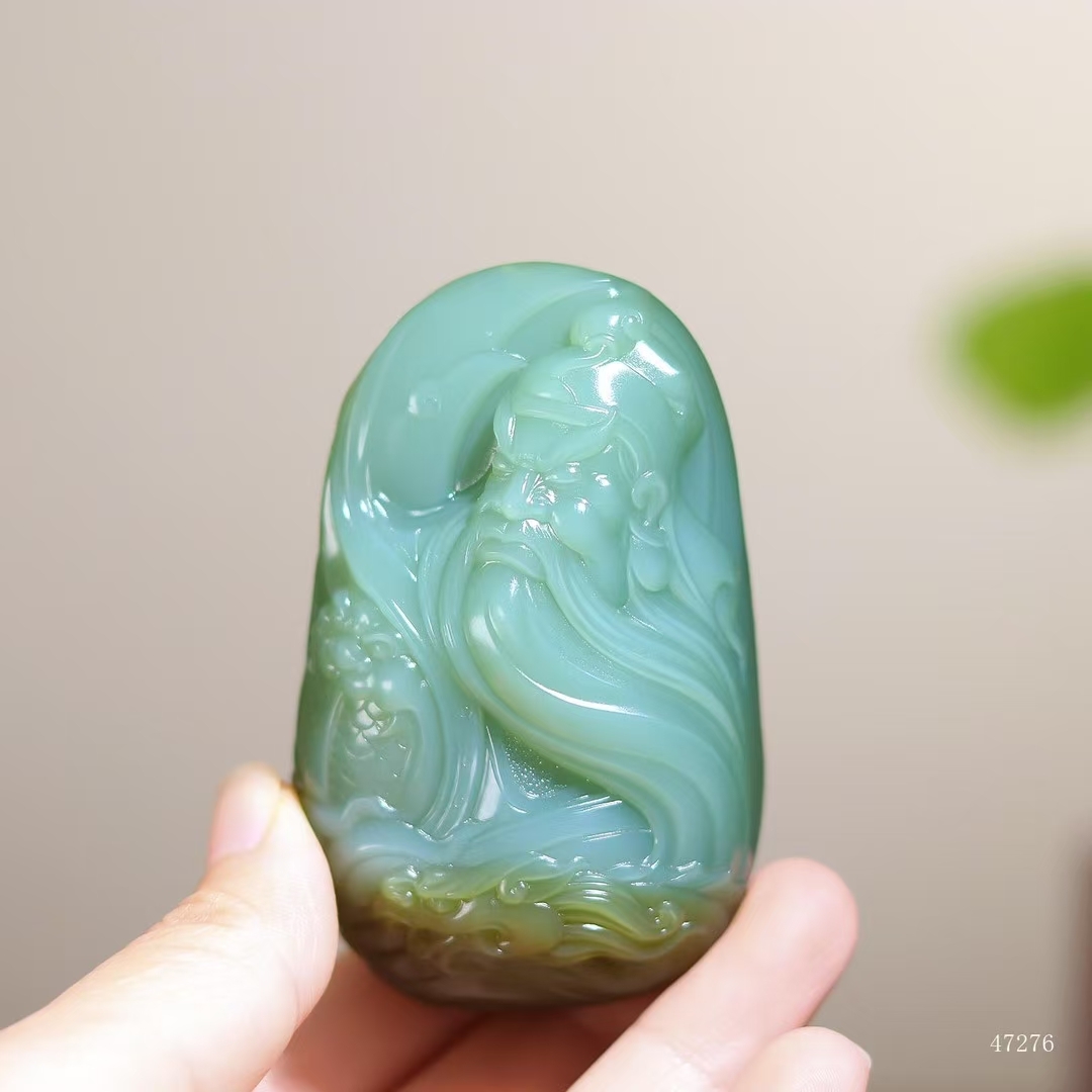 頂級和田玉粉青玉質密若膏髓,玉胎凝脂膏,粉青沁骨透瑩光。宗師以刀代筆,關公側目如電,鼻脣溝壑藏劈山刀意,關公側顏威儀自眉峰傾瀉:眉眼虯髯鬍鬚之間,虛實交疊似隱戰塵;底部一抹糖色