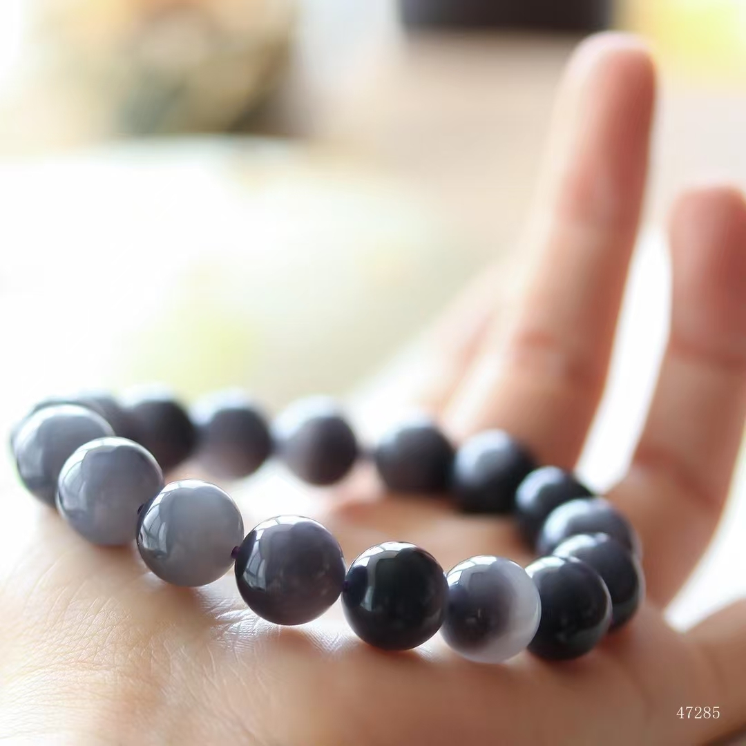 每珠半裁羊脂瓊霜,半沁羅蘭暮色,白若初雪覆霜,紫似暮雲沉璧,雙色天然交融如天工潑墨,煙霞流轉間暗合陰陽大道。萬中無一之稀珍,腕系乾坤詩韻,藏天地大美。