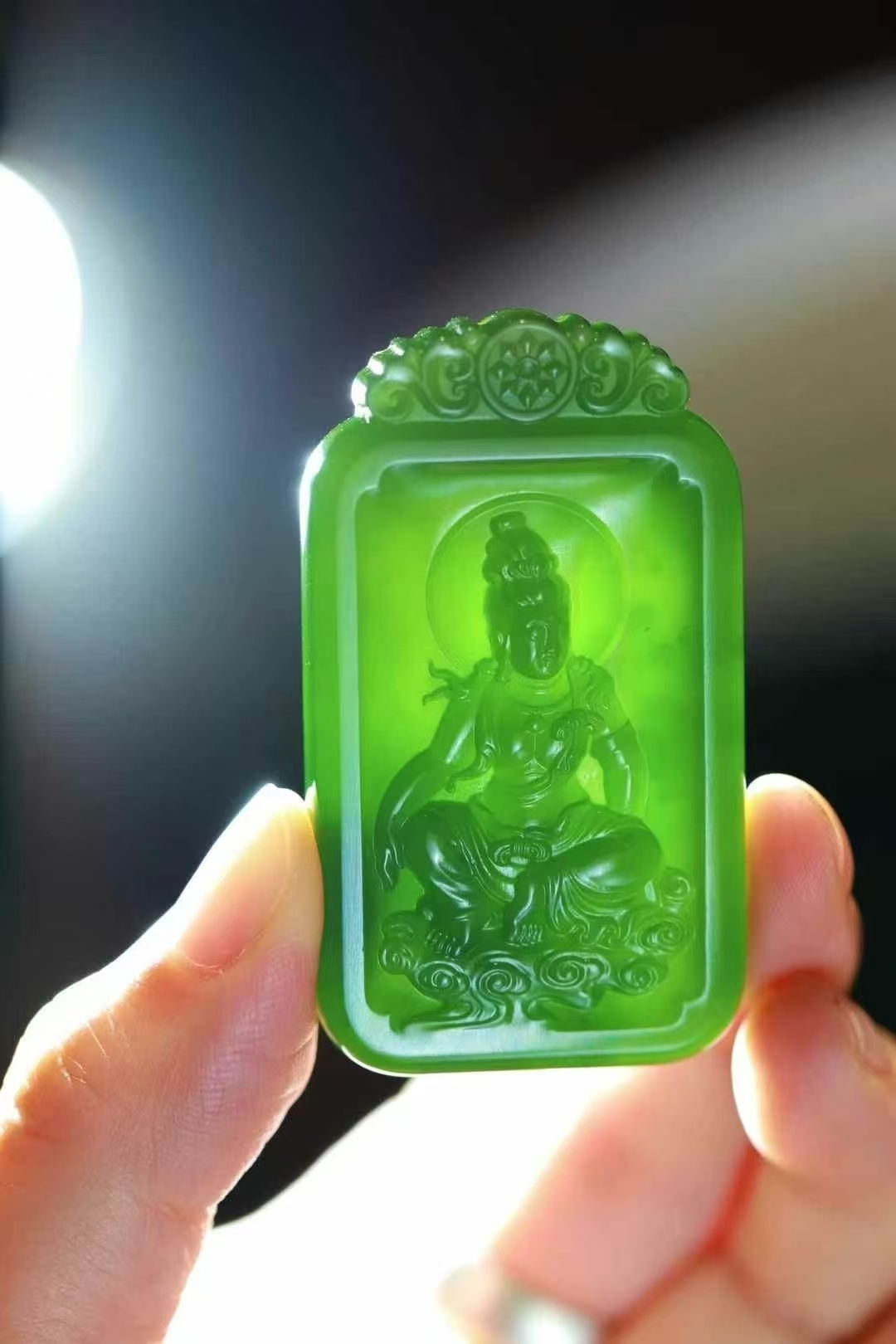 “水月觀音”,非常漂亮的一塊和田玉菠菜綠,色若春波,牌型太美了!規規矩矩,方圓有致!色滿均勻油性滿溢,玉質凝脂般細膩,觸溫潤生光。觀音臨水照影,姿態空靈,佛光雲影間禪心自現。工韻雙絕,方寸納福。