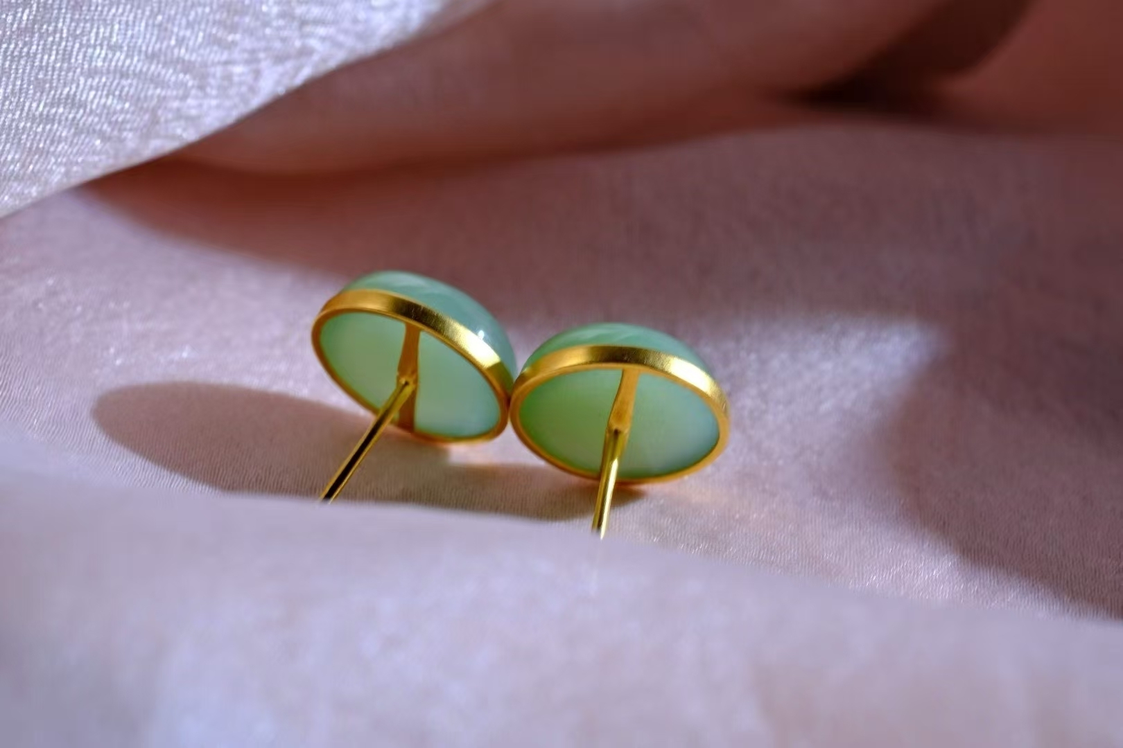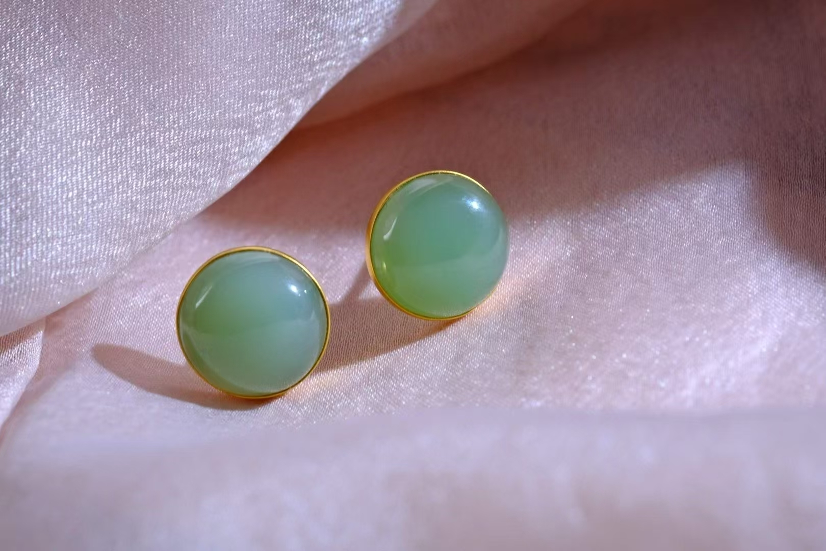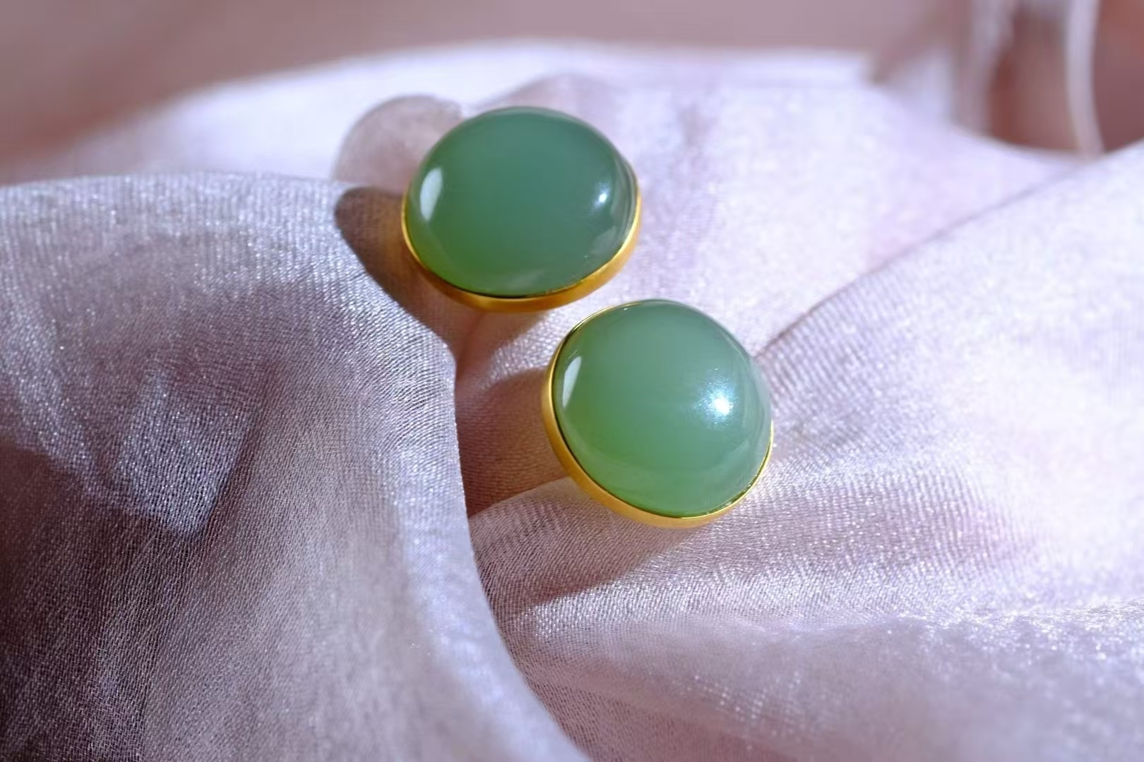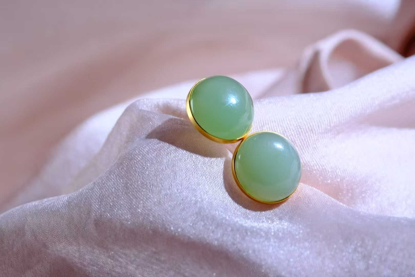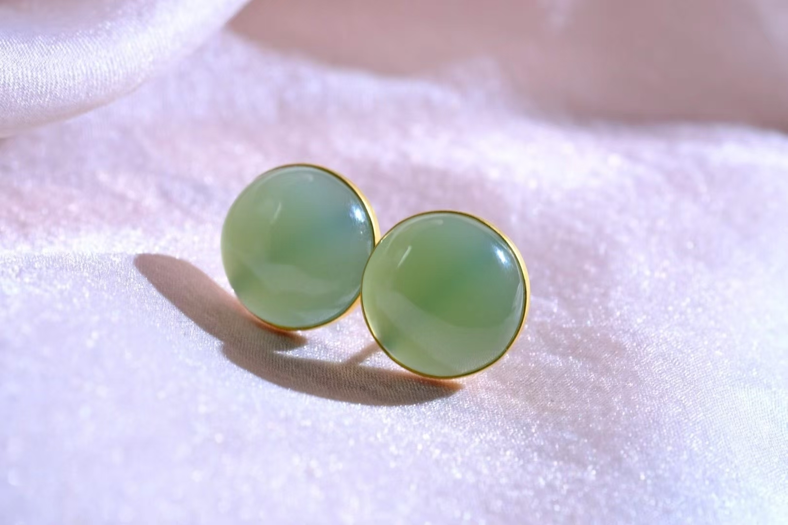 和田玉碧玉稀有粉青,高密度細料,顏色清雅不發暗,真正的莫蘭迪色系,玉質油潤細膩脂粉足,過燈純淨,無棉無水線,無雜無裂完美品相,寓意圓圓滿滿,18K金包邊,上耳典雅大氣。