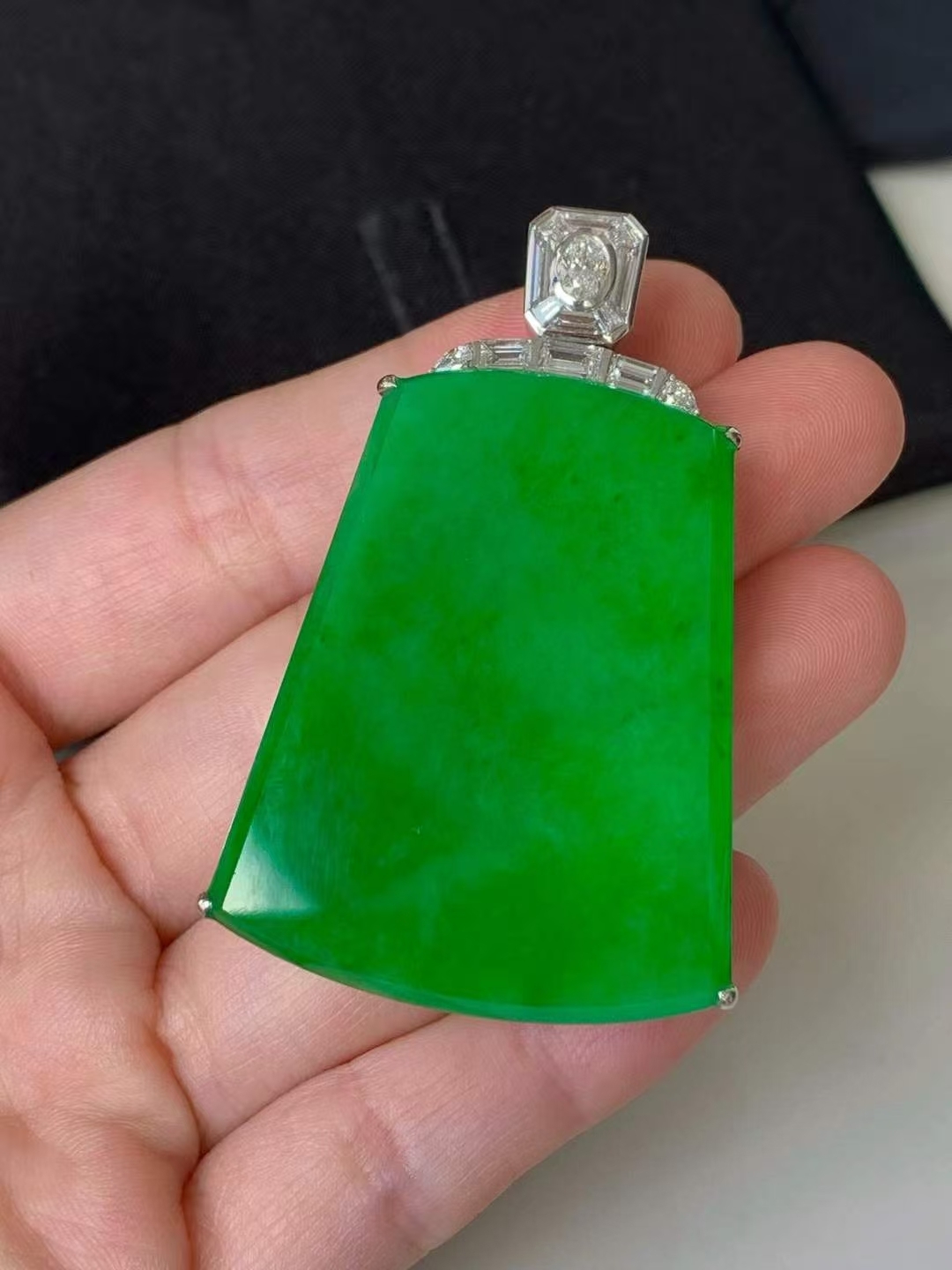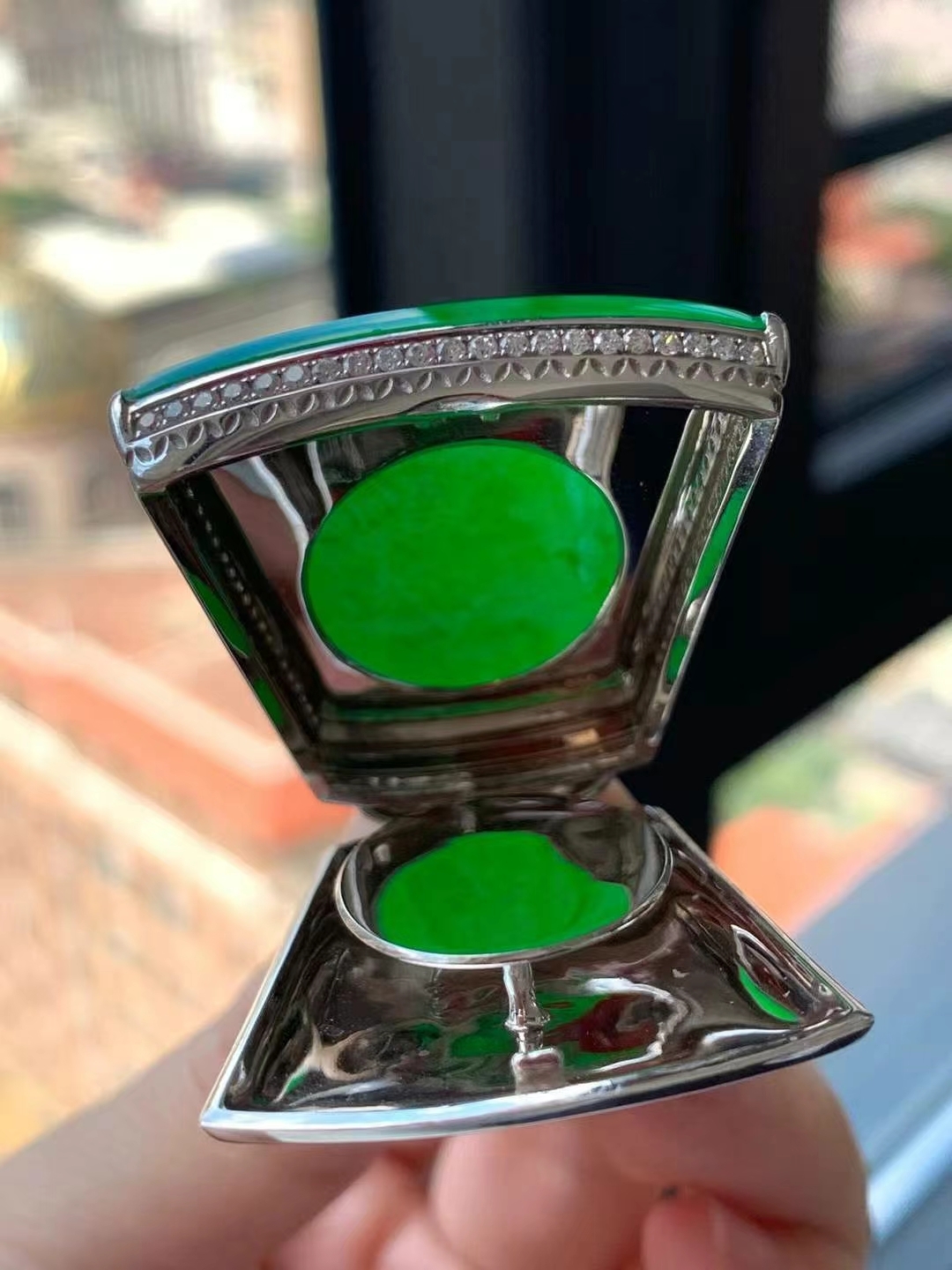 天然翡翠A玉,18K金鑲嵌,種老細膩,色陽濃郁起膠。