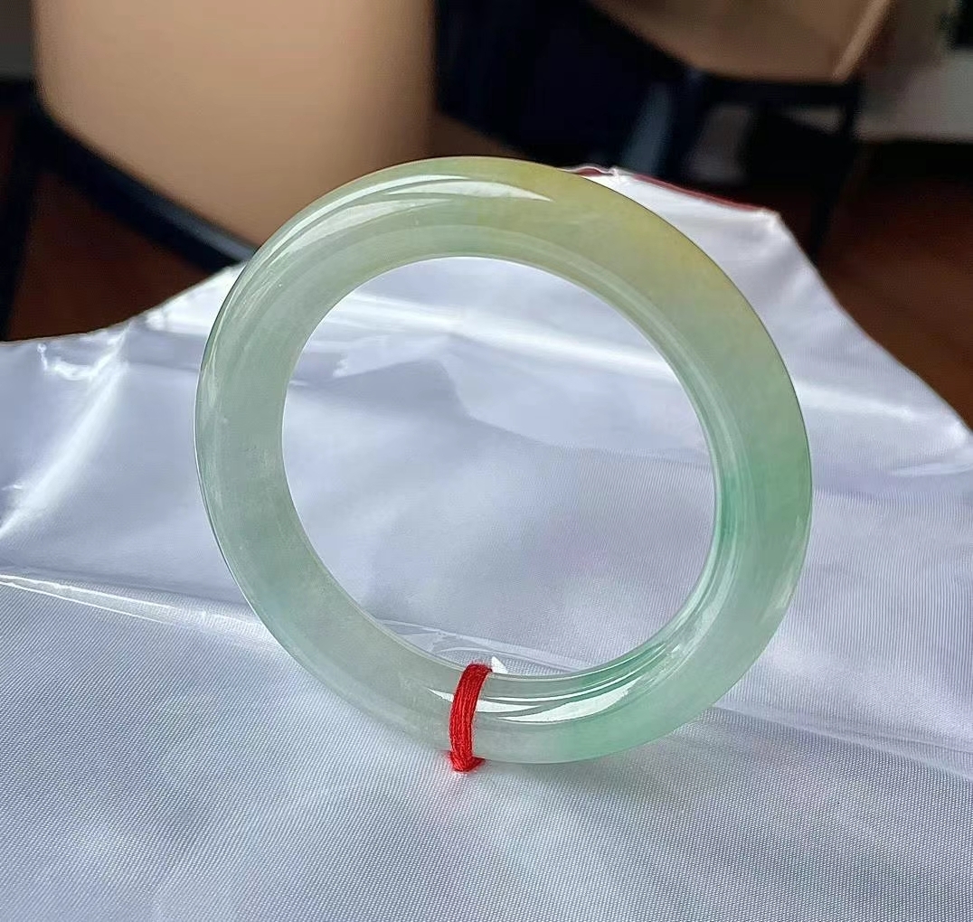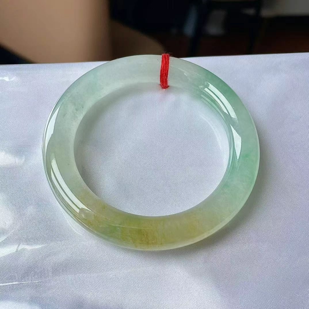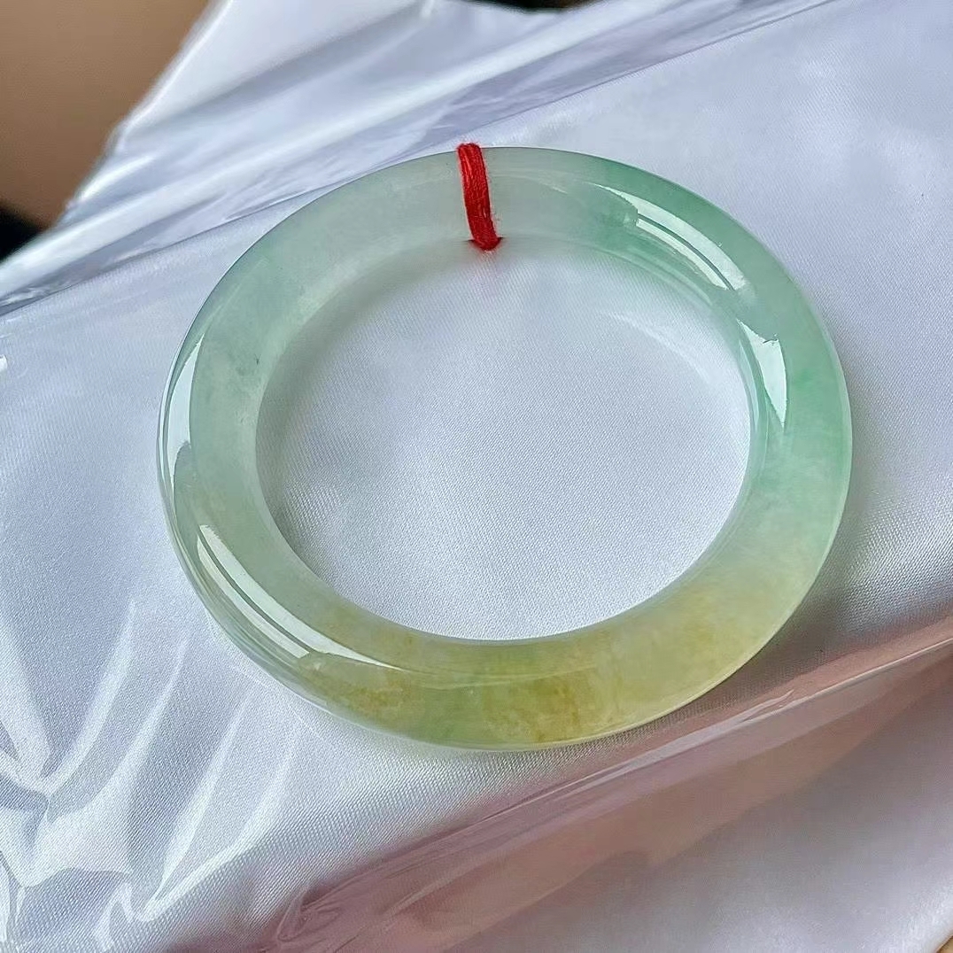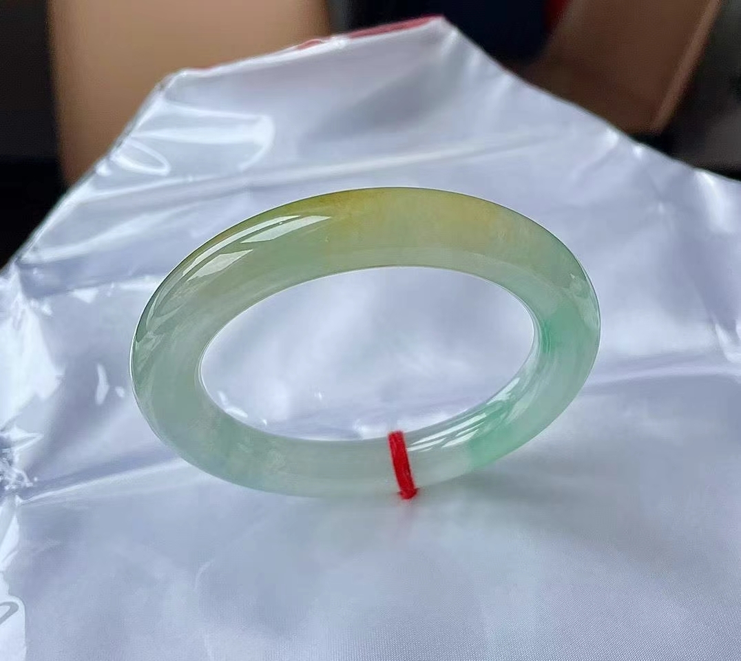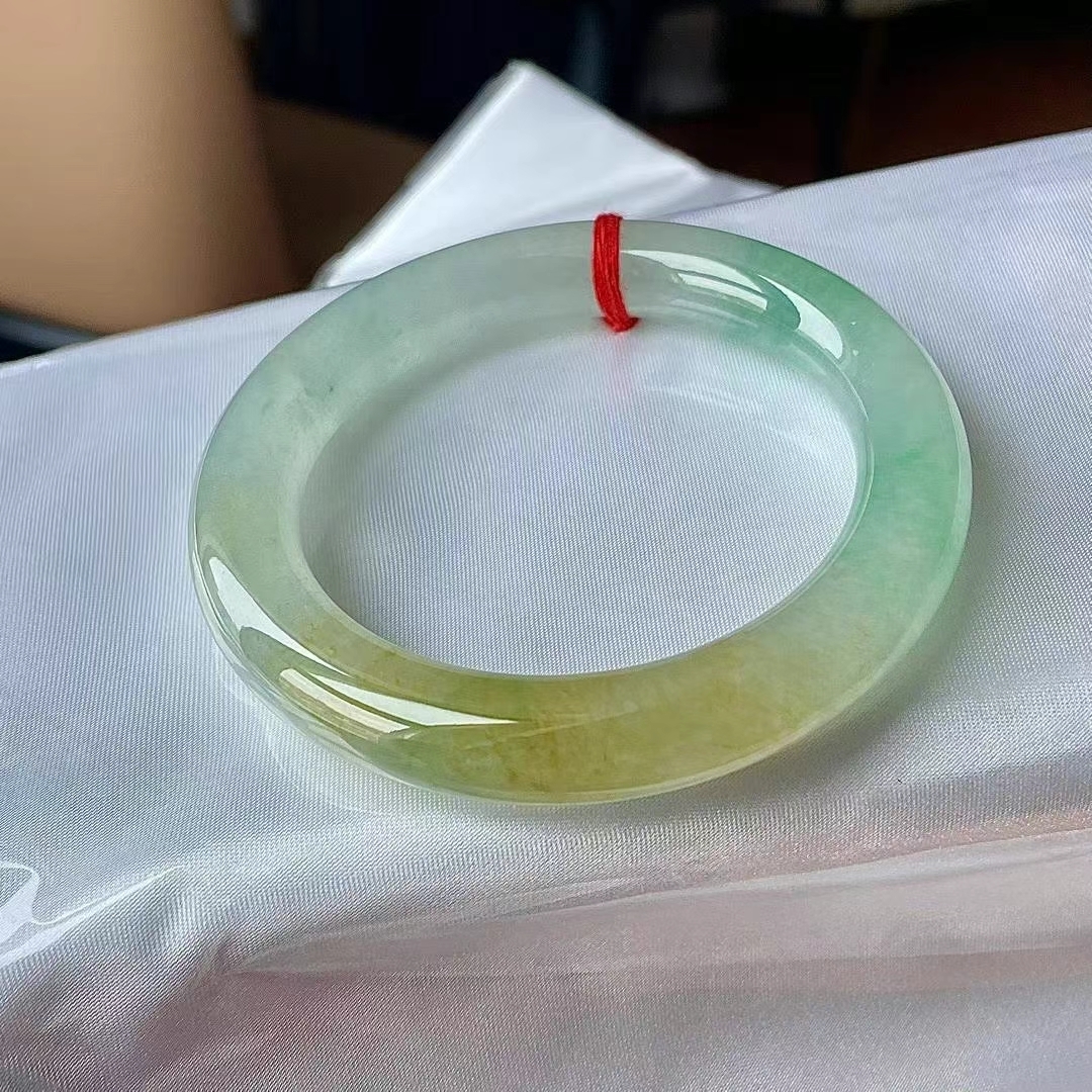 • 高冰黃加綠翡翠圓條手鐲,天然翡翠A玉, 緬甸玉, Jade, Jadeite