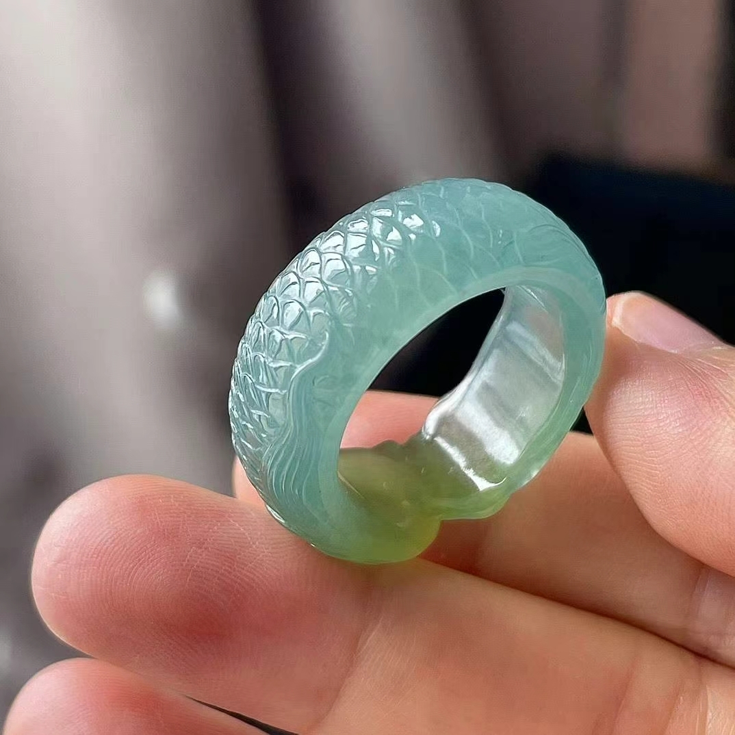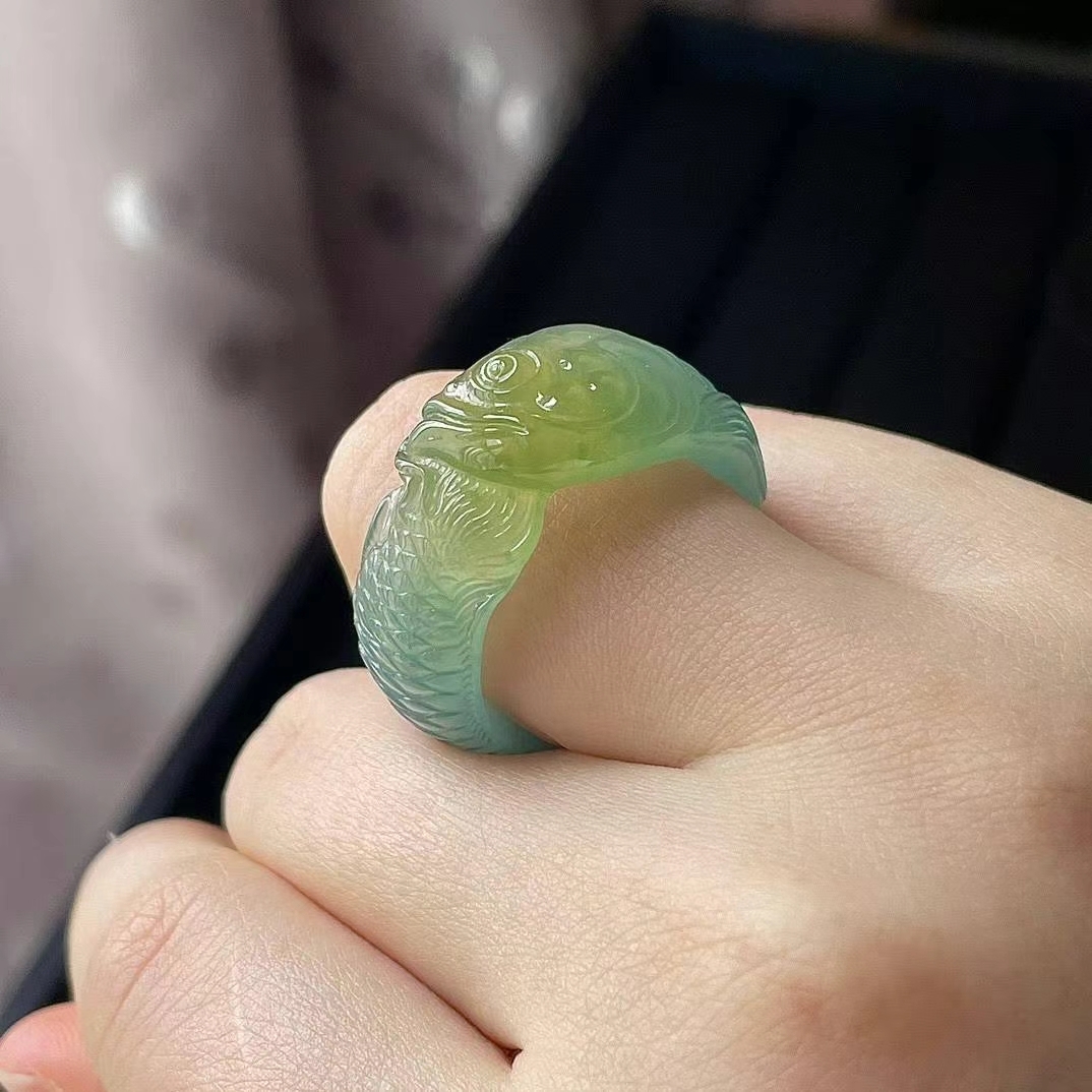 76557 翡翠冰藍雕花龍魚指環 (港圈 19號)