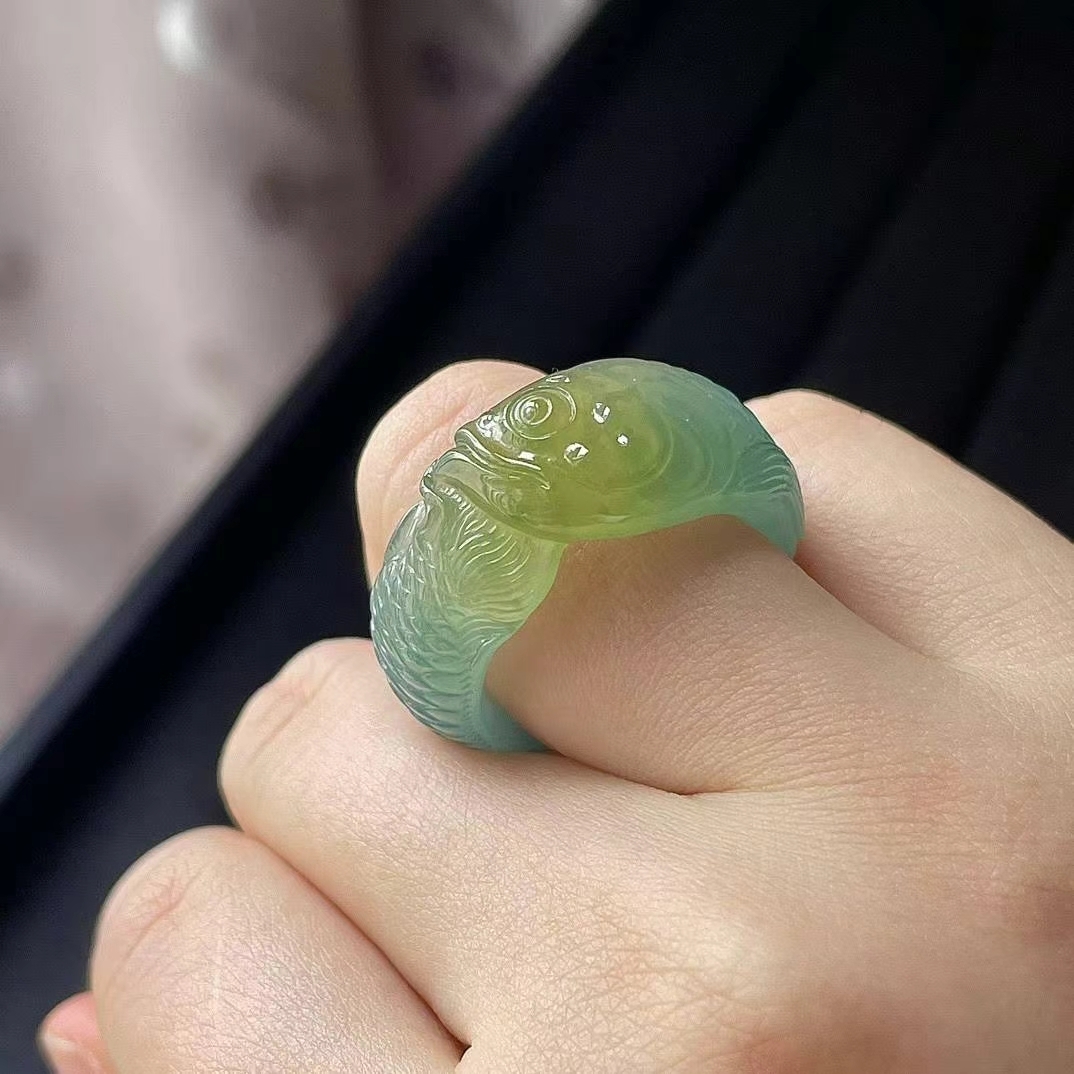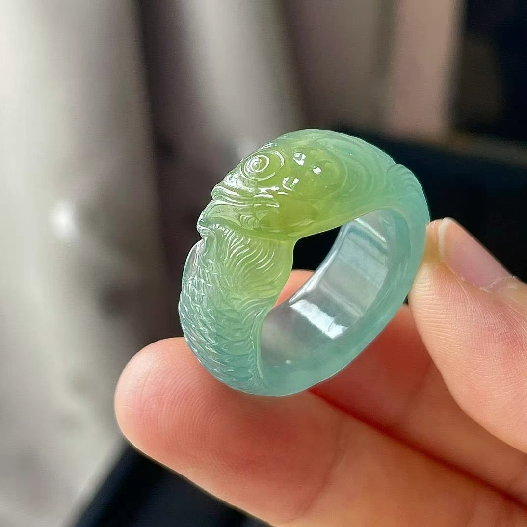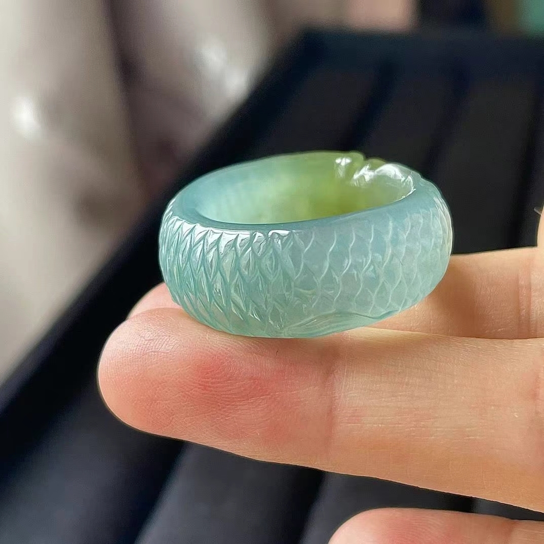 • 翡翠冰藍雕花龍魚指環 (港圈 19號),天然翡翠A玉, 緬甸玉, Jade, Jadeite