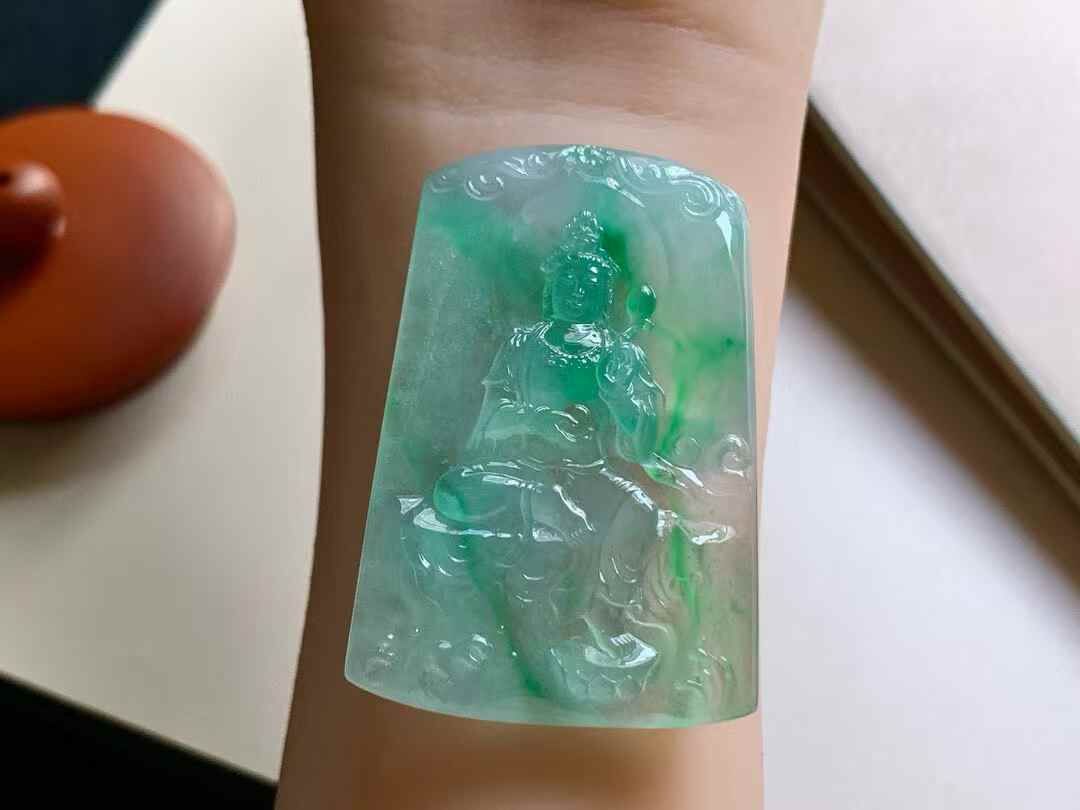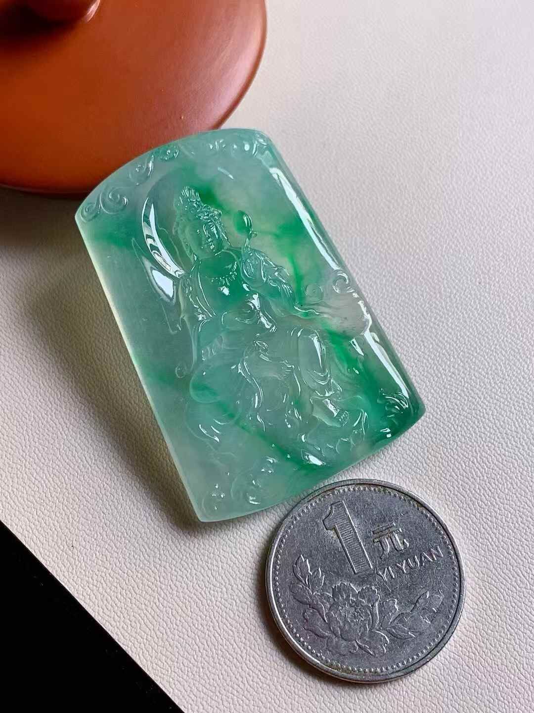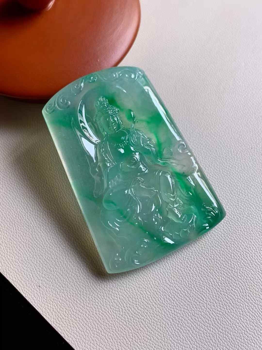 天然翡翠A玉,極具質量感!色澤青翠漂亮,觀音妙相慈悲為懷,完美。