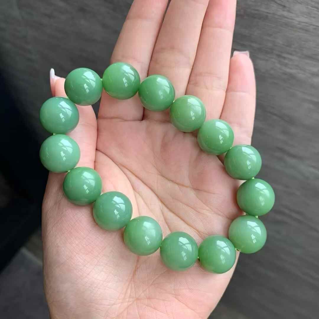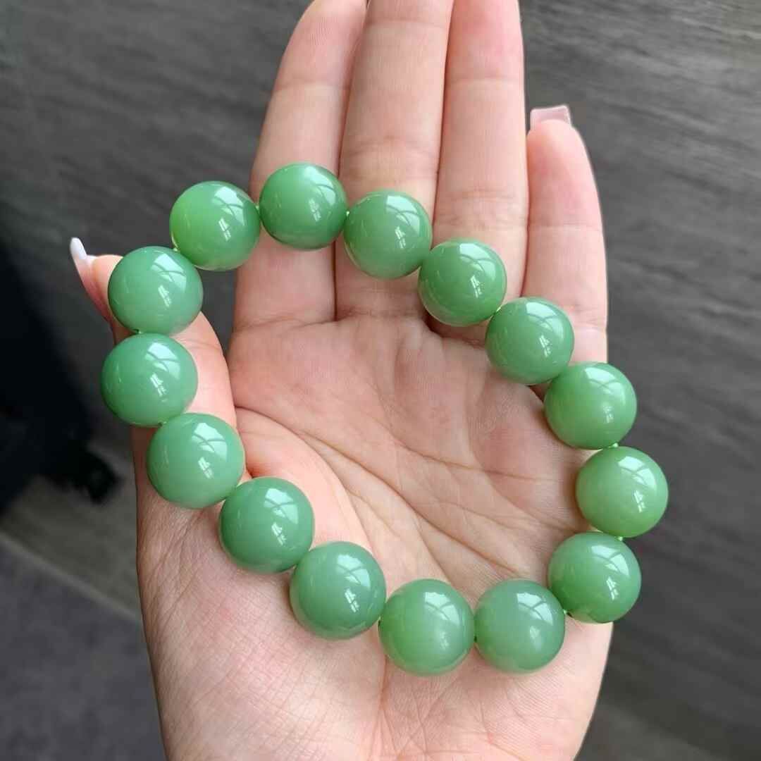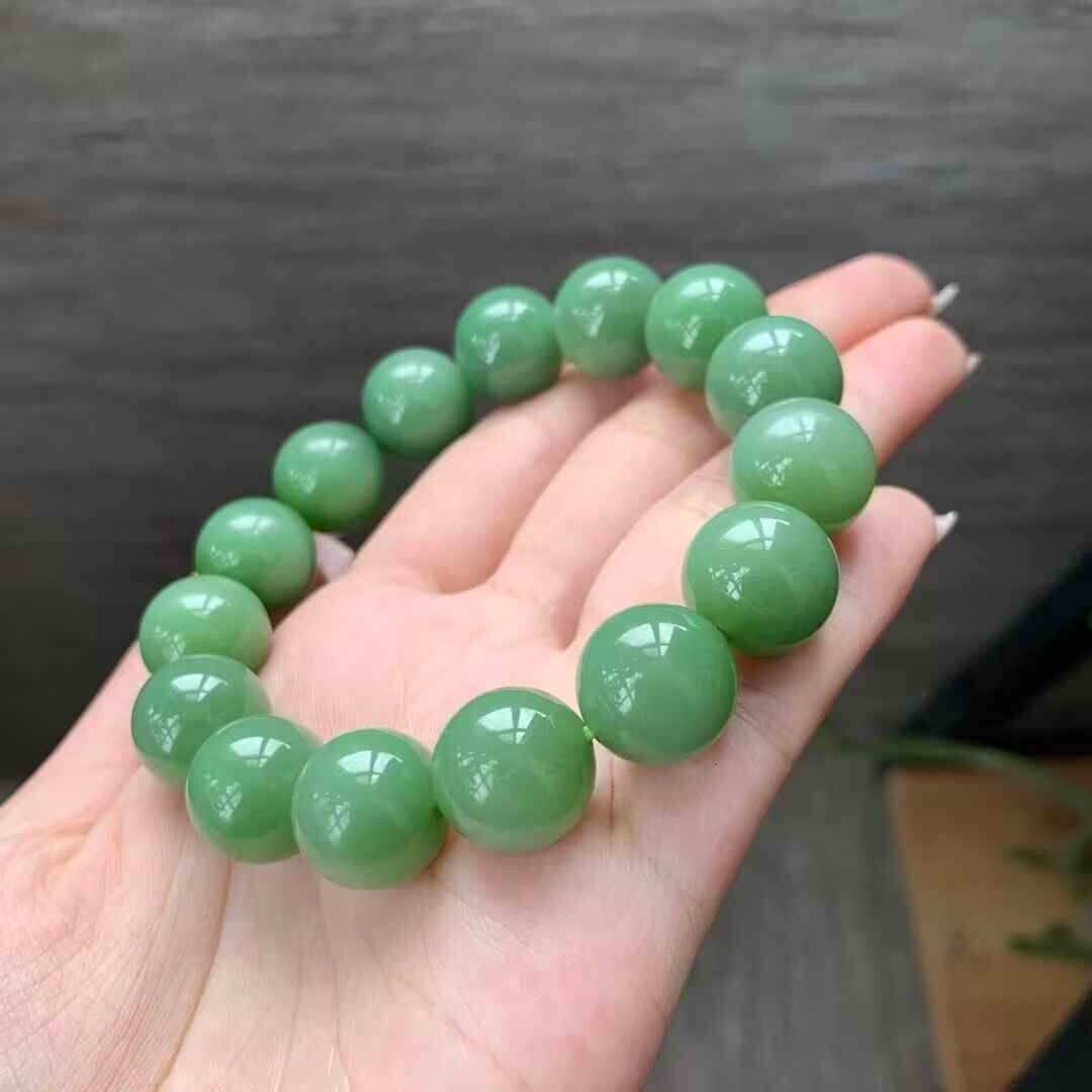 和田玉俄羅斯老料瓷綠手串,料子瓷實油潤,正瓷綠色,顏色很美,整體結構很細,細度過燈,局部可見過燈可見微小結構,無雜裂。