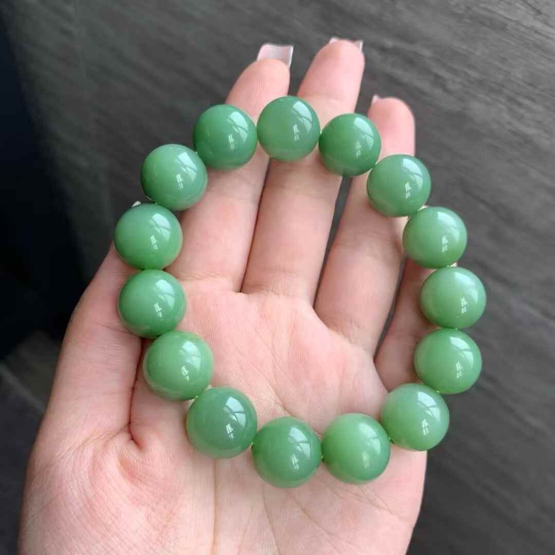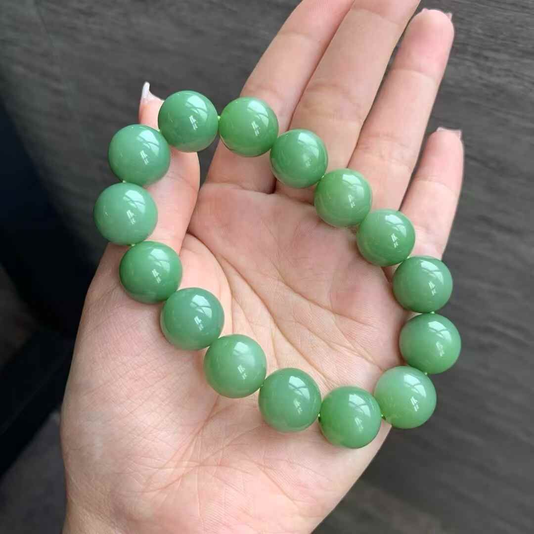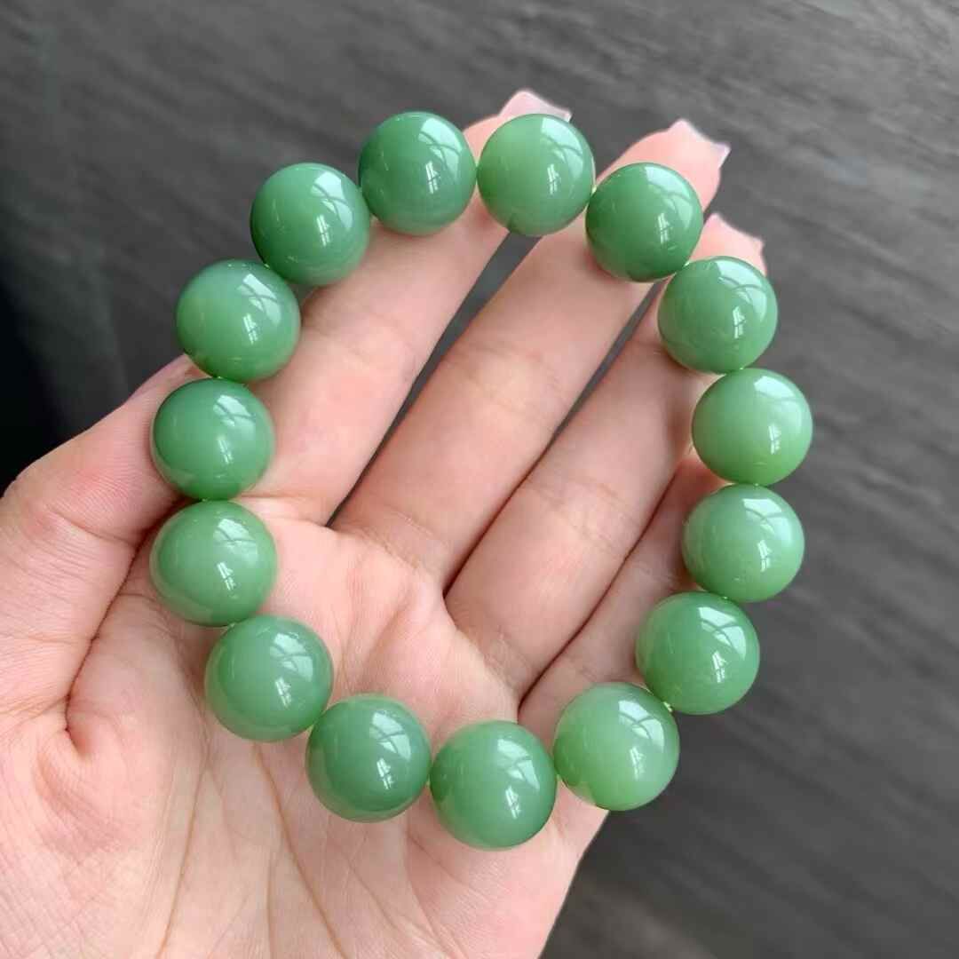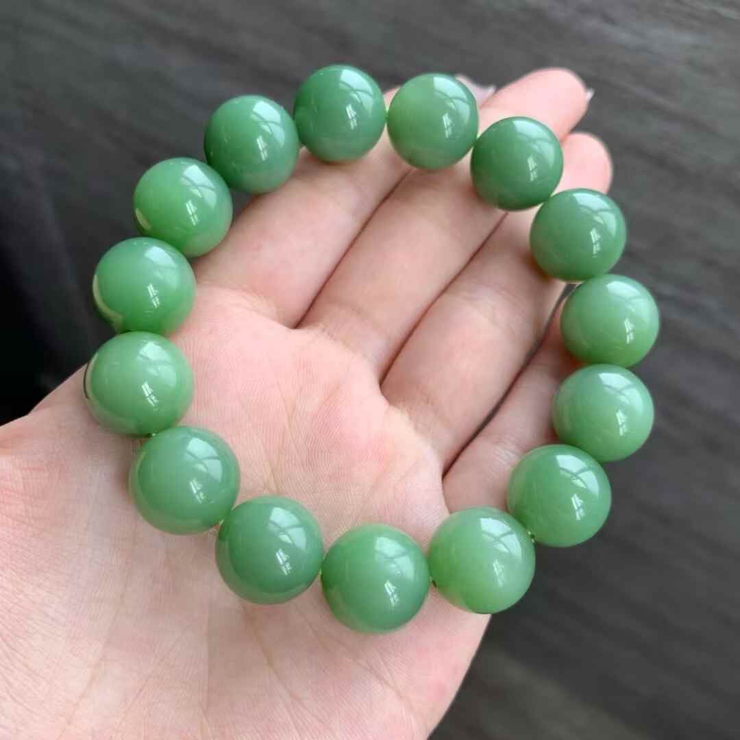 和田玉俄羅斯老料瓷綠手串,料子瓷實油潤,正瓷綠色,顏色很美,整體結構很細,細度過燈,局部可見過燈可見微小結構,無雜裂。