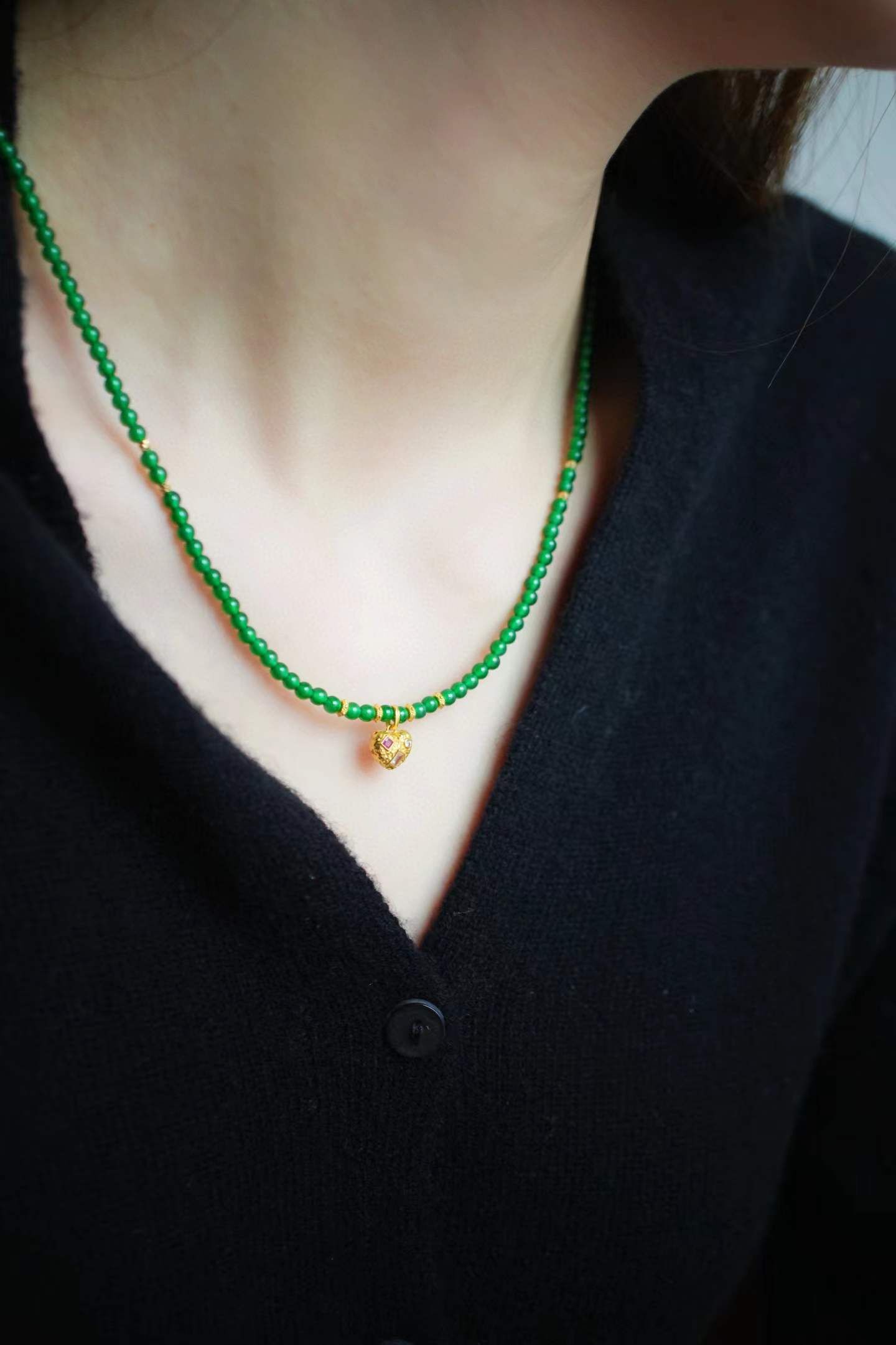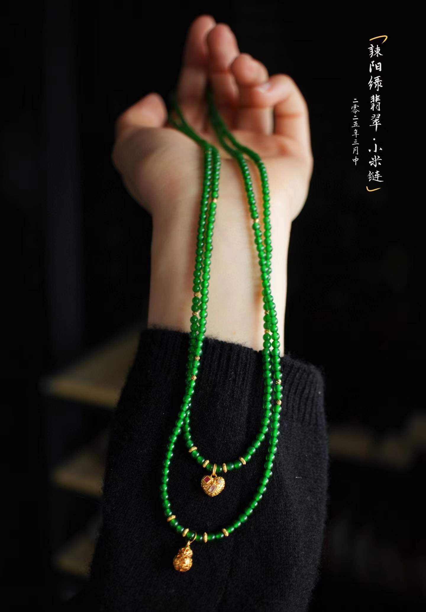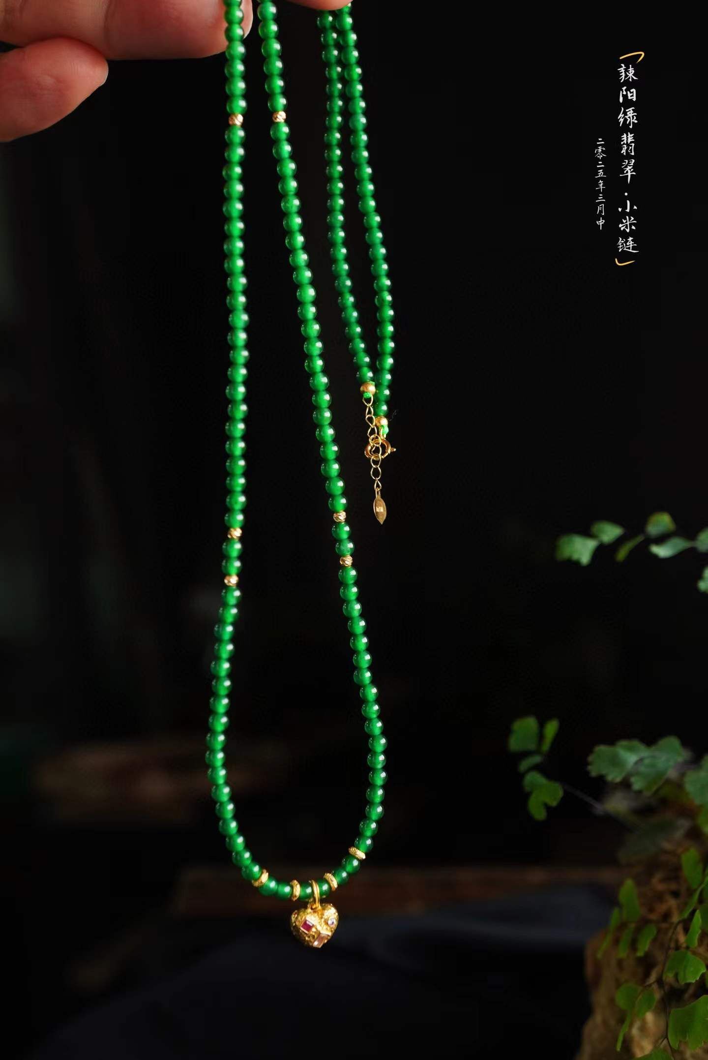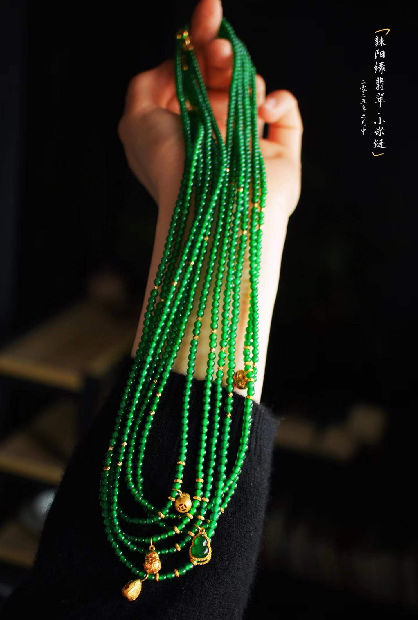 “浪漫心心” 濃陽綠翡翠小米鏈,天然翡翠A玉,冰種辣陽綠,種好色佳,翠意盎然,生機勃勃的感覺。