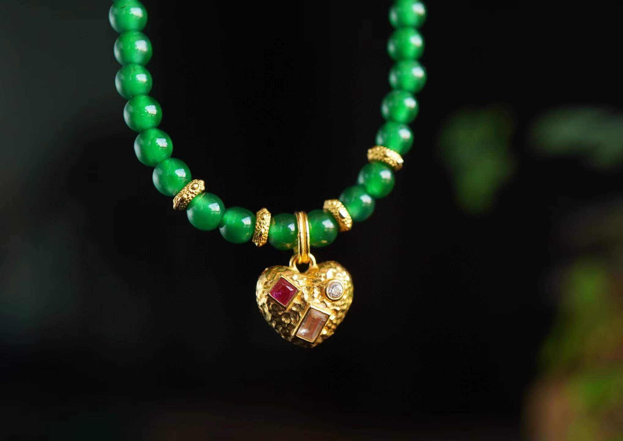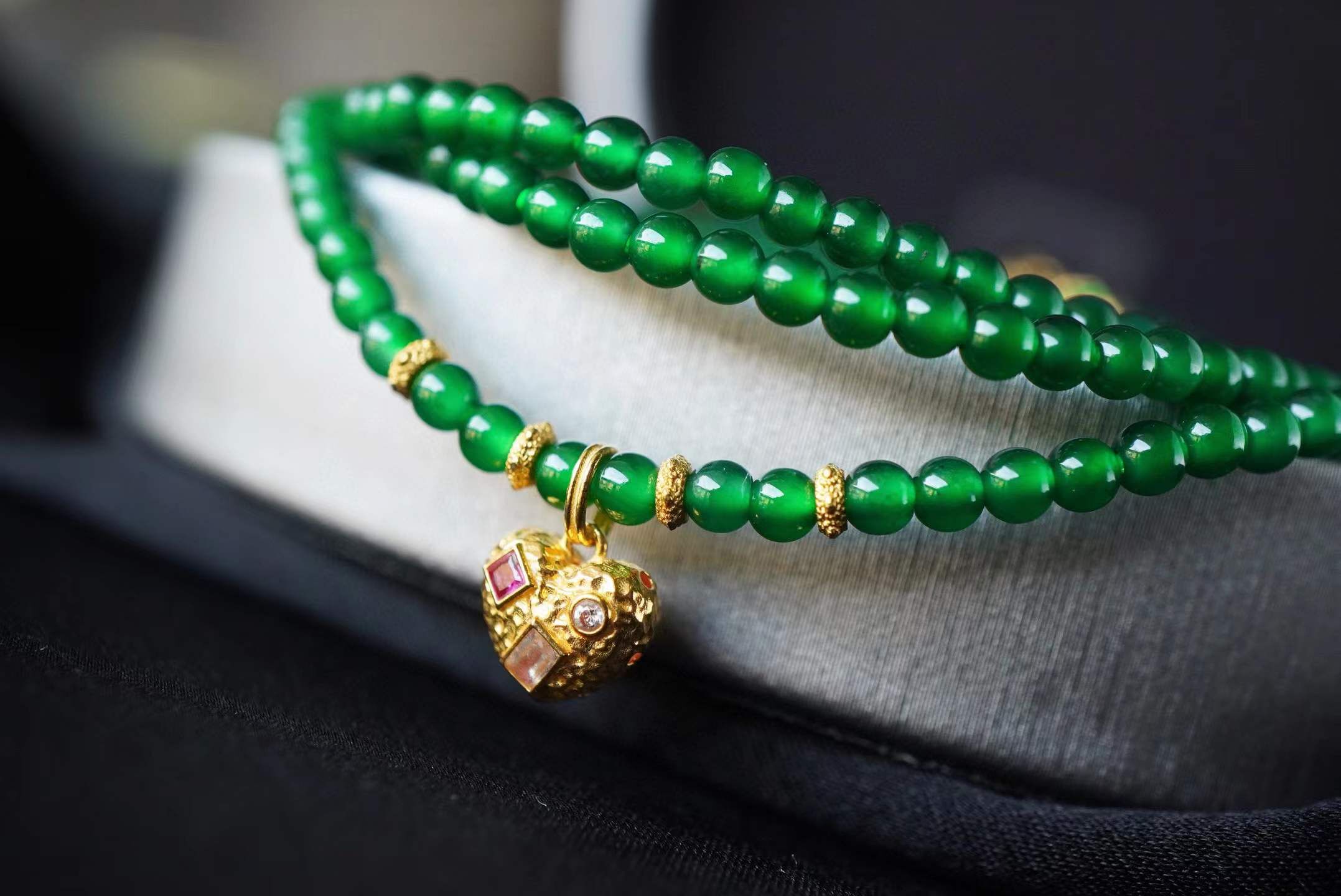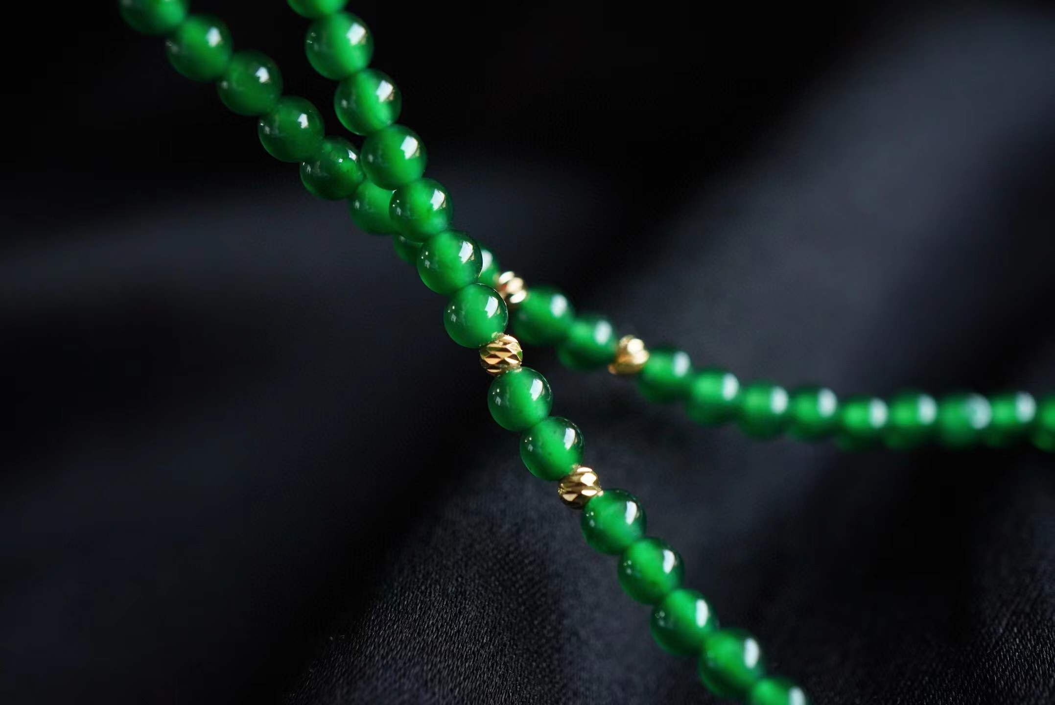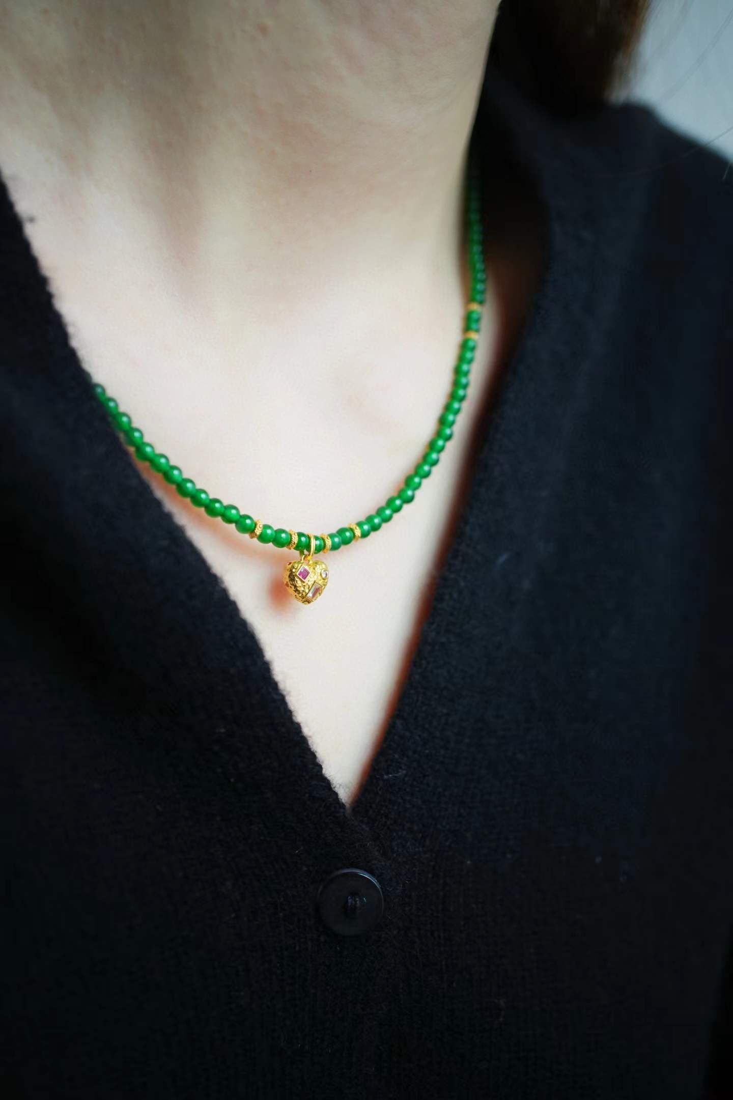 “浪漫心心” 濃陽綠翡翠小米鏈,天然翡翠A玉,冰種辣陽綠,種好色佳,翠意盎然,生機勃勃的感覺。