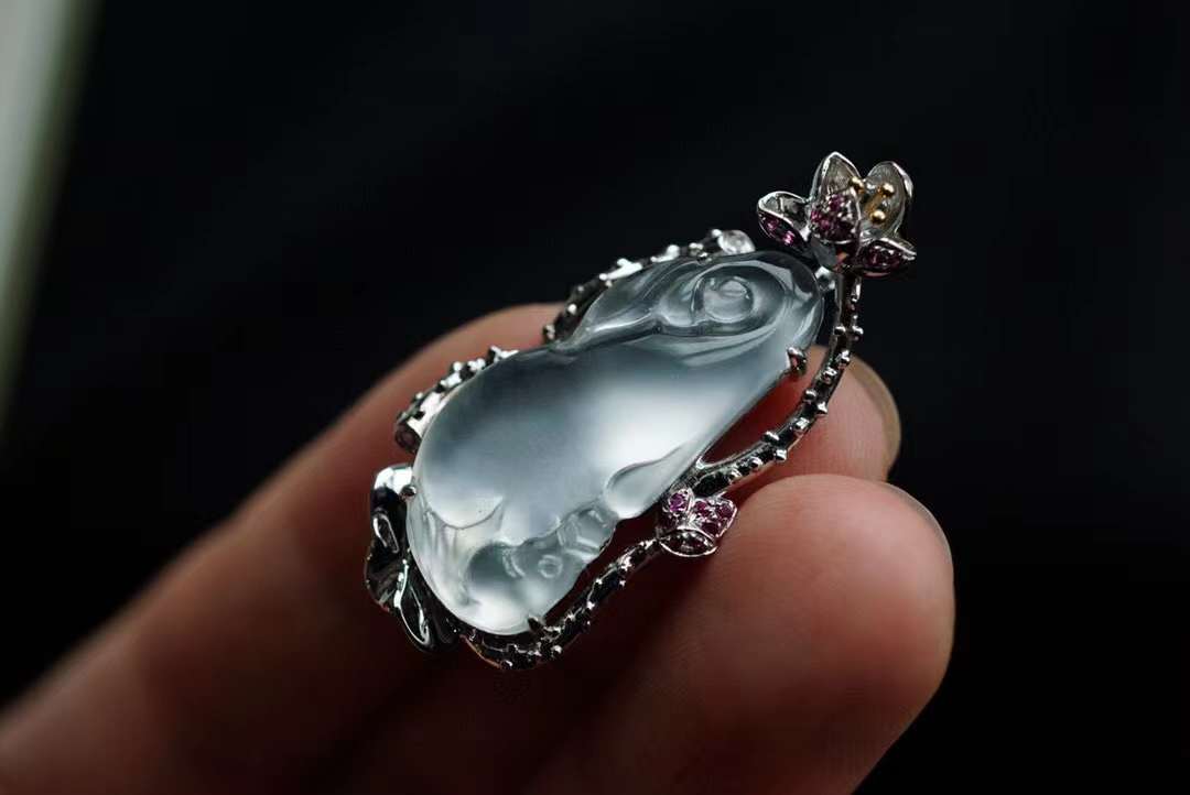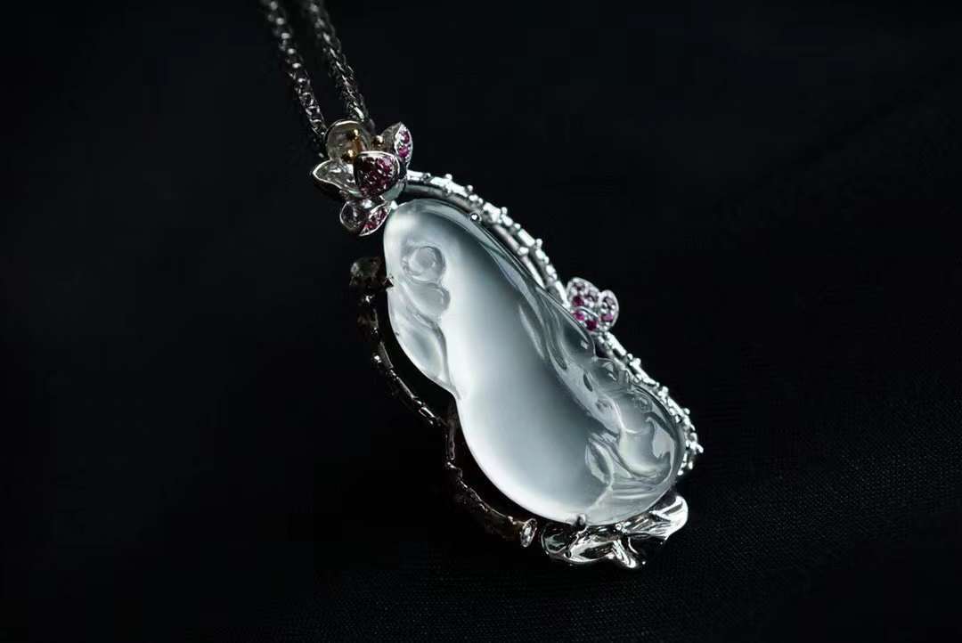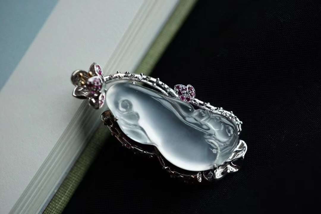 天然翡翠A玉,比玻璃種還玻璃種的剛白料。冰透,起剛性光,泠冽,純淨,猶如一塊寒冰!雕刻一尾錦鯉躍然於蓮下,生動而富有意趣。寓為:連年有餘。18K金、鑽石、紅寶石鑲嵌。