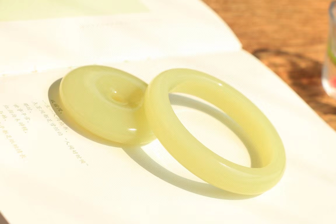 新疆和田玉若羌黃口料套鐲,濃鬱雞油黃,肉質溫潤細膩,黃色清雅舒適,乾淨純正,鐲型飽滿圓潤,扳指同料子所出,佩戴服帖舒適,整體完美。黃口料一般裂多,極難出手鐲,加上雞油黃的料子更是少之又少,喜歡一定不要錯過!