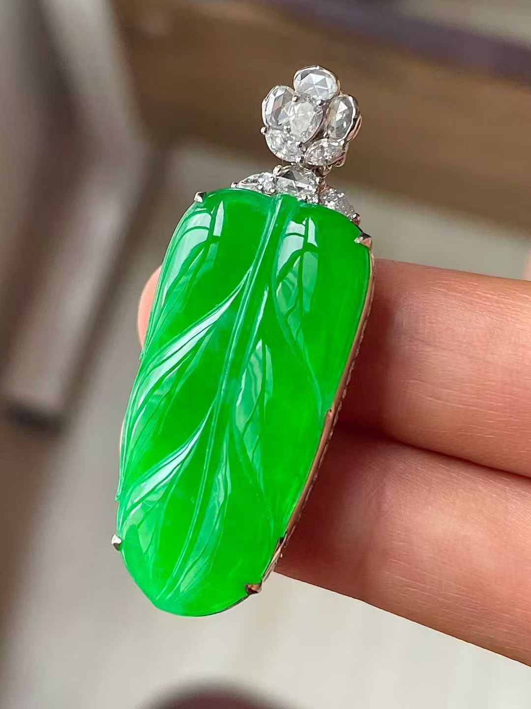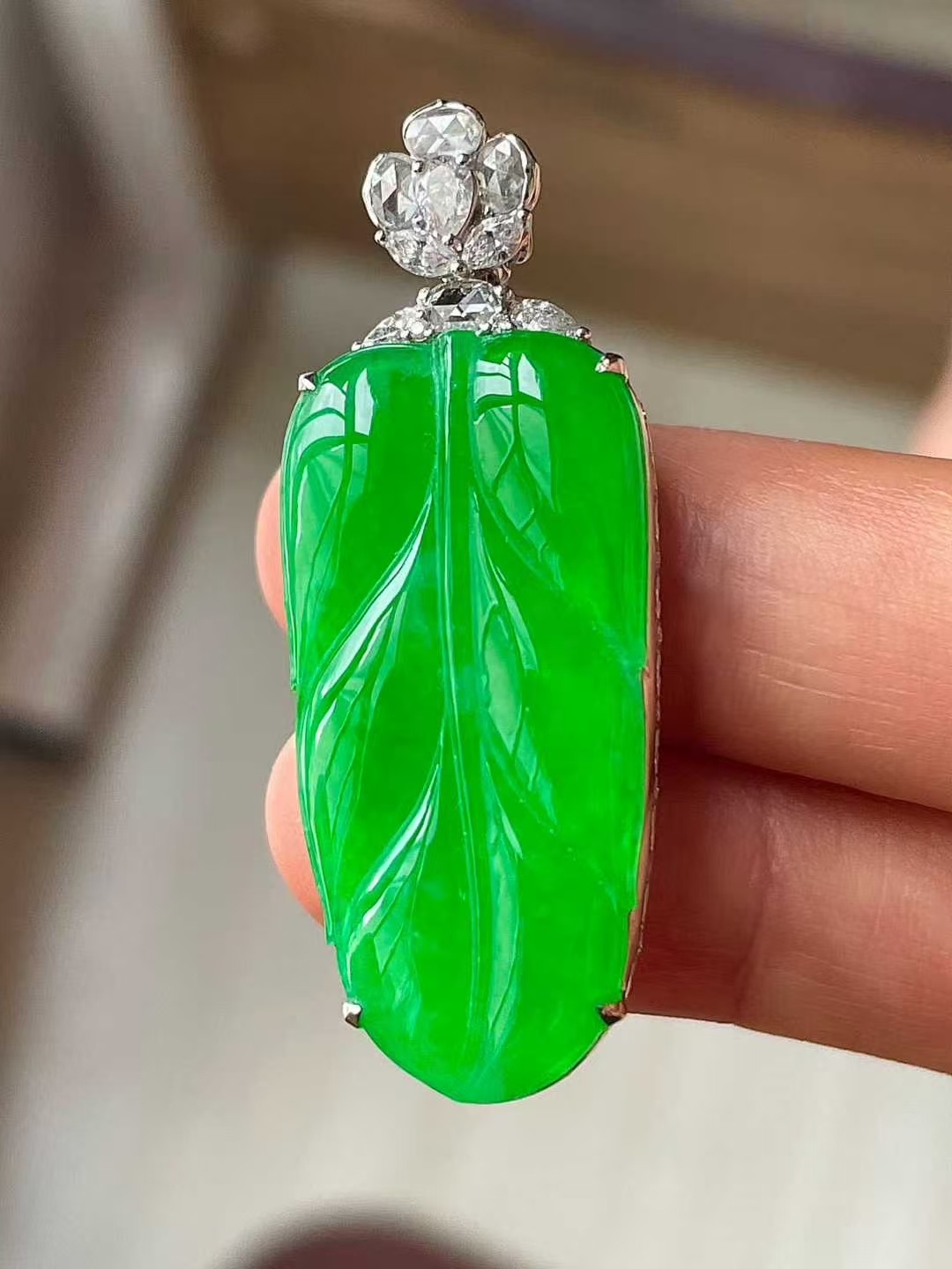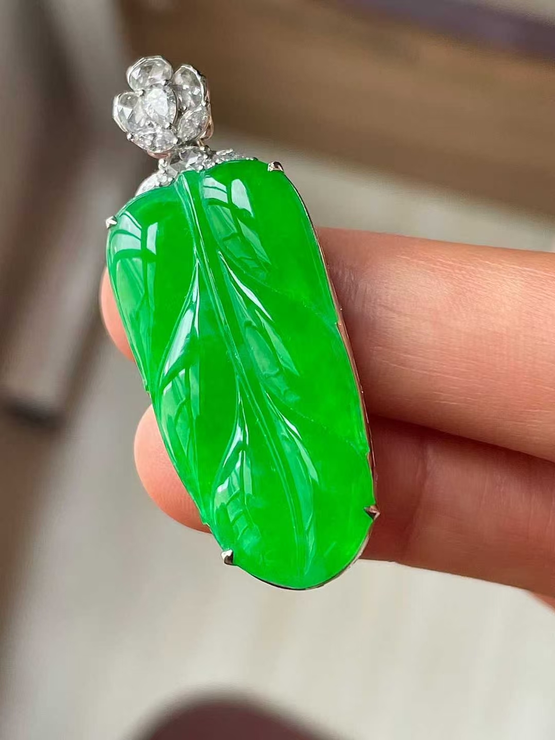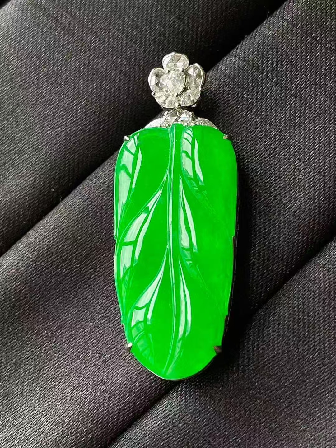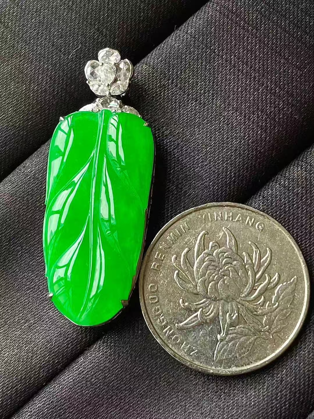 • 翡翠高冰陽綠葉子吊墜,天然翡翠A玉, 緬甸玉, Jade, Jadeite
