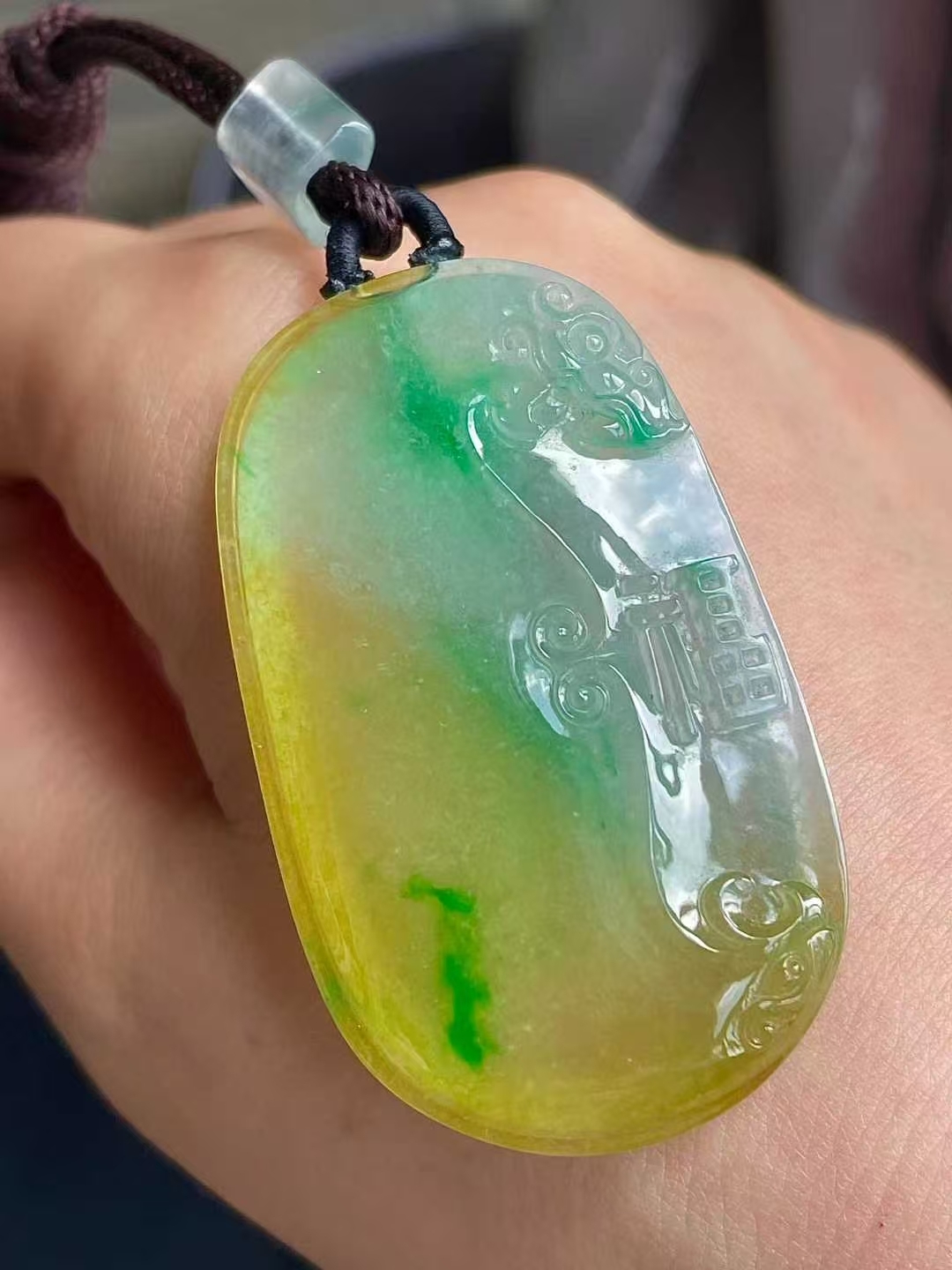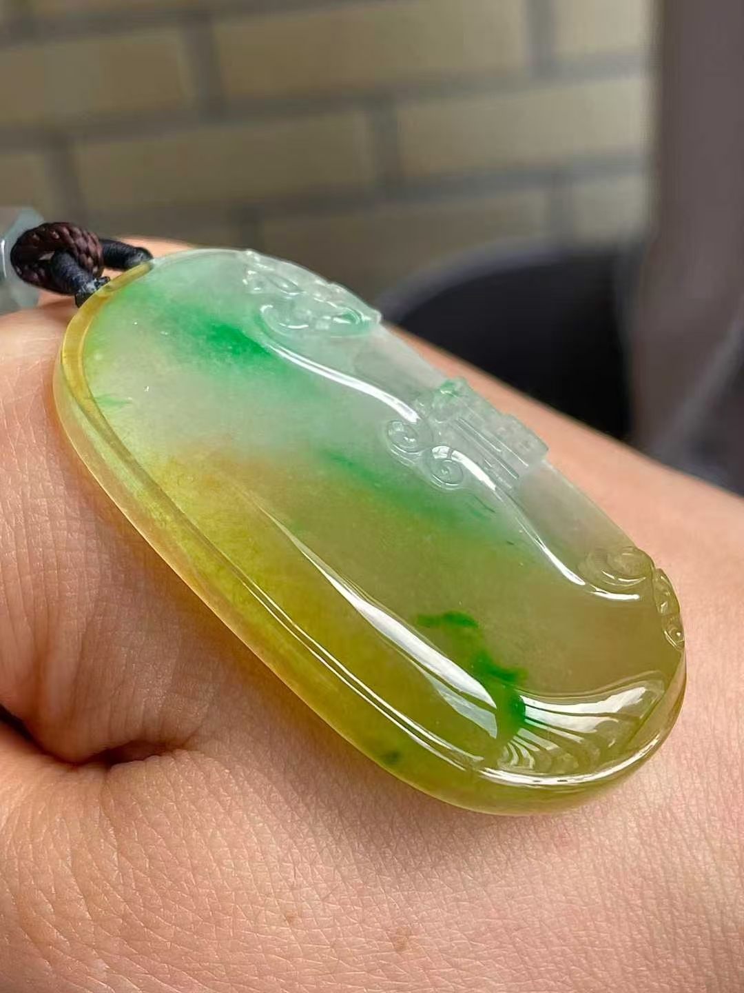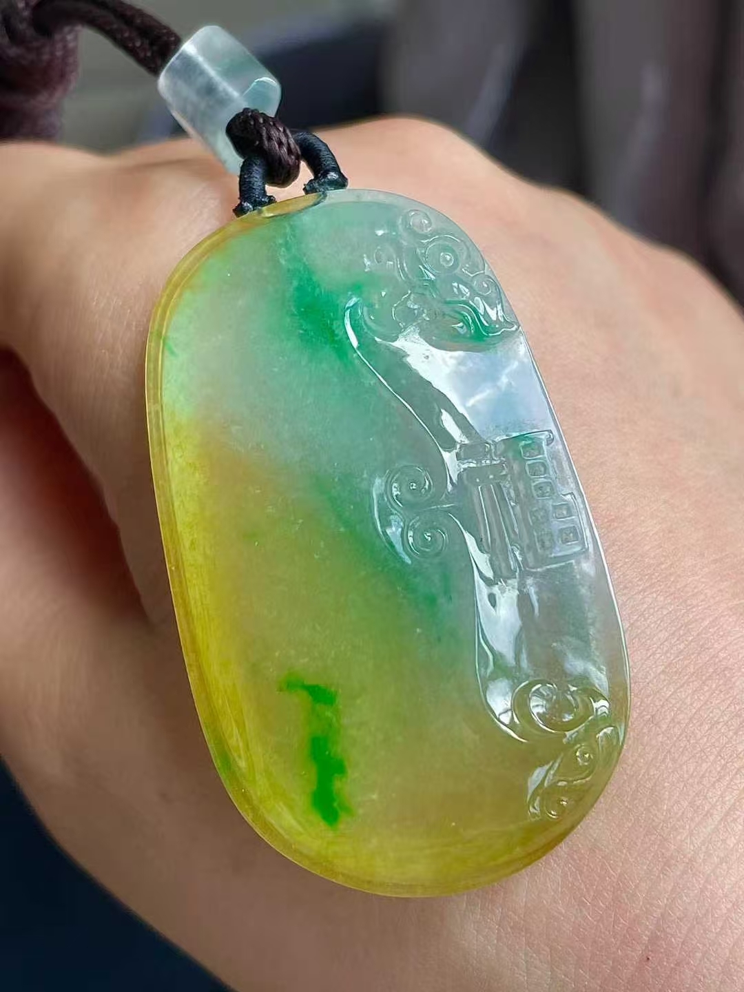 9105557 翡翠冰黃加綠福牌吊墜