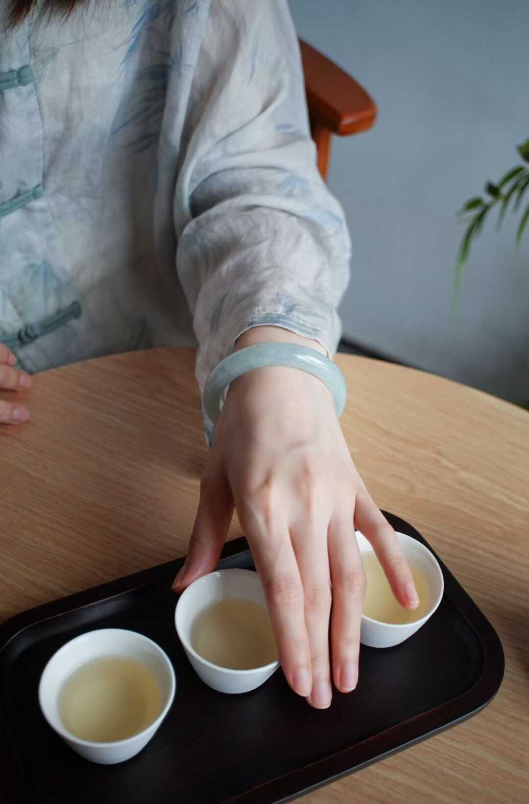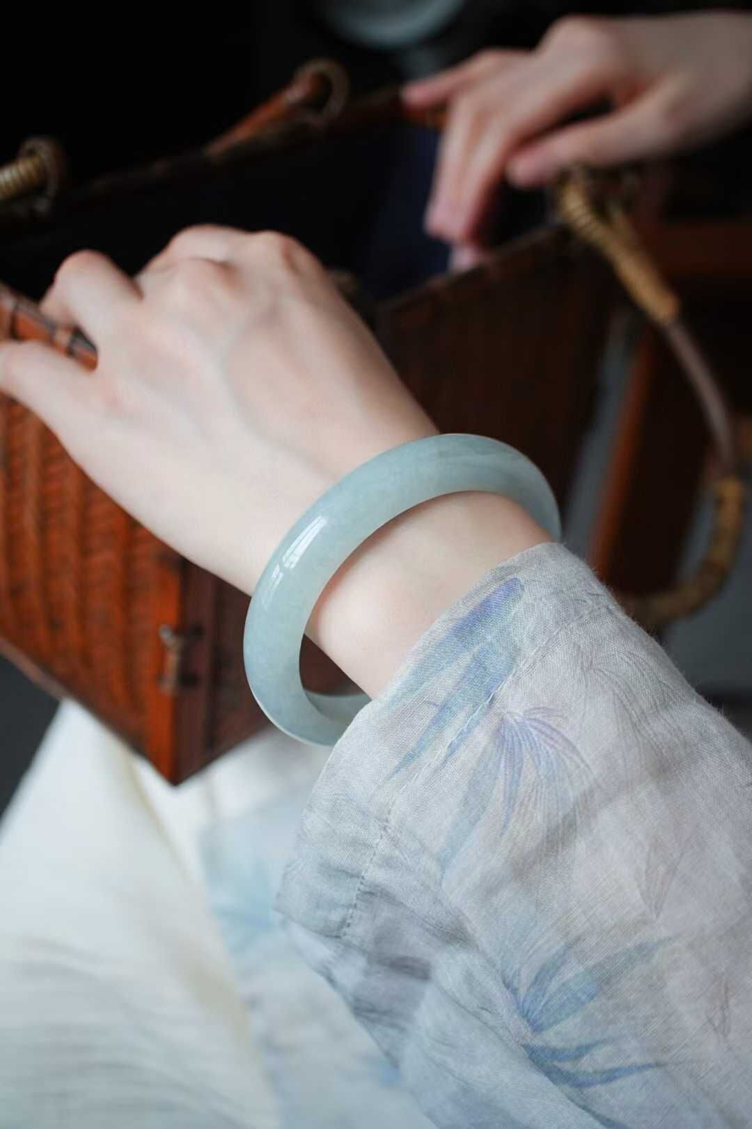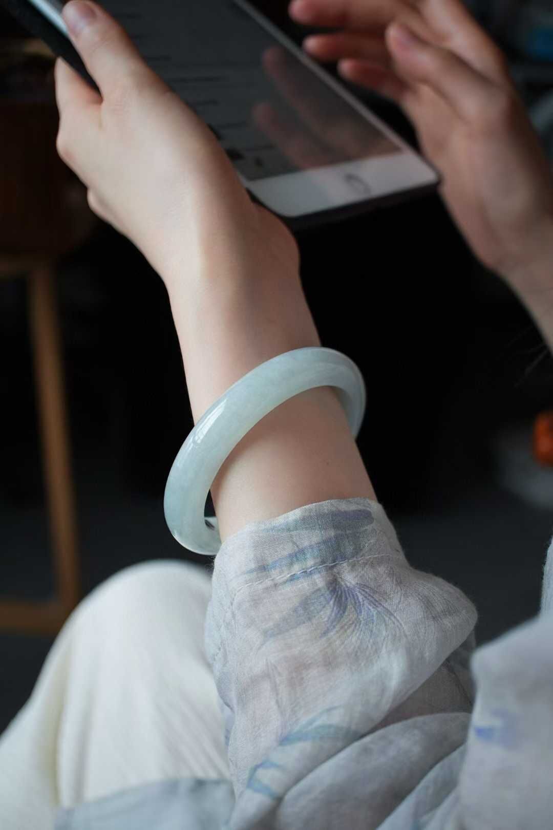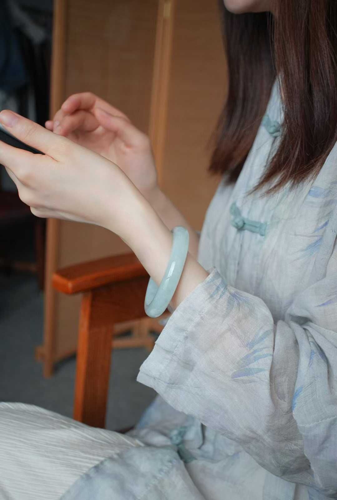 天然翡翠A玉,緬料老坑種,手鐲色調清新脫俗宛如清,種質細膩,水潤潤的質感更顯清麗動人,完美品相,正圈手鐲,佩戴典雅美麗,溫婉大方。
