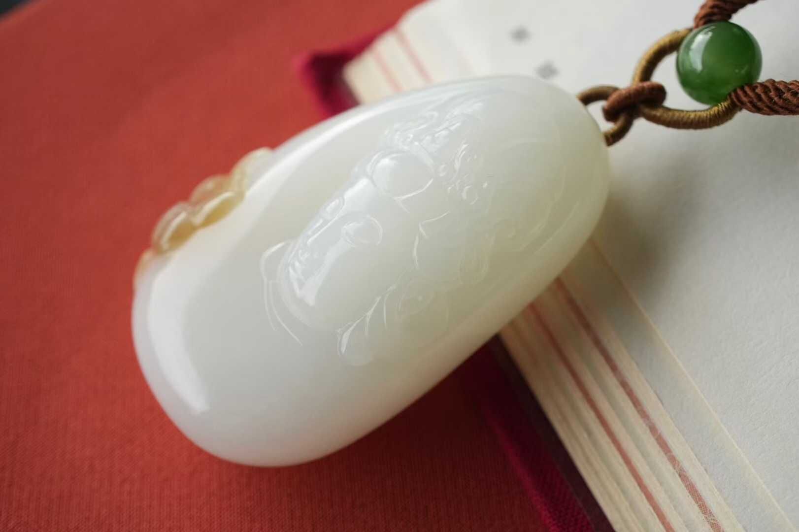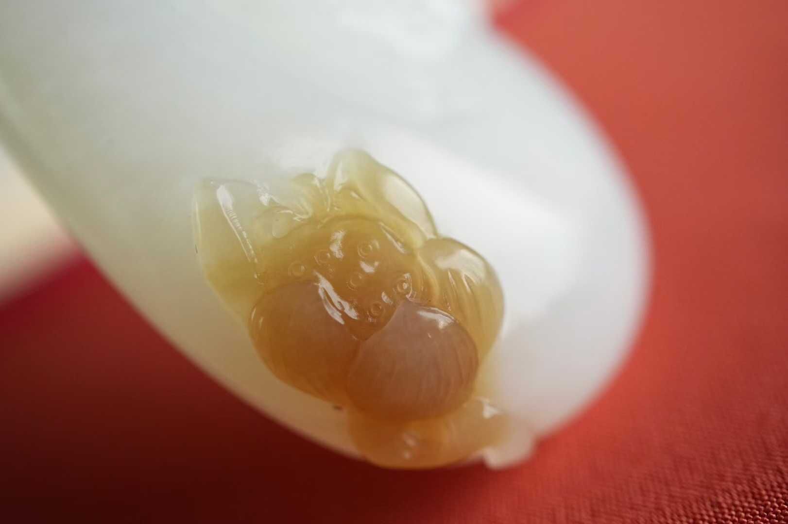 收藏級,和田玉新疆且末糖白料,兩色分明,俏色巧雕,意境絕妙!白肉部分達到羊脂,料子凝實渾厚,肉質細膩油潤脂粉足,猶如年糕一般白而糯,過燈純淨,無棉無水線,無雜無裂完美品相,“工,料,形”都屬上乘作品,非常值得收藏!