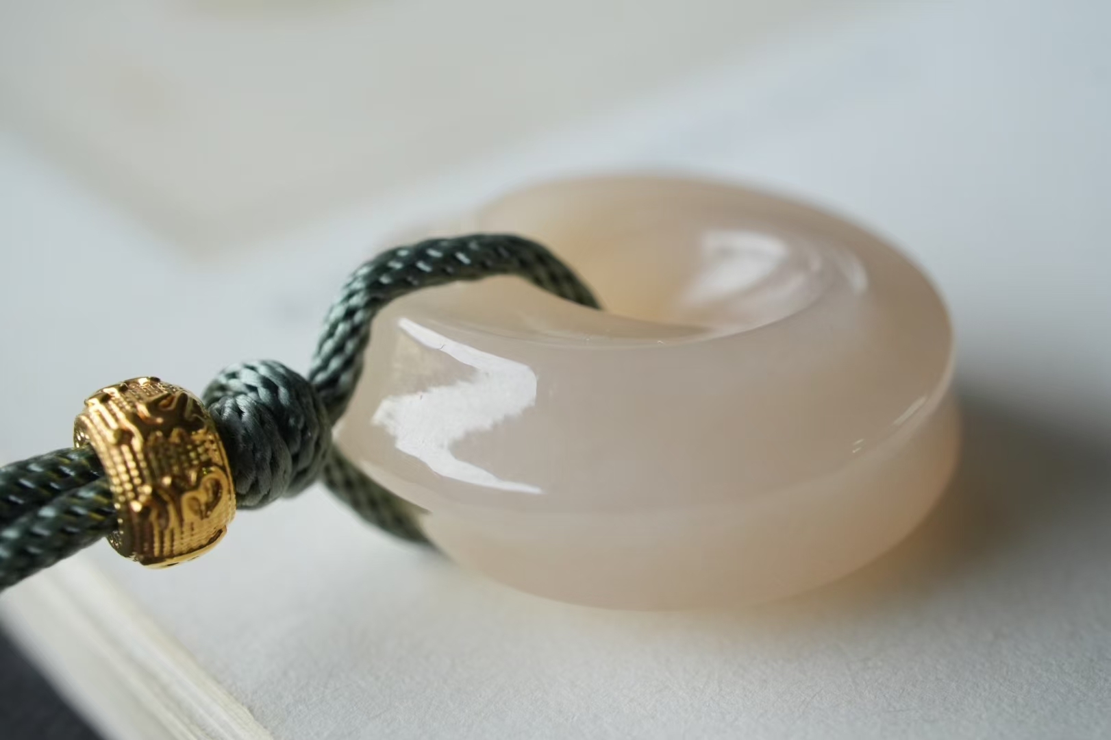 • 和田玉藕粉“莫比烏斯環”掛件,天然和田玉軟玉