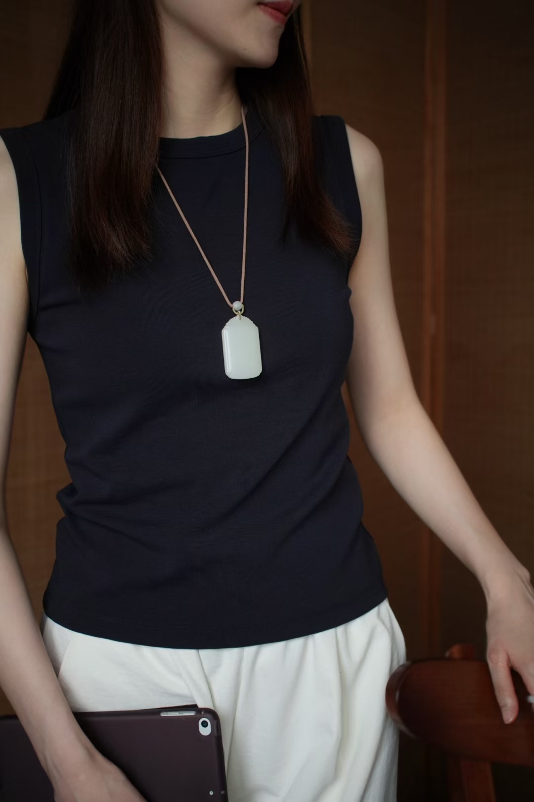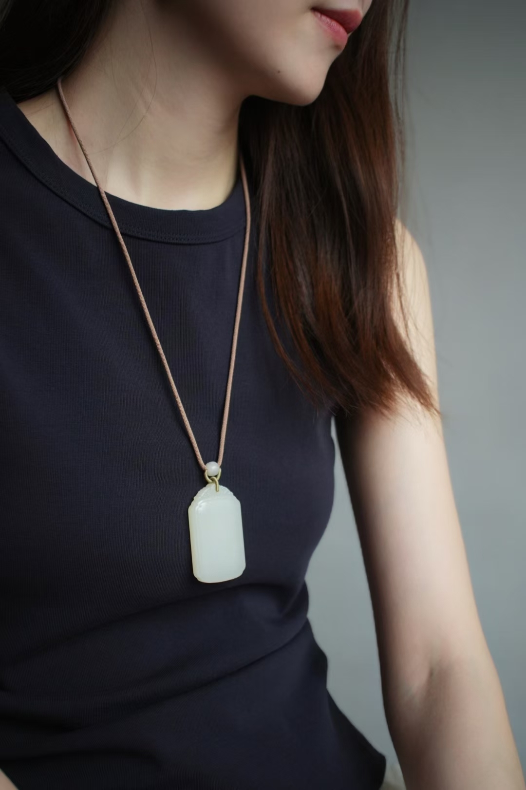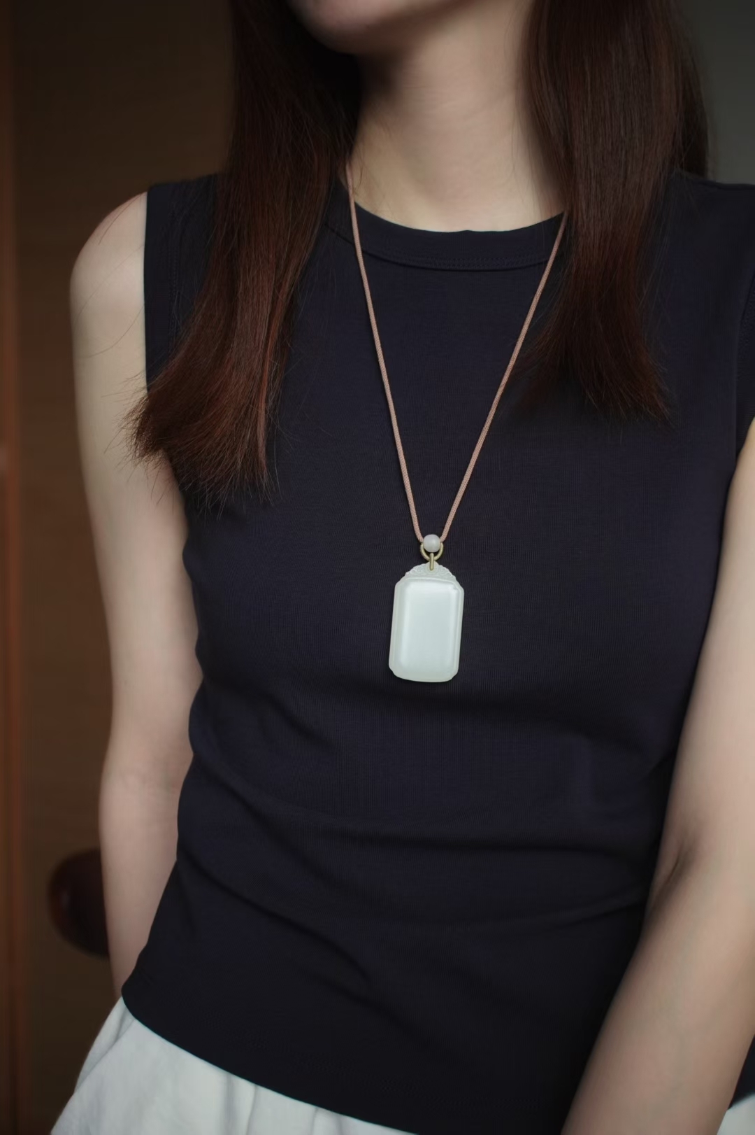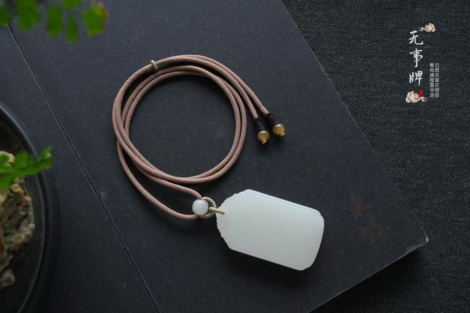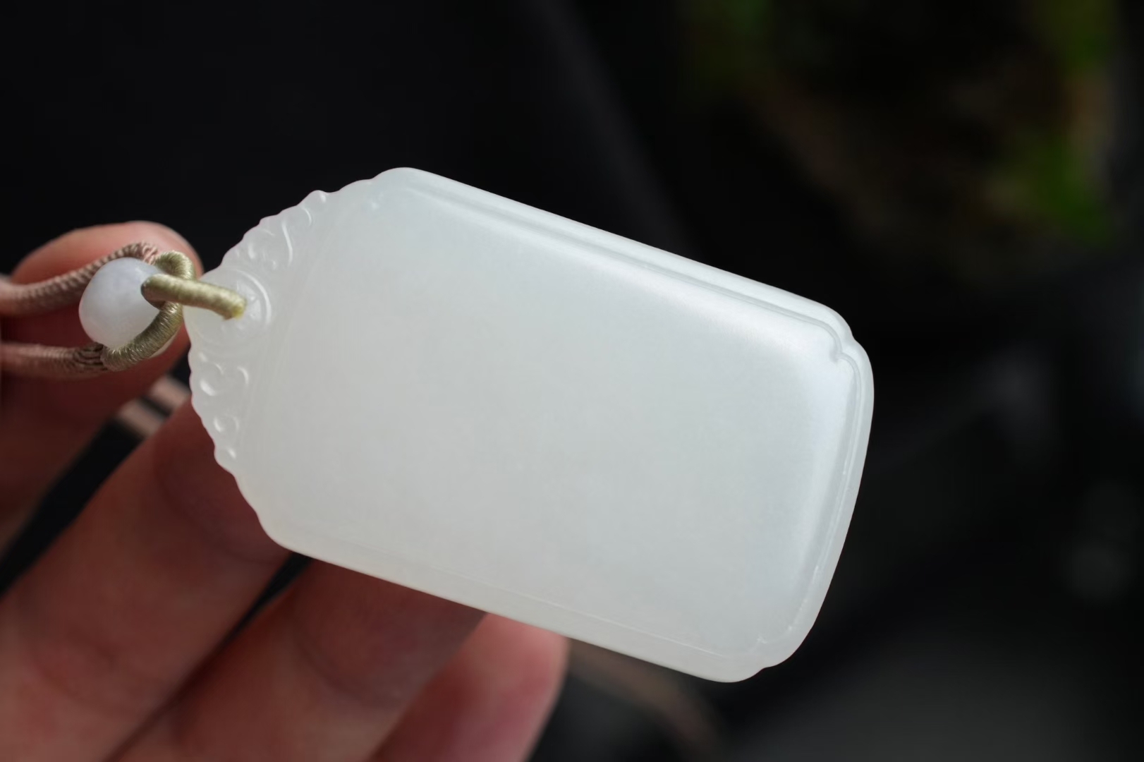 和田玉藕白色,玉色柔雅,結構凝實,細度油性都很贊,牌型方正大氣,過燈非常純淨,無棉無水線,無雜裂完美品相。主牌面無雕無飾寓意平安喜樂,雙面均可佩戴。
