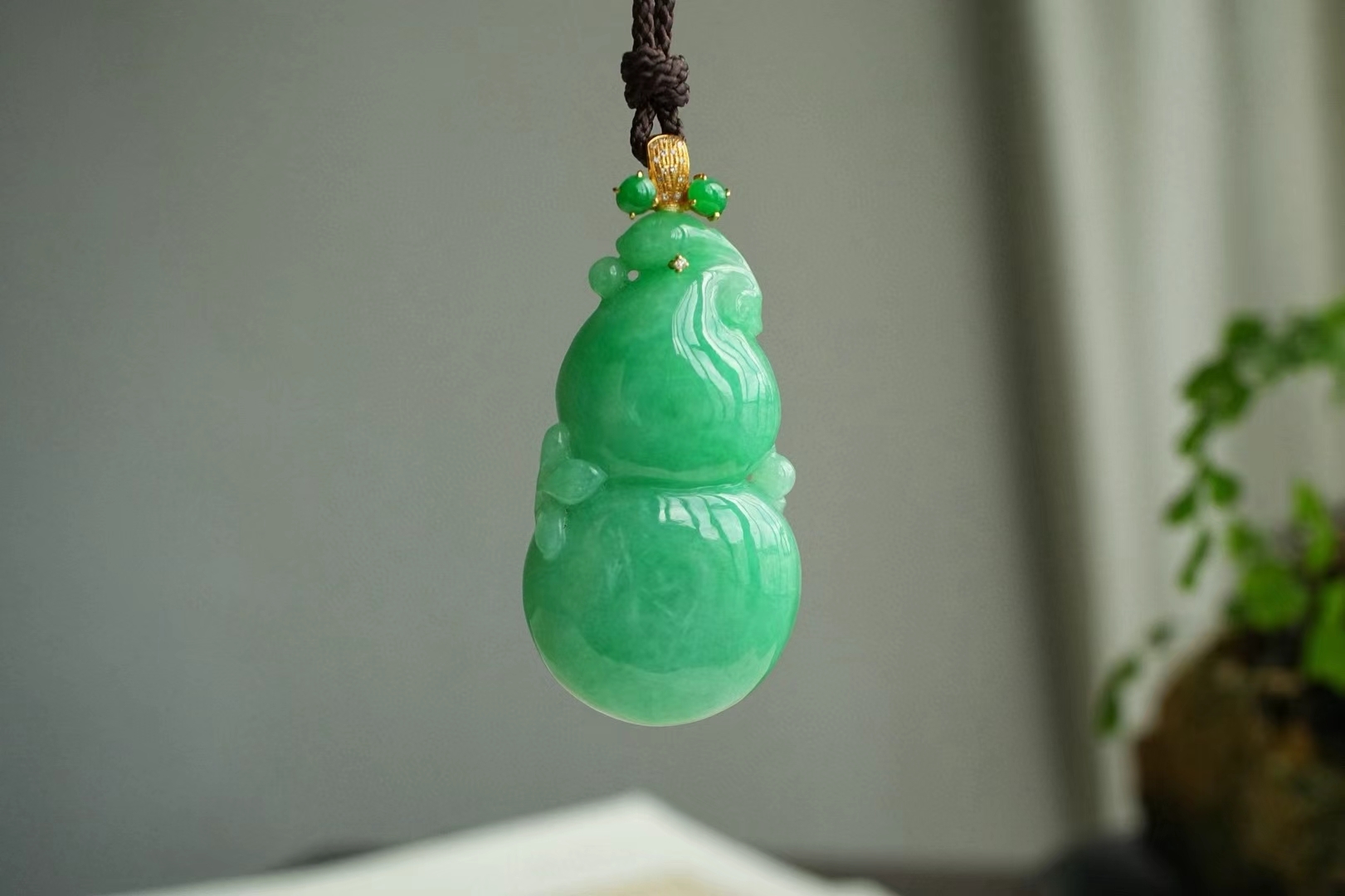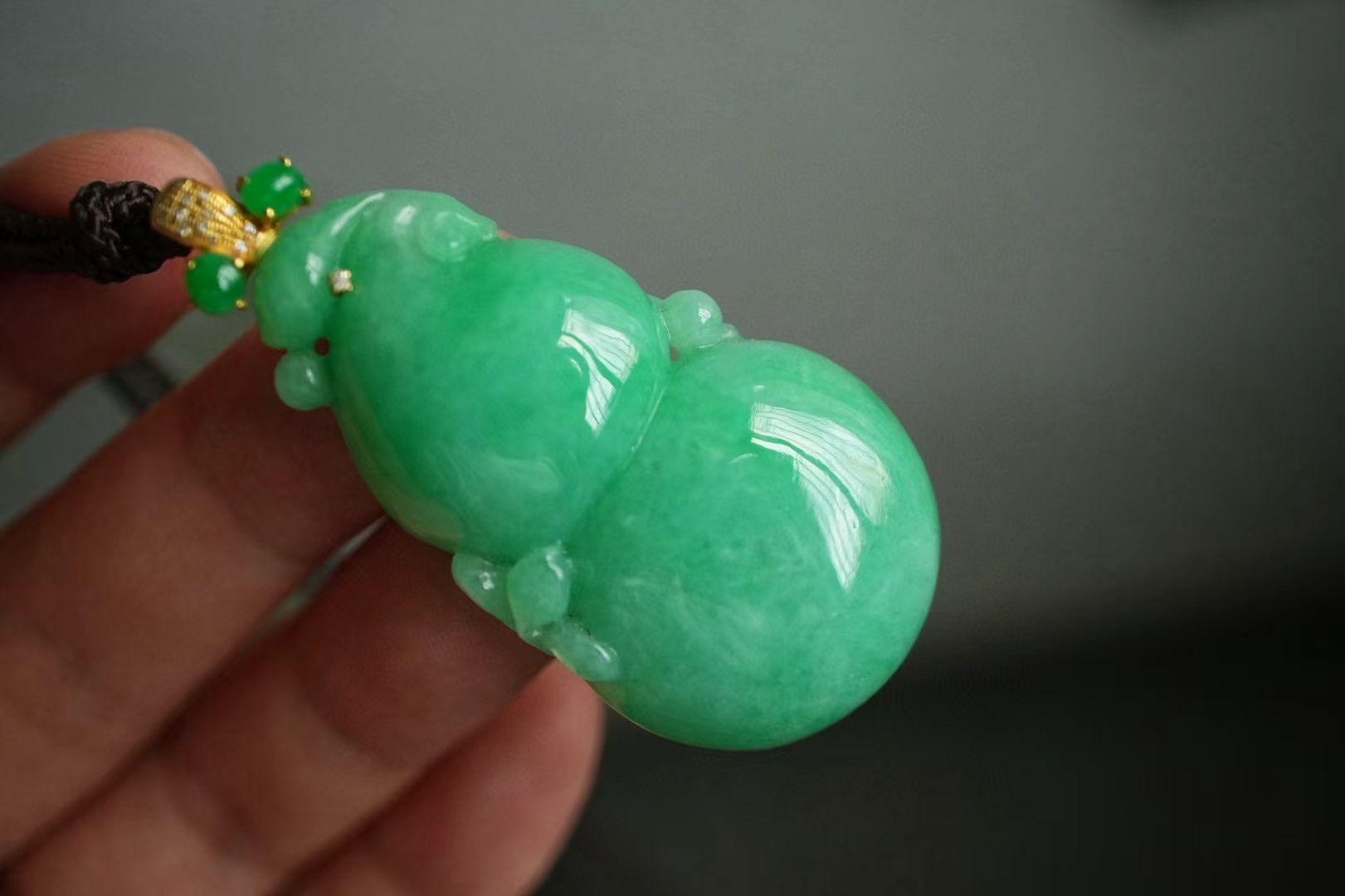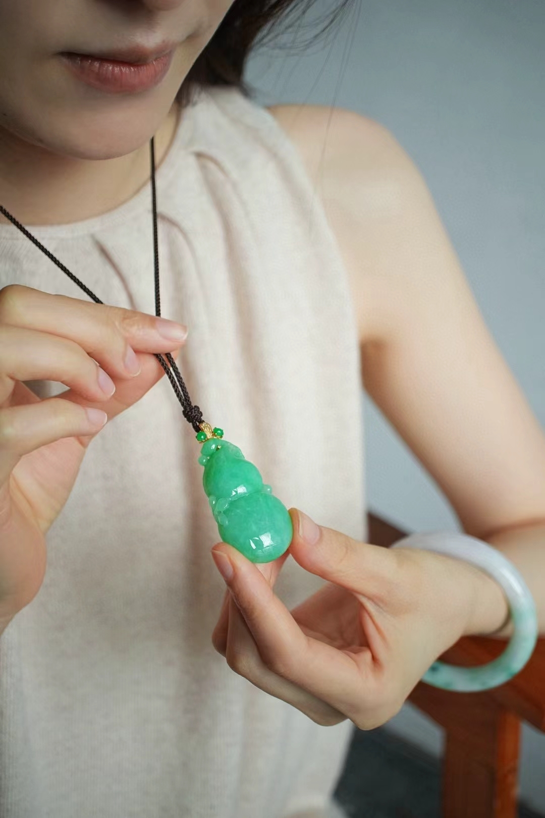 天然翡翠A玉,緬料老坑種,明媚甜美,果陽綠。飽滿厚實的葫蘆,古拙耐看。寓意“福祿雙全”,有福有財。