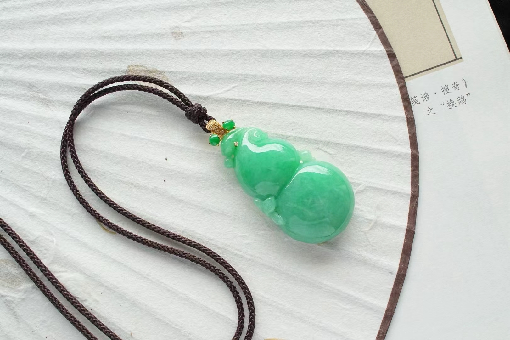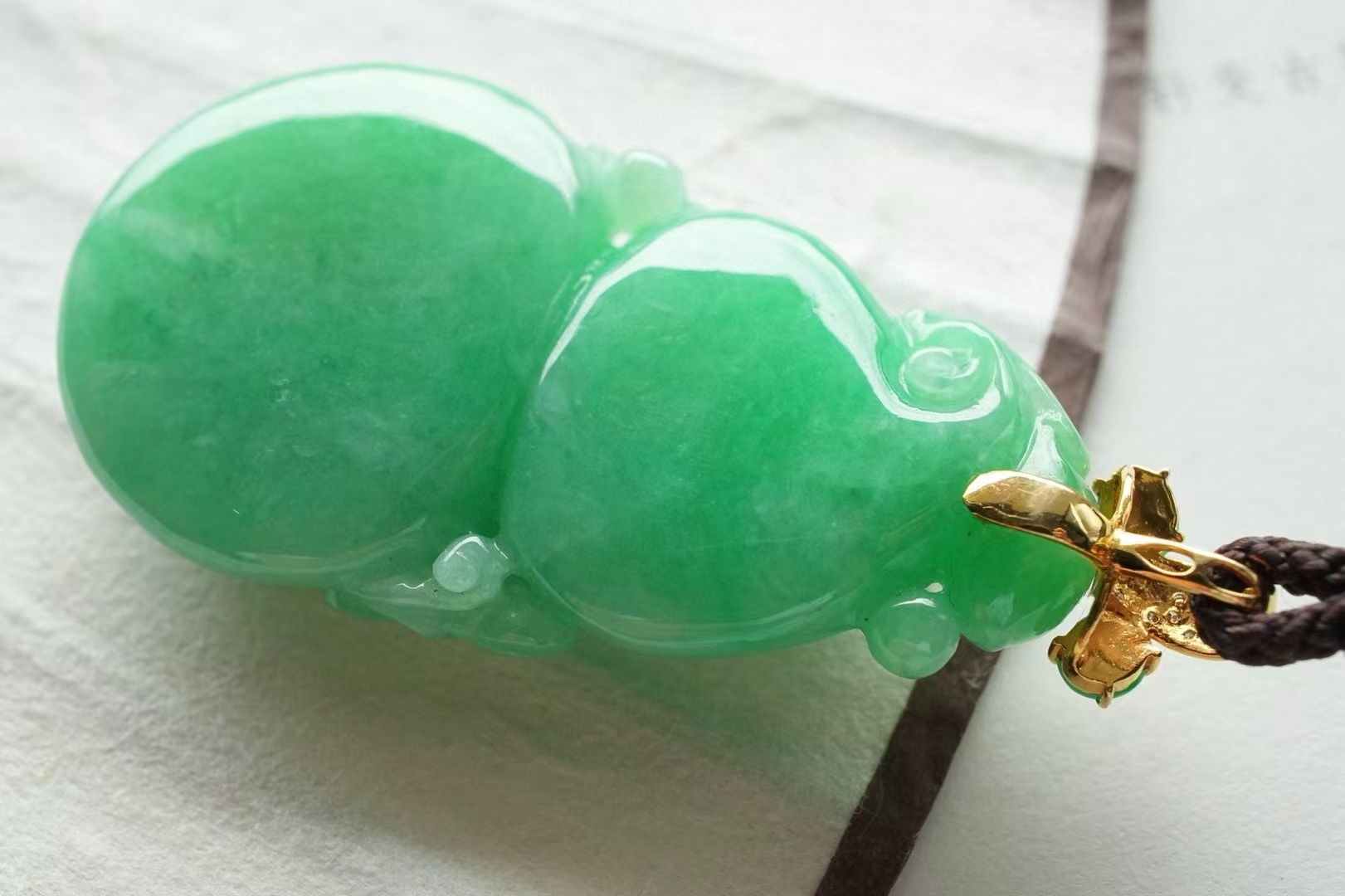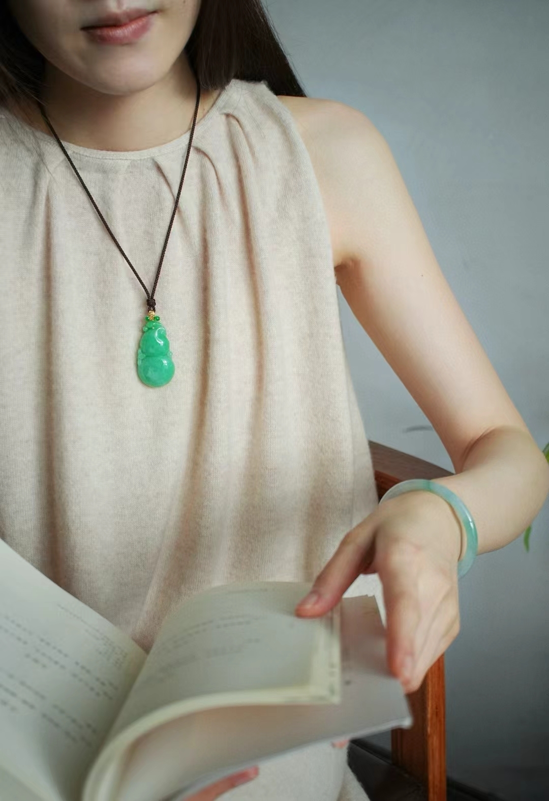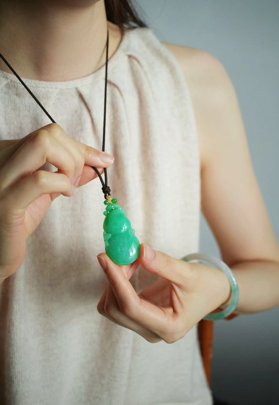 天然翡翠A玉,緬料老坑種,明媚甜美,果陽綠。飽滿厚實的葫蘆,古拙耐看。寓意“福祿雙全”,有福有財。
