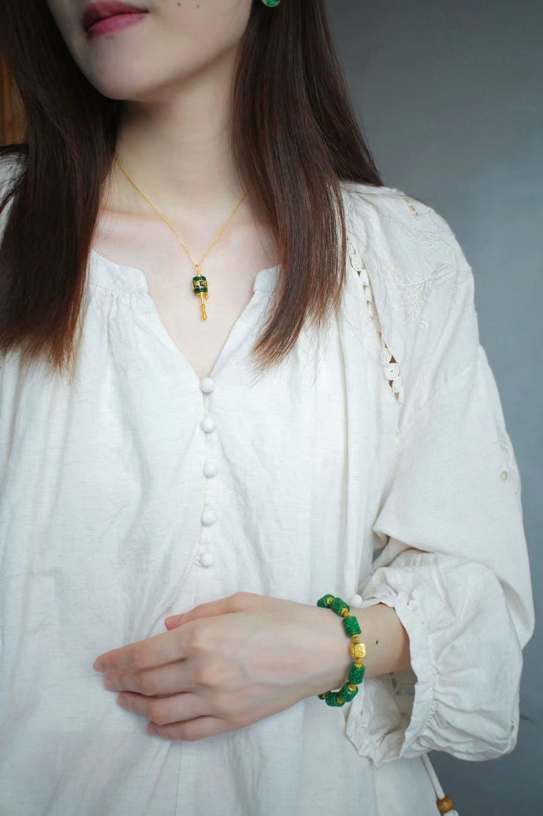 願所念皆如意,緬料乾青翡翠,辣陽綠色路路通,18K金精工打造,六字箴言,吉祥如意,實在太精緻了,編繩也很美!