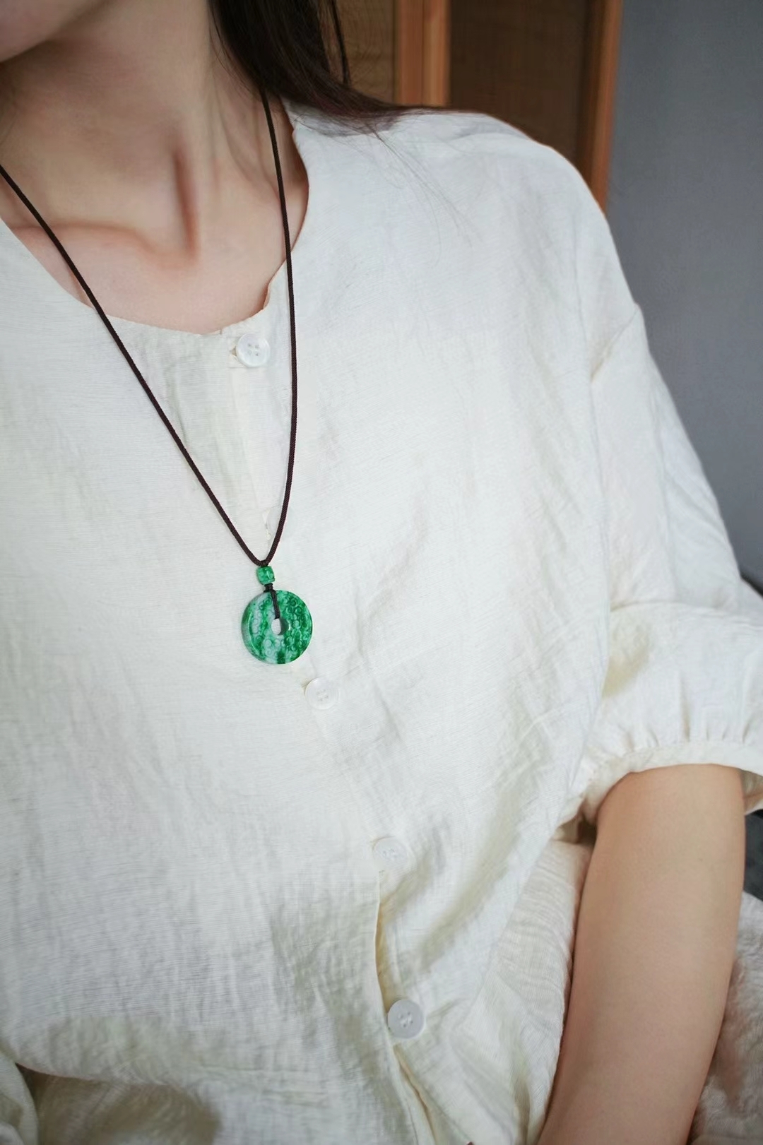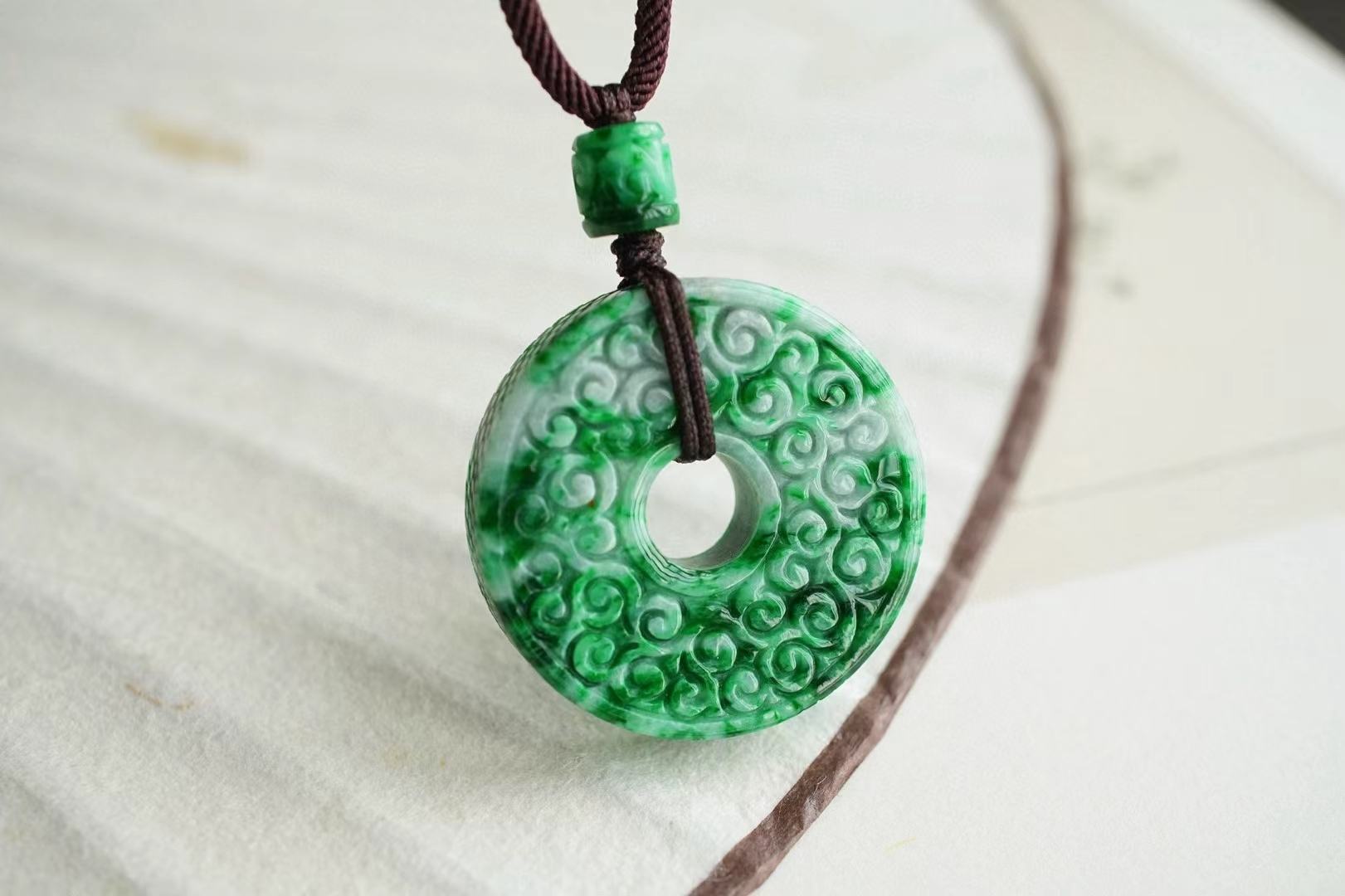天然乾青翡翠平安扣吊墜,天然乾青翡翠,如墨染春山,濃郁陽綠色,雙面雕工,精雕細琢仿古吉祥紋飾,扣芯也做了纏枝紋,韻味十足。厚墩墩的太有質感了!送禮自戴都很推薦。