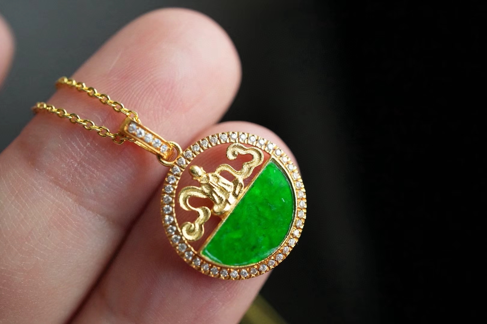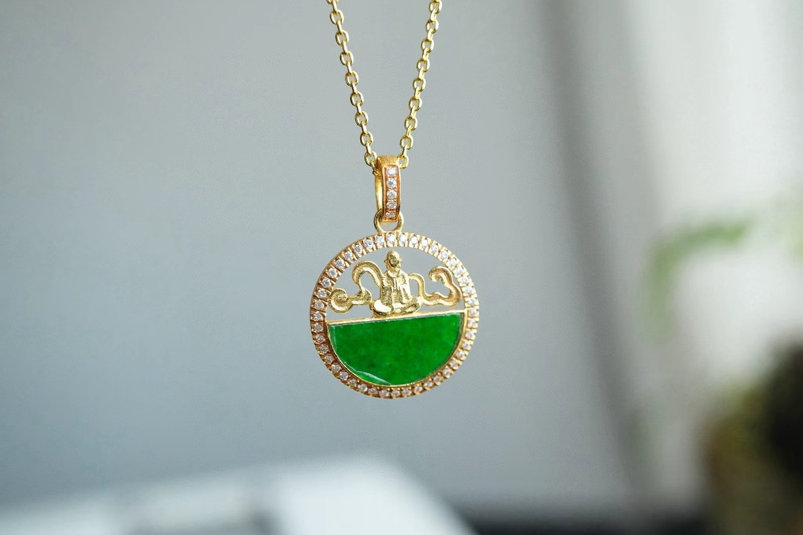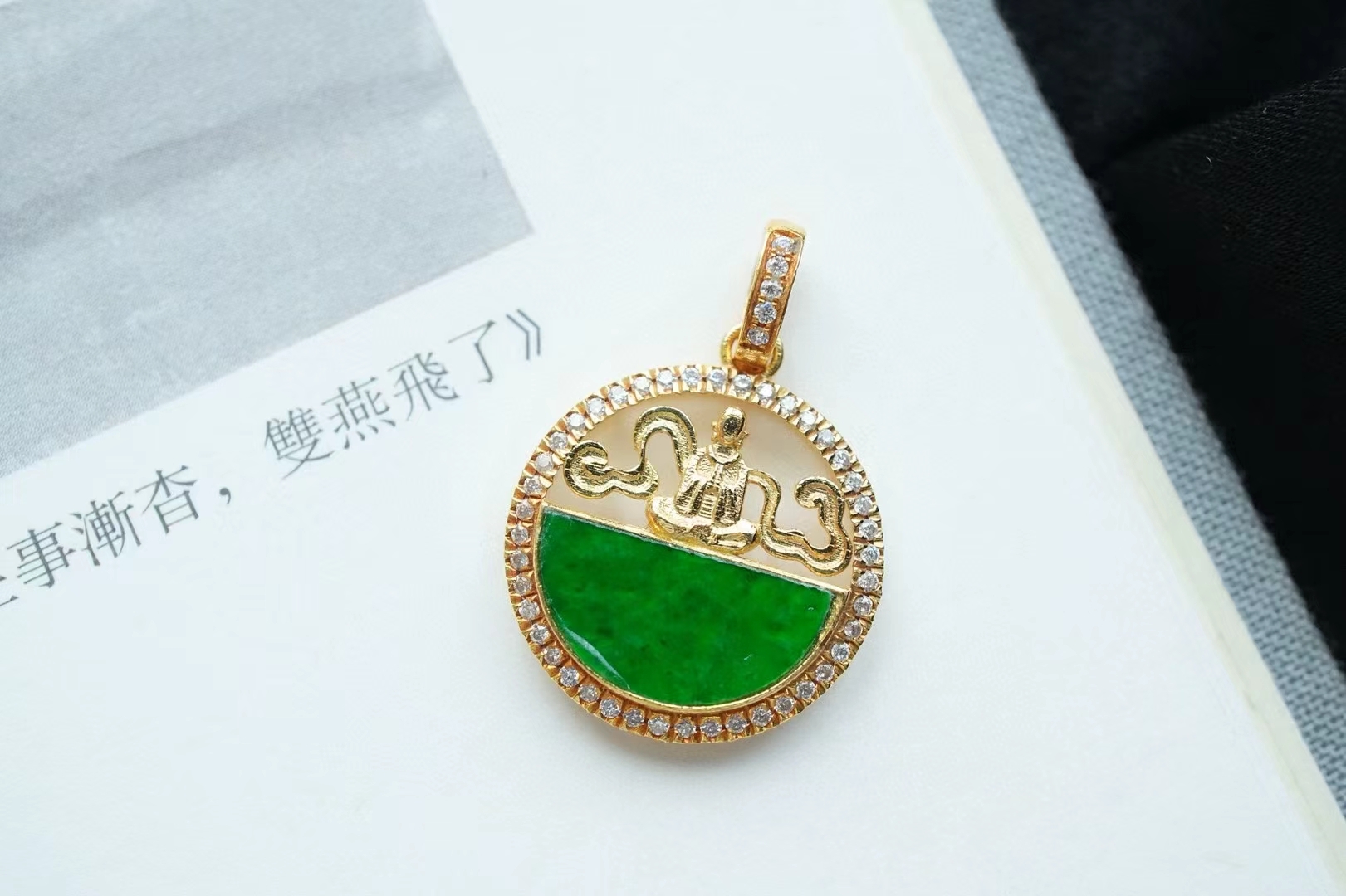 禪意美學設計,“無相佛”寓意:佛本無相,關照內在感受,在禪意中尋找自我。天然翡翠A玉,18K金鑽石鑲嵌,配萬能扣,辣陽綠翡翠裸面,萬能扣設計,可任意搭配。