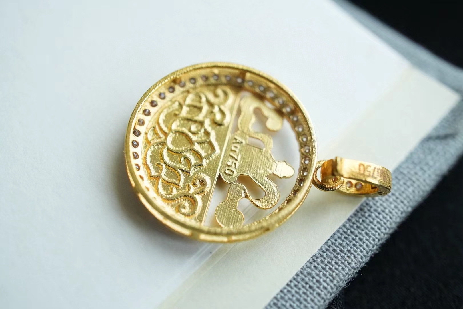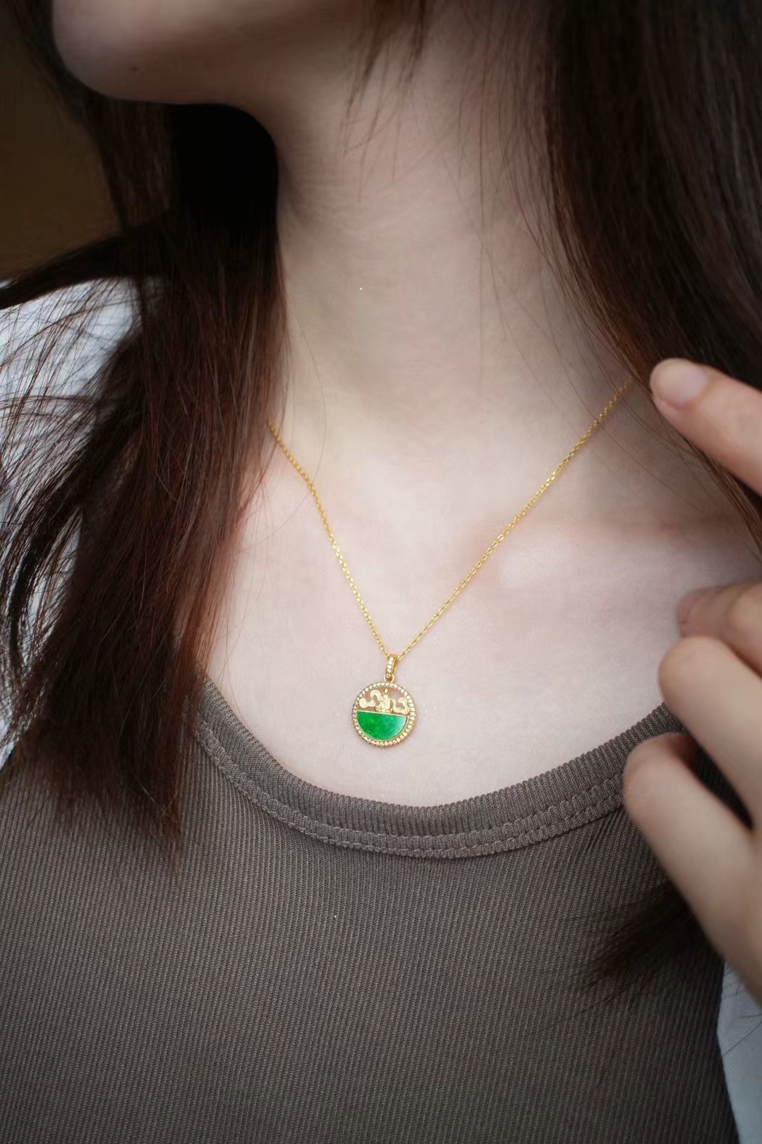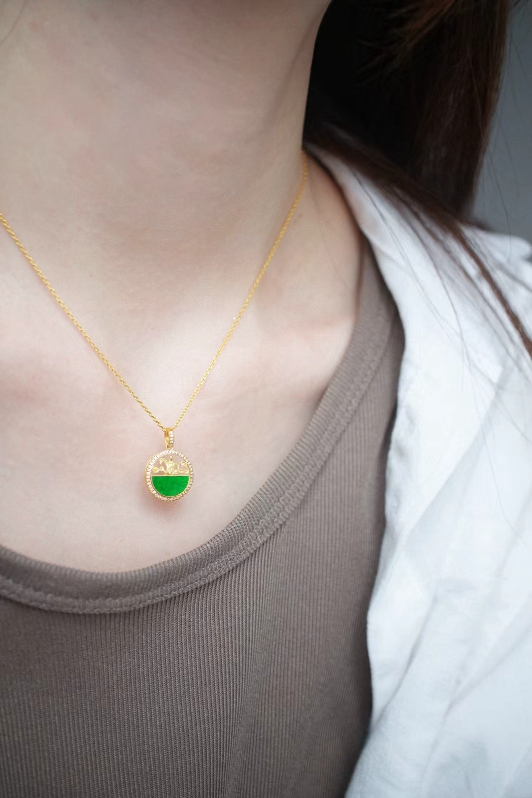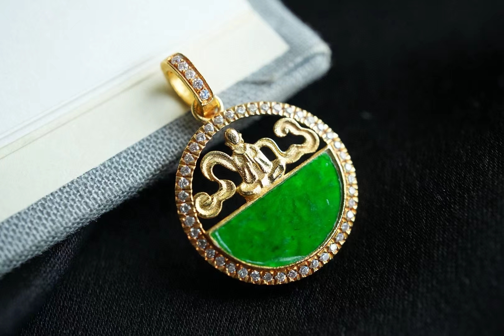禪意美學設計,“無相佛”寓意:佛本無相,關照內在感受,在禪意中尋找自我。天然翡翠A玉,18K金鑽石鑲嵌,配萬能扣,辣陽綠翡翠裸面,萬能扣設計,可任意搭配。