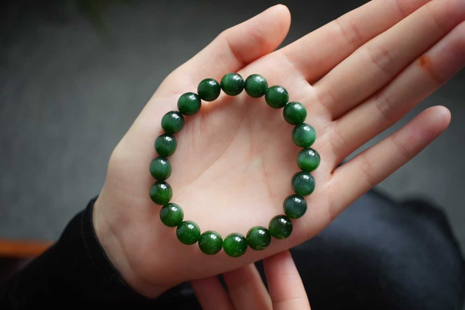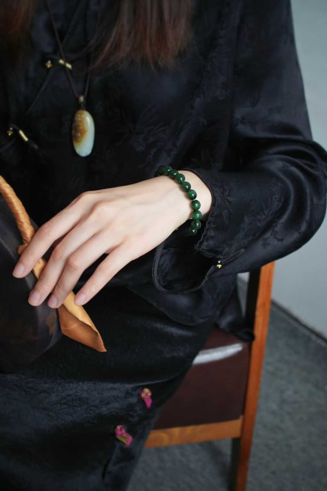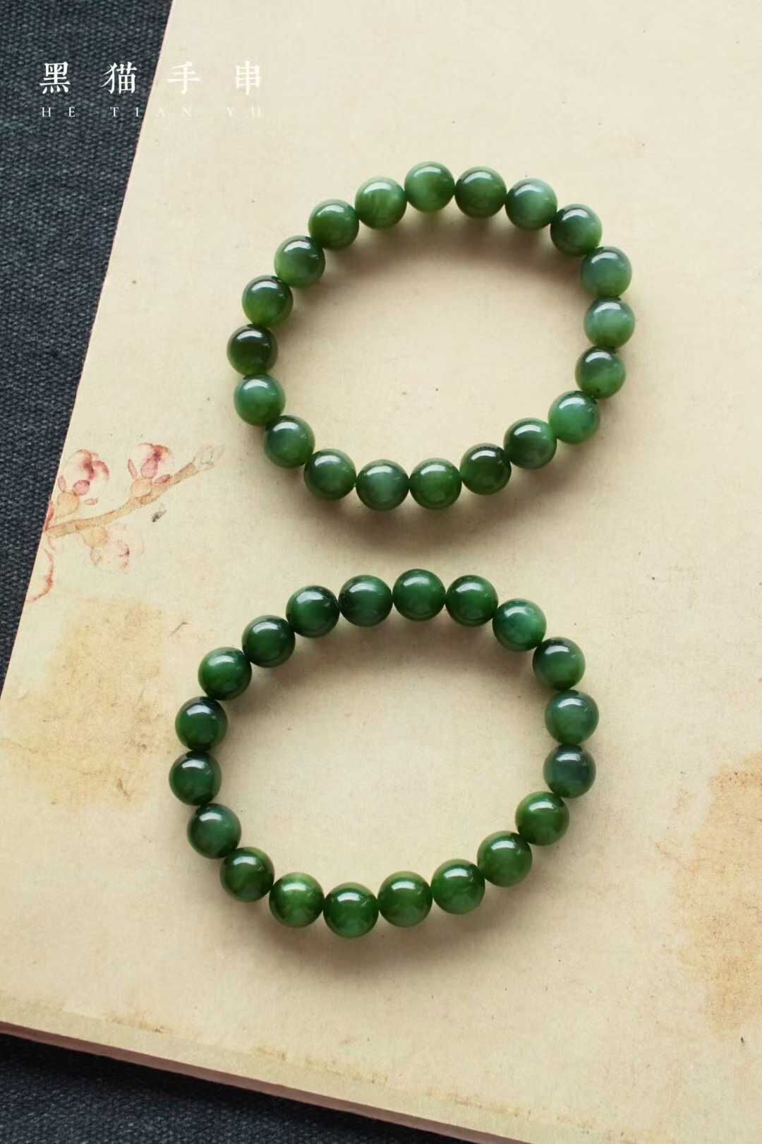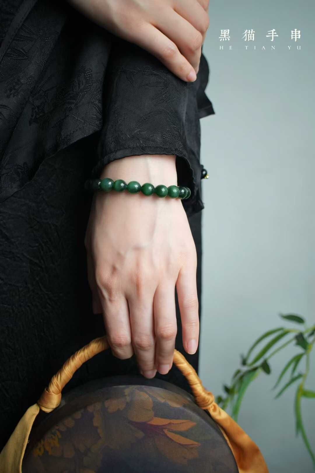 • 和田玉特色黑貓碧玉手串 (9-9.5mm直徑),天然和田玉軟玉