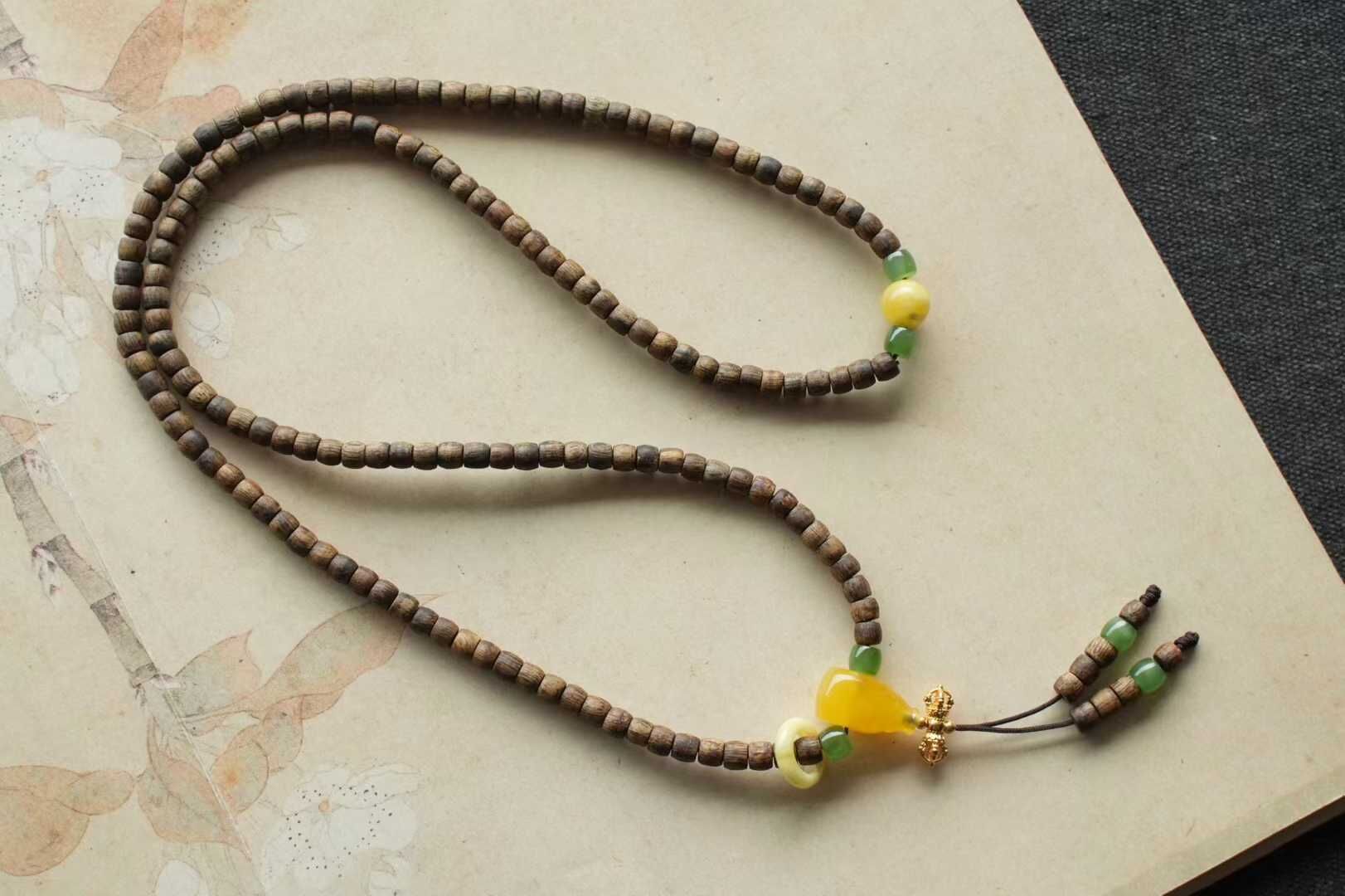 搭配碧玉直切珠、蜜蠟圓珠、蜜蠟三通、蜜蠟跑環,18K金金剛杵,整體設計簡約耐看,古樸文雅,即使是日常通勤也很好搭配,可做項鏈或4圈手鏈佩戴,配飾均為18K金。