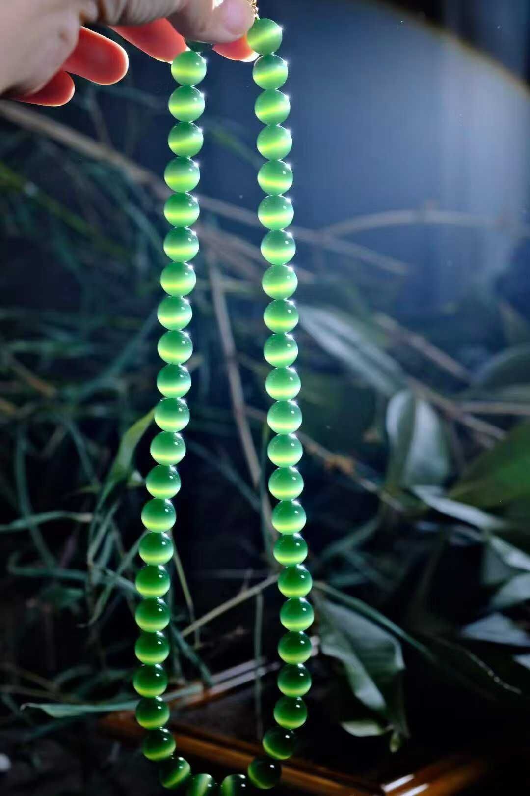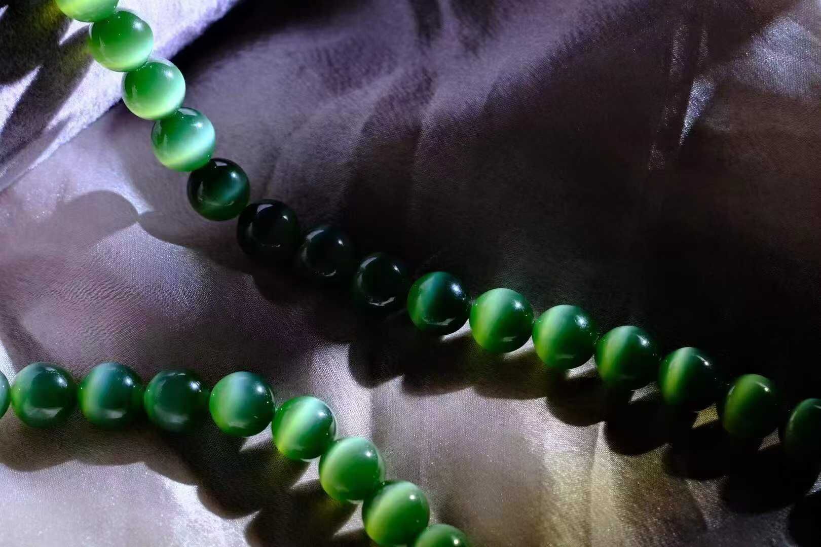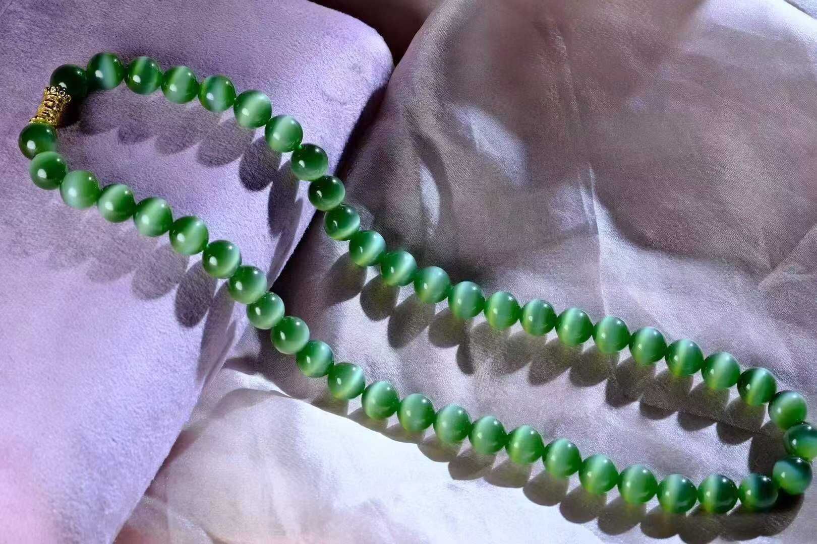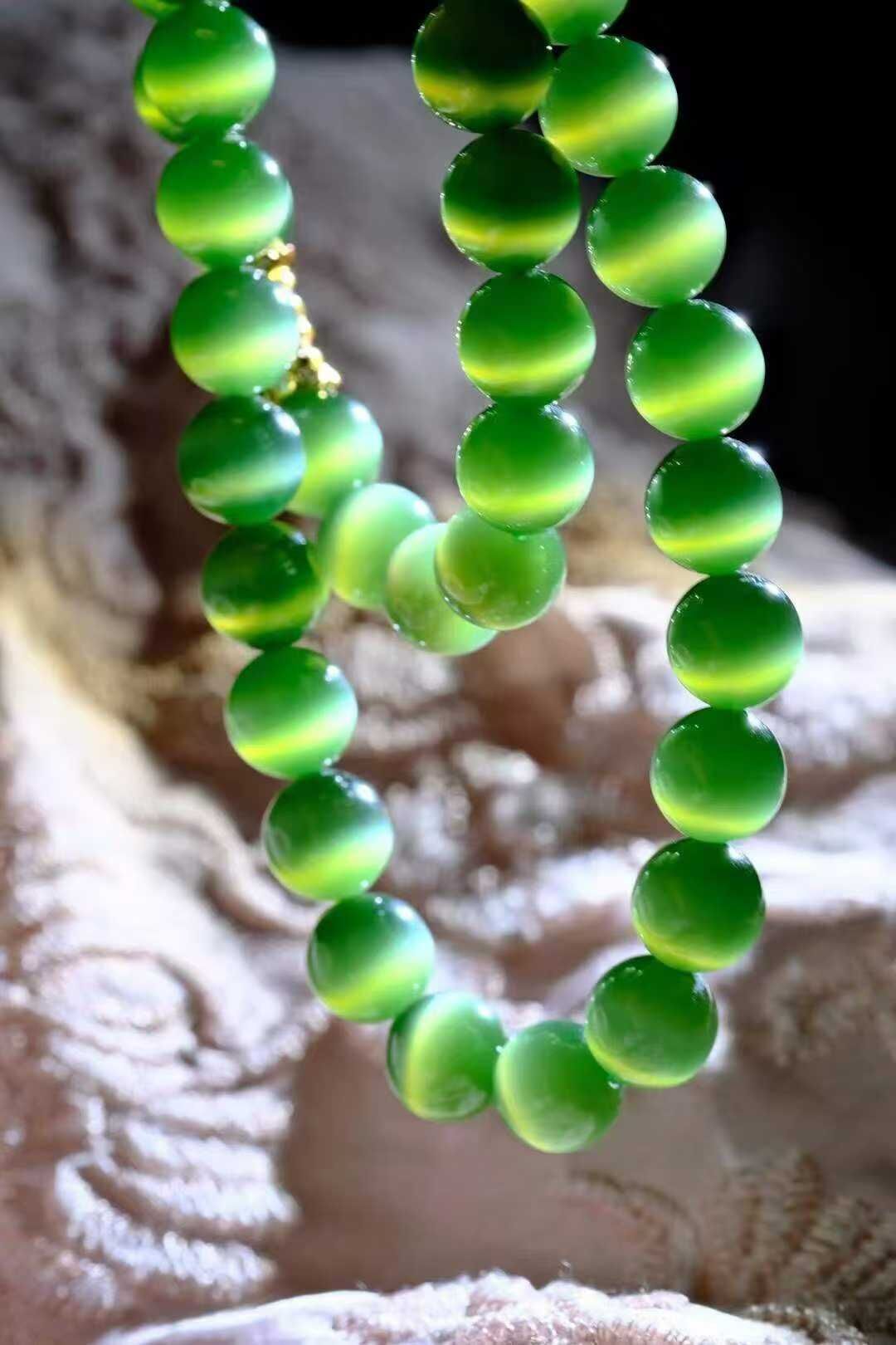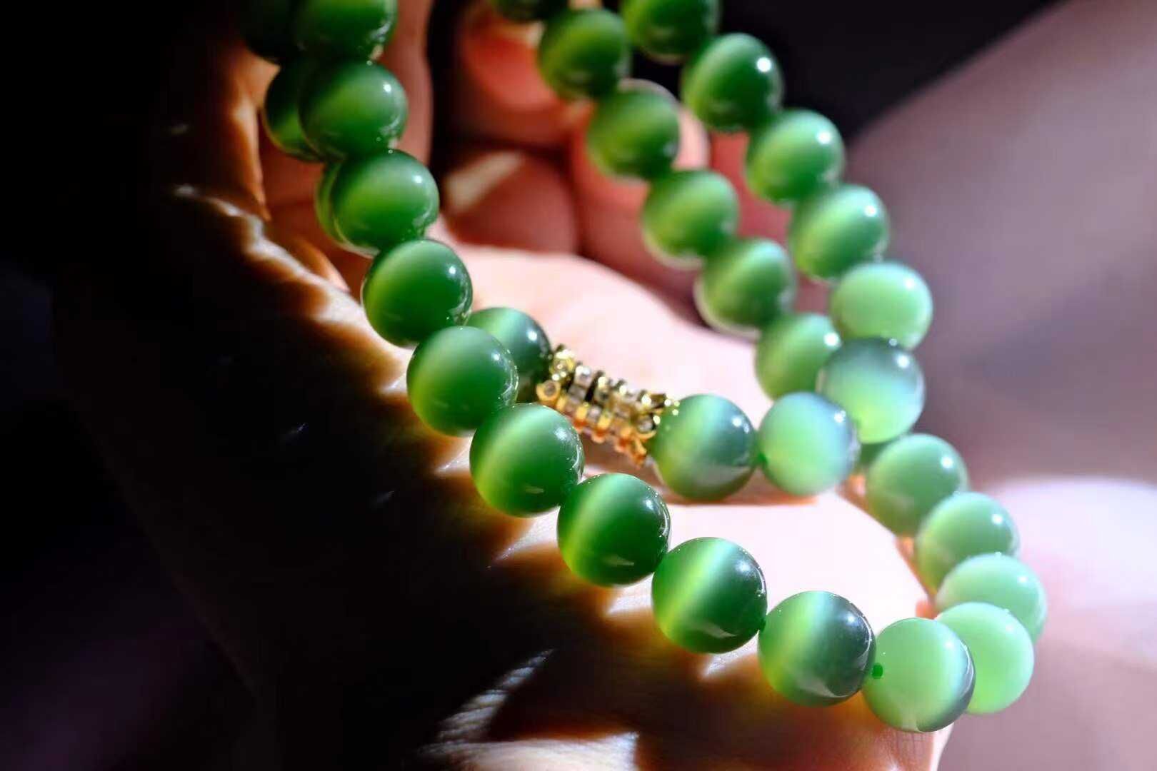 高端碧玉貓眼媽媽鏈 ! 這串低調卻充滿吸引力,讓人過眼就忘不掉的盛世美顏,深邃的綠調、色辣又濃,油潤感、膠糯感、細膩度都很不錯貓眼靈動,光下“跳躍”如精靈,卡10mm的大尺寸,大女主的氣勢祕訣出場即驚艷,氣場全開!