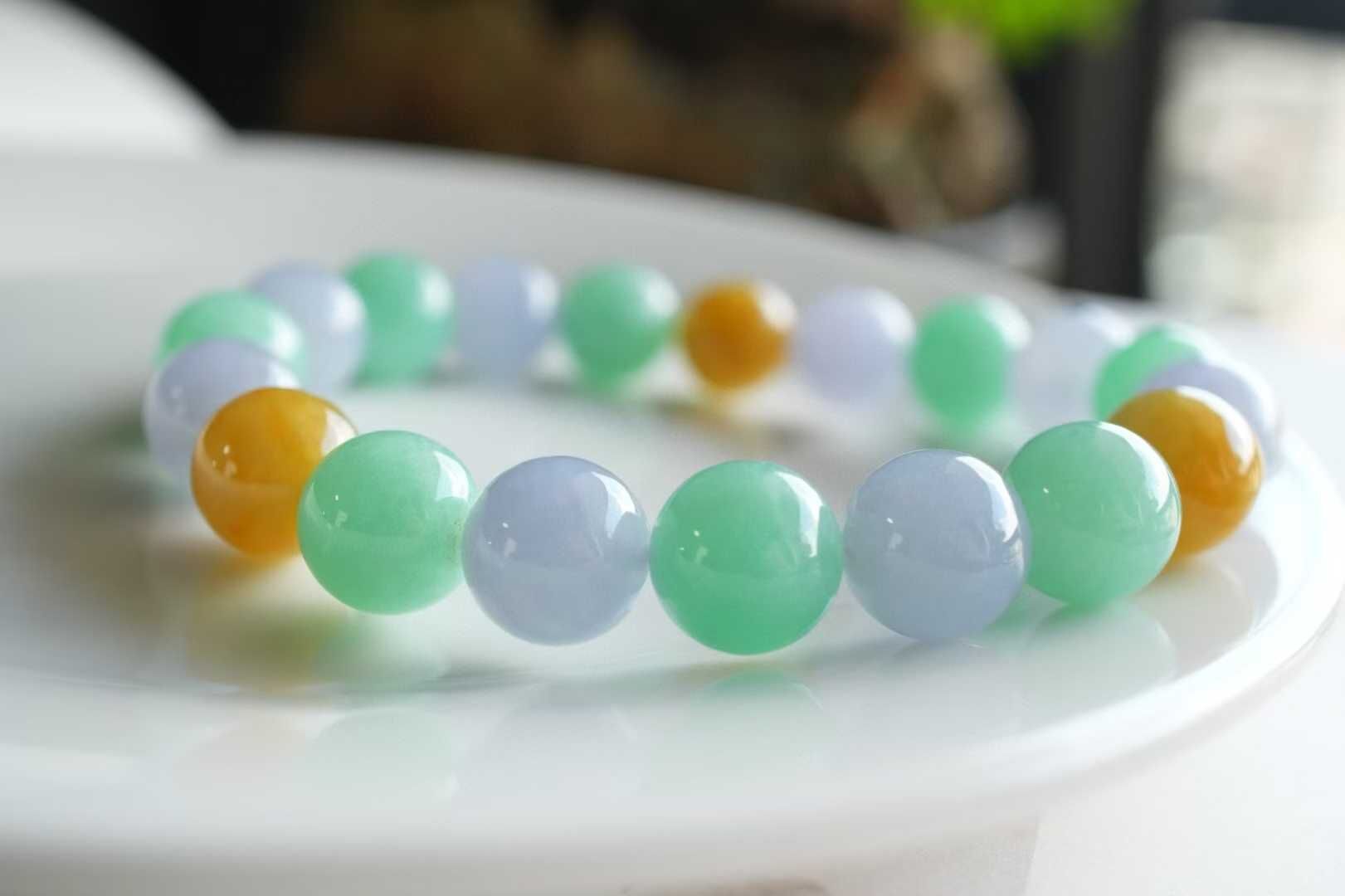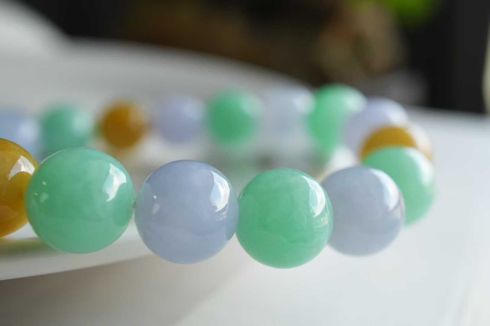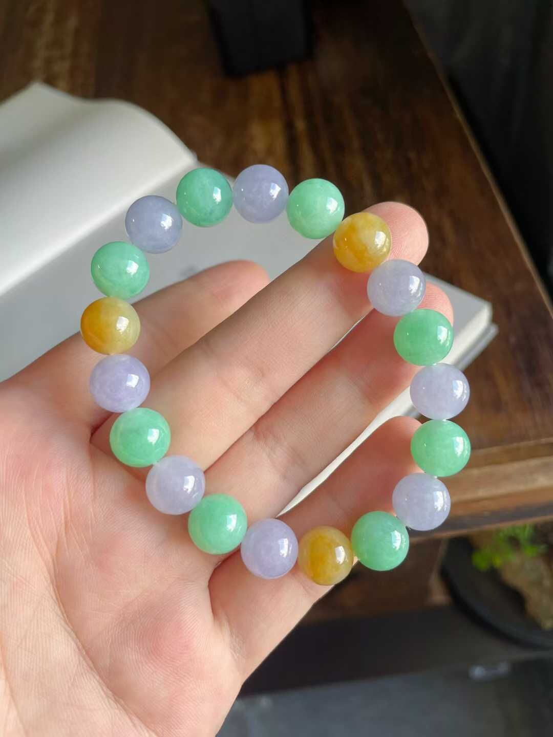 稀有大串串,太喜歡這條了。天然翡翠A玉,翡翠中最稀缺的三原色:紫、黃、綠都有了,這個配色也有“福祿壽”的寓意,我們精選冰紫羅蘭+果陽綠+冰黃翡,種水色兼備,色彩豐富明艷,上手好吸睛!