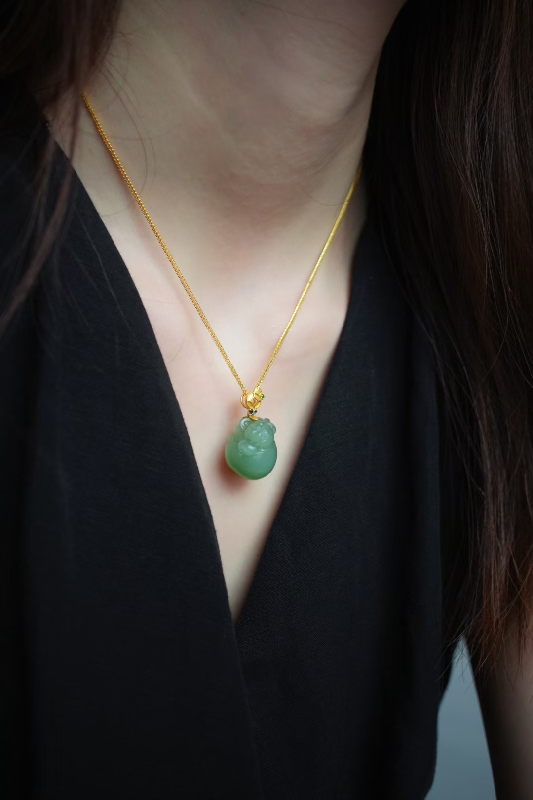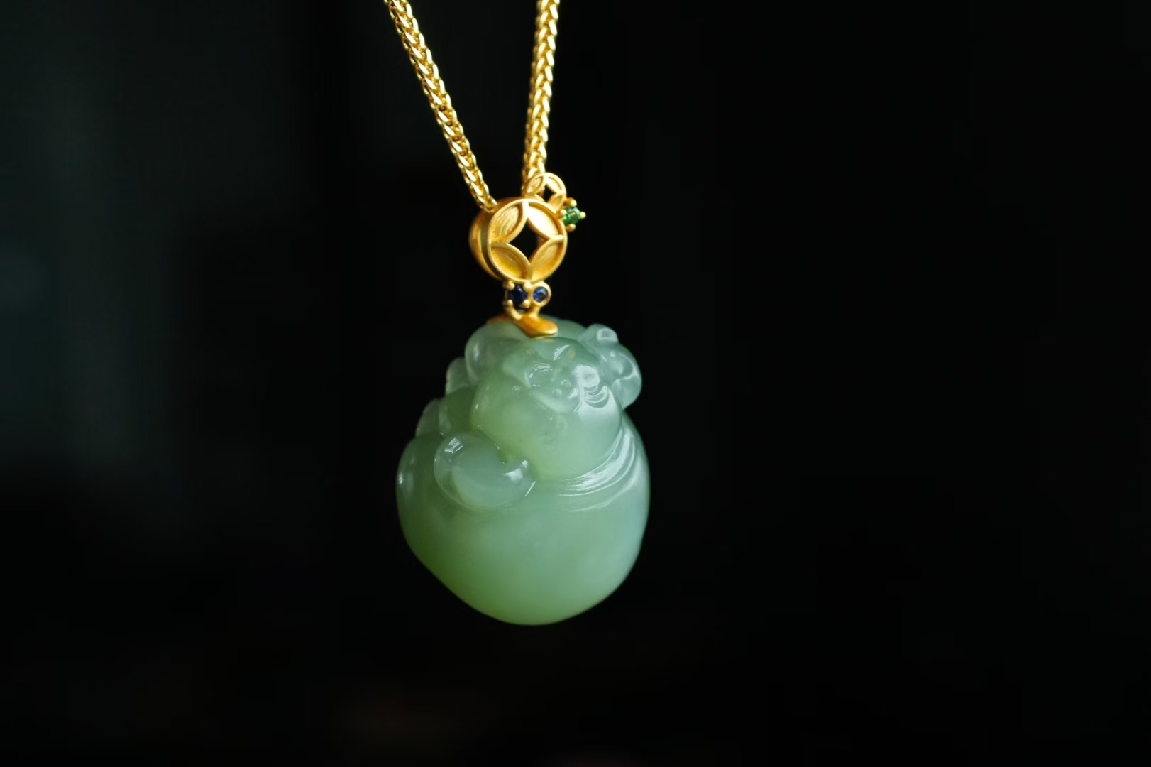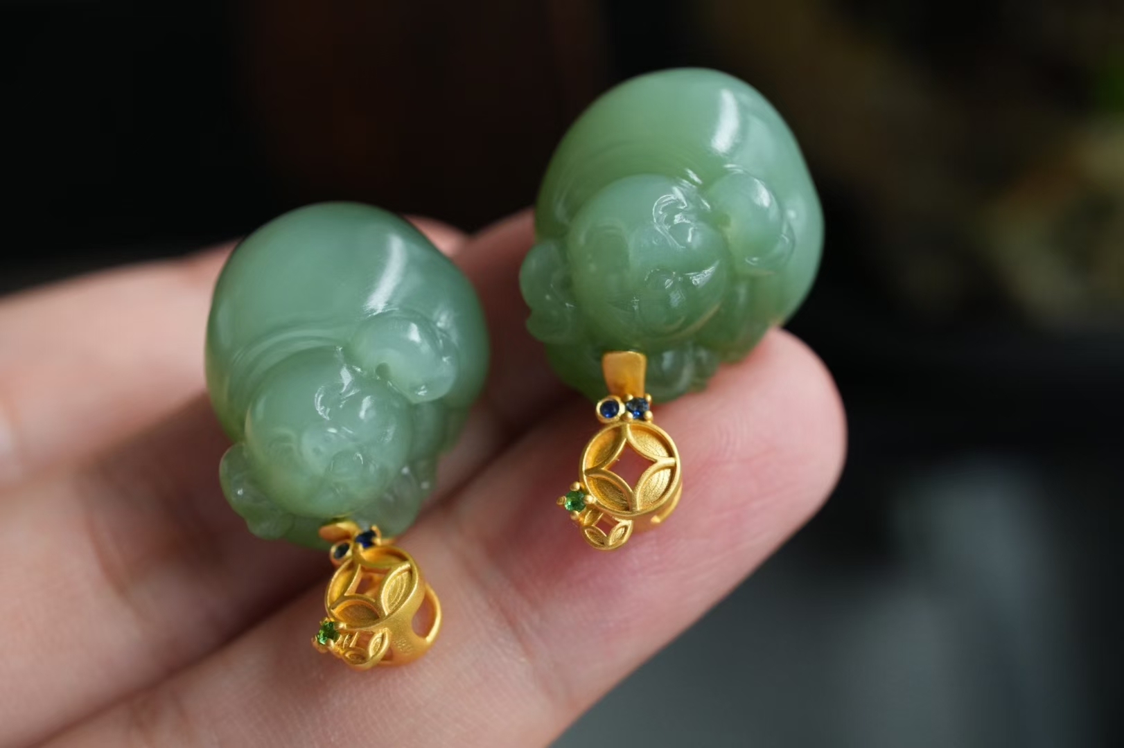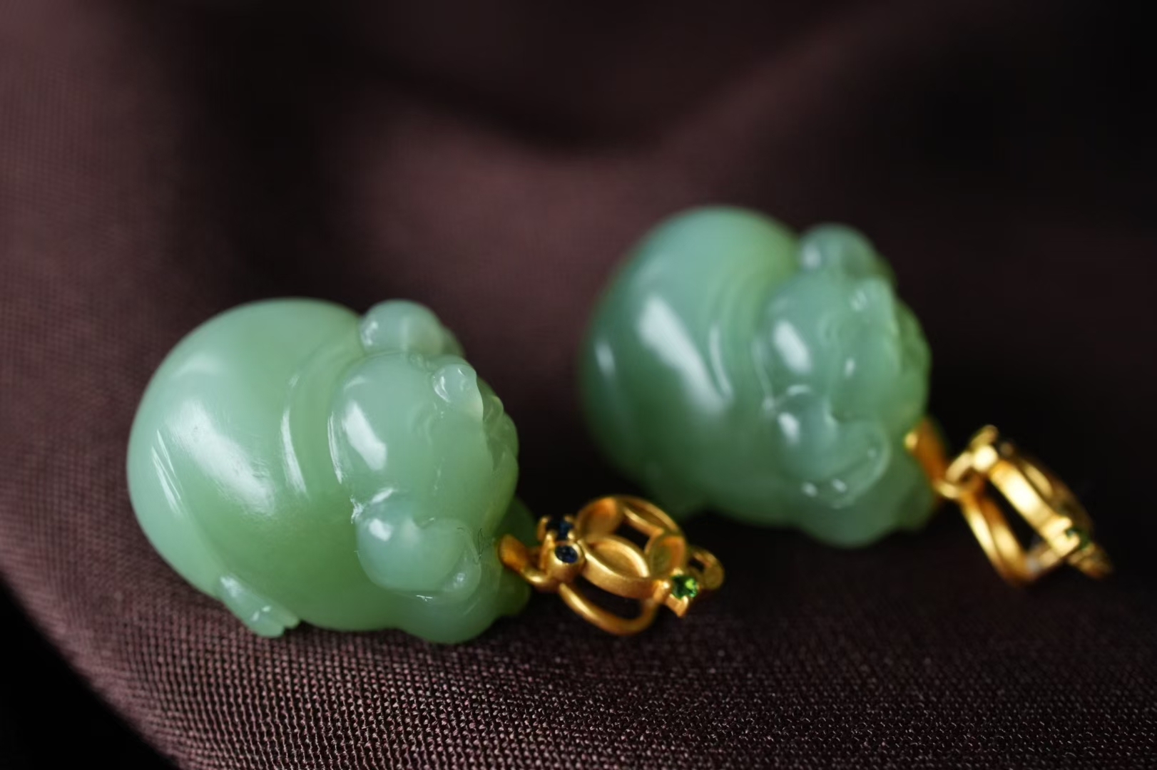 兩隻可愛的小居居,和田玉碧玉稀有冰底粉青,顏色清雅,帶微微貓眼效應,底子又細又油潤,小豬肥嘟嘟,圓潤潤,過燈純淨,無棉無水線,無雜裂完美品相,完美度極高的小精品。
